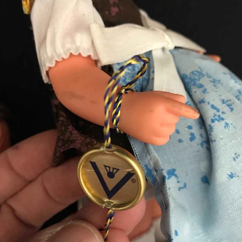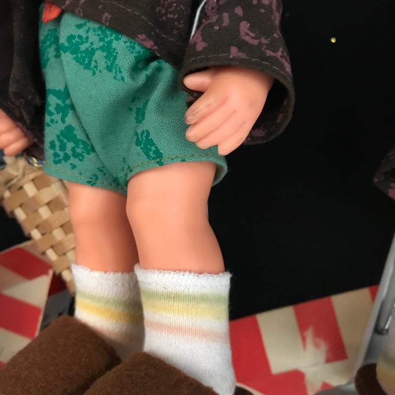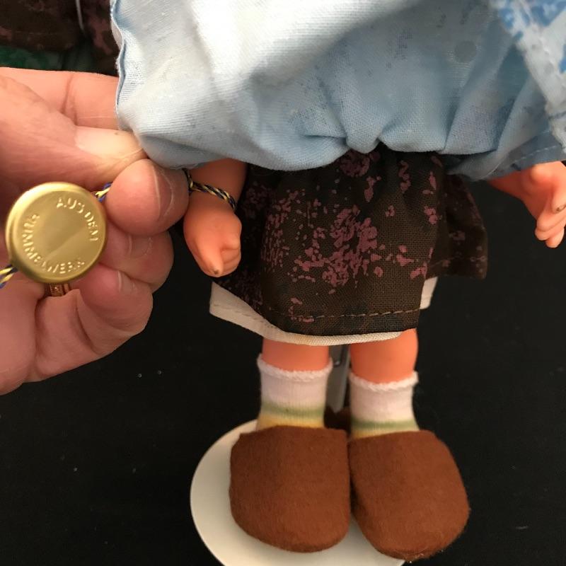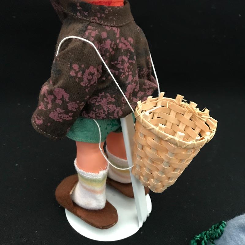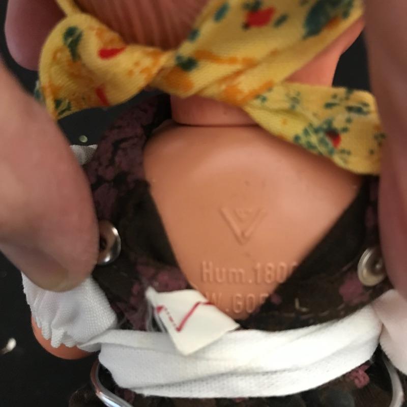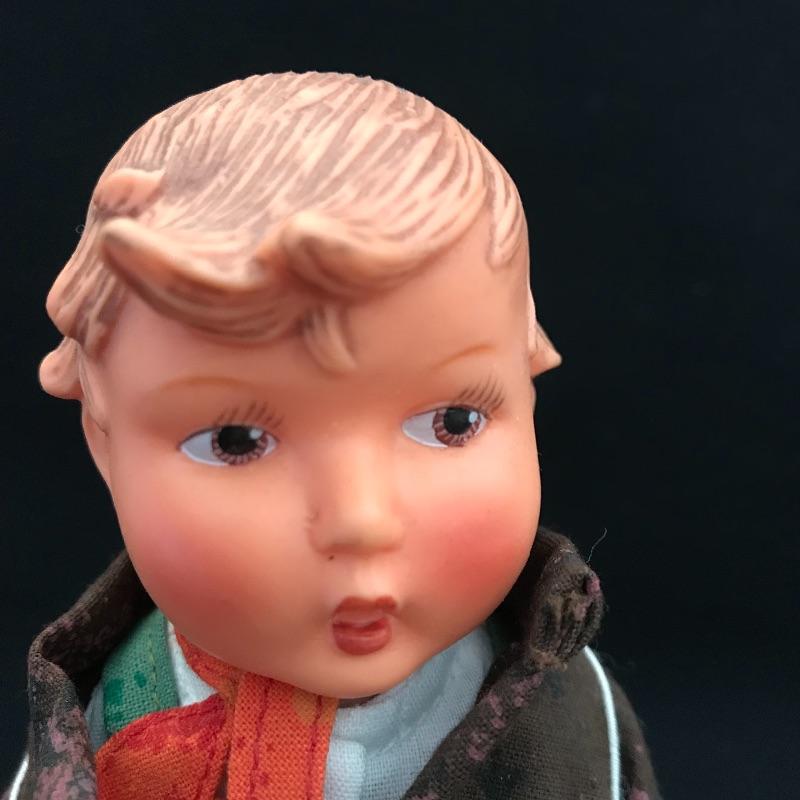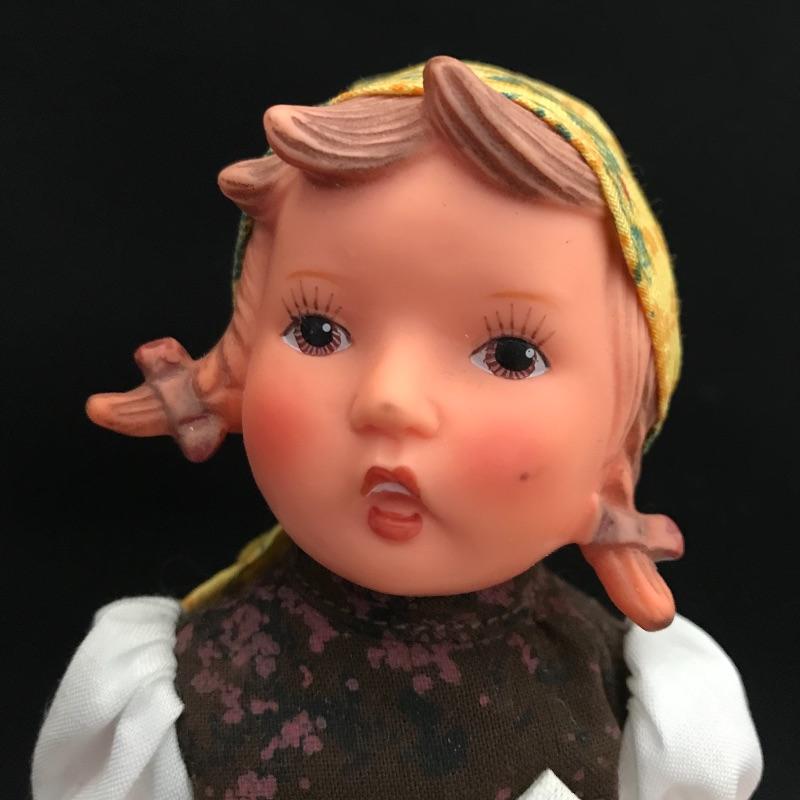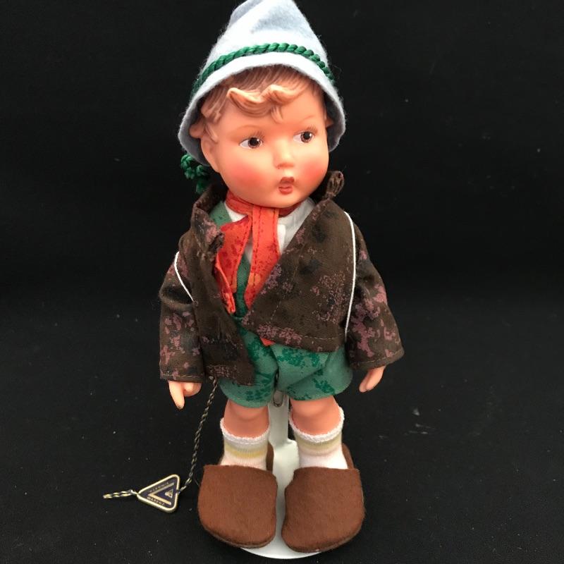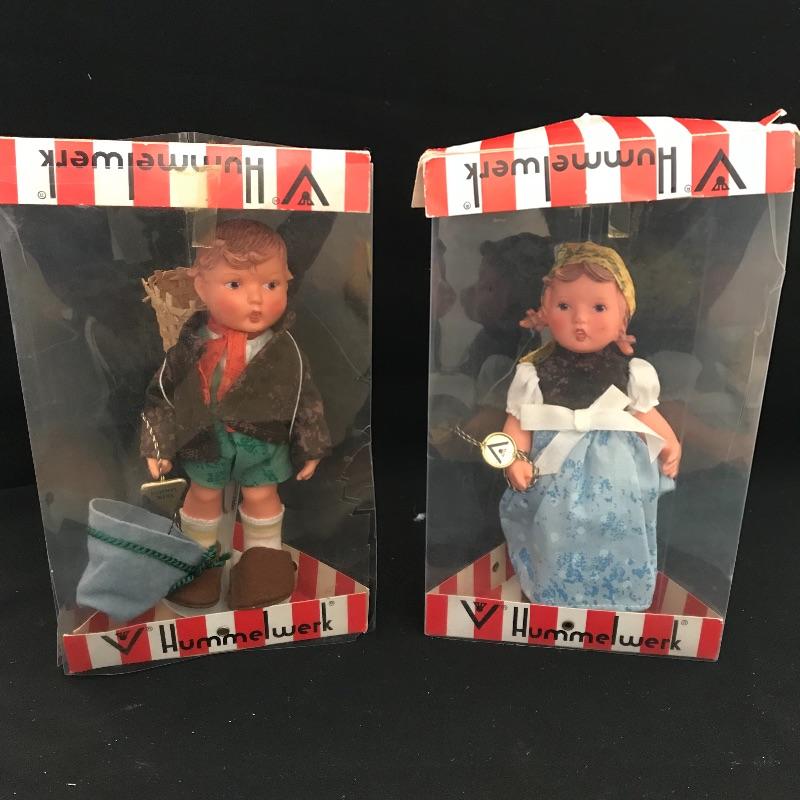 Resembling Hansel and Gretel, two 9” Hummel dolls appear to be rubber vinyl and in great shape, assuming they’re from the mid century. Some blemishes on the hands are noted in photos. Complete with newer stands and worn boxes. The boxes show numbers 00056 and 00057. No certificates found with the Hummels. See photos. Shipping available.