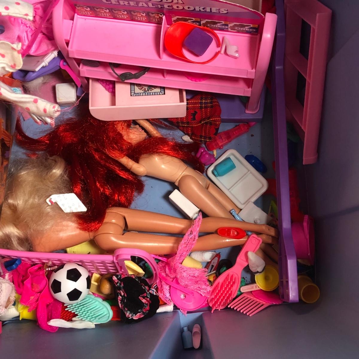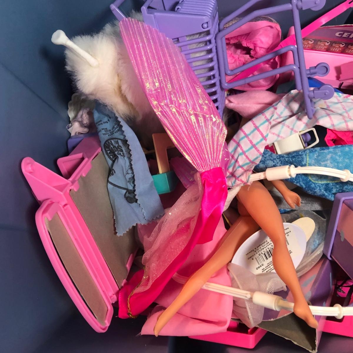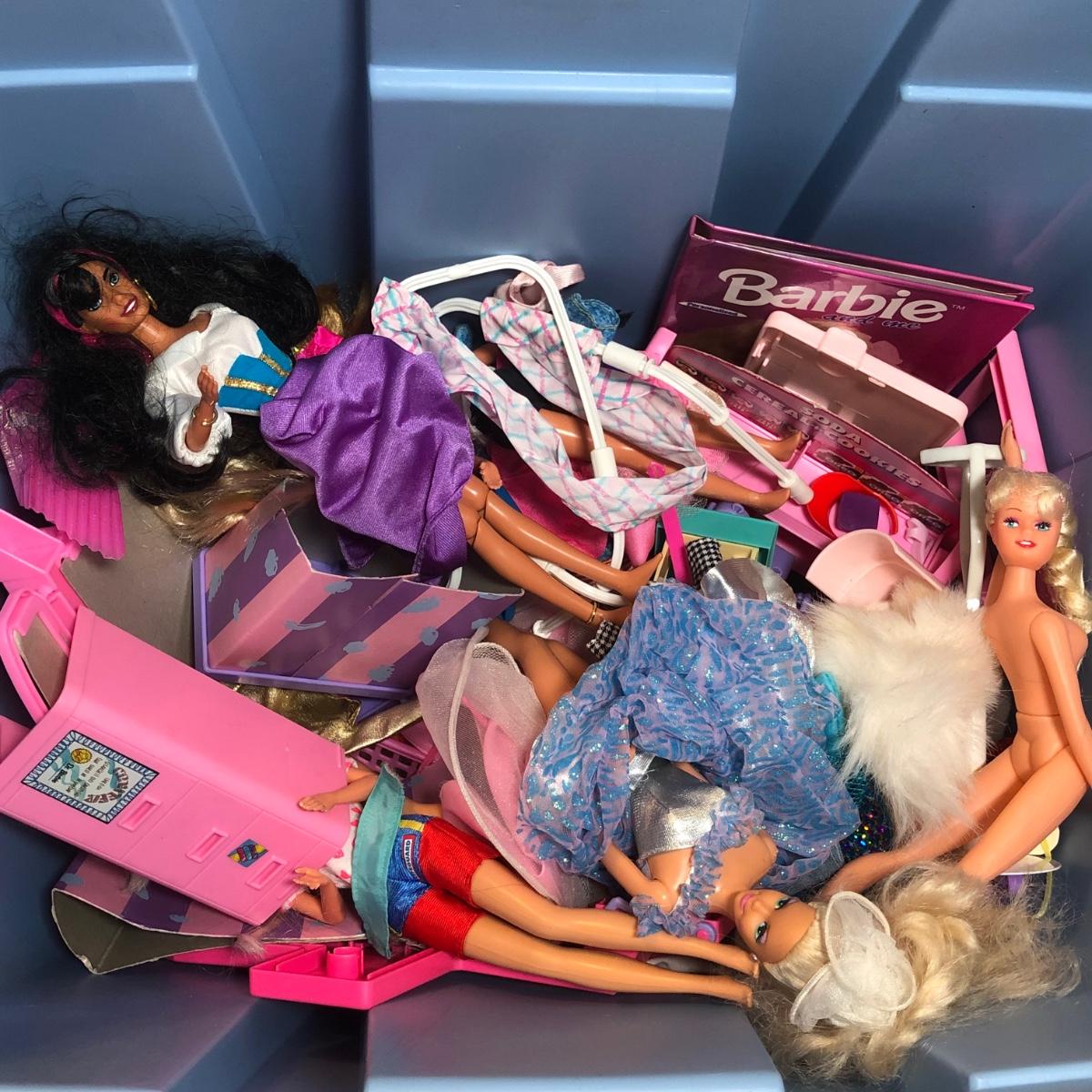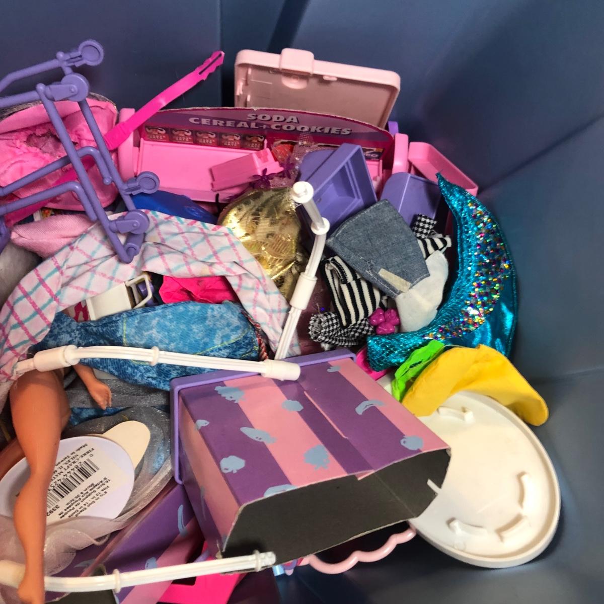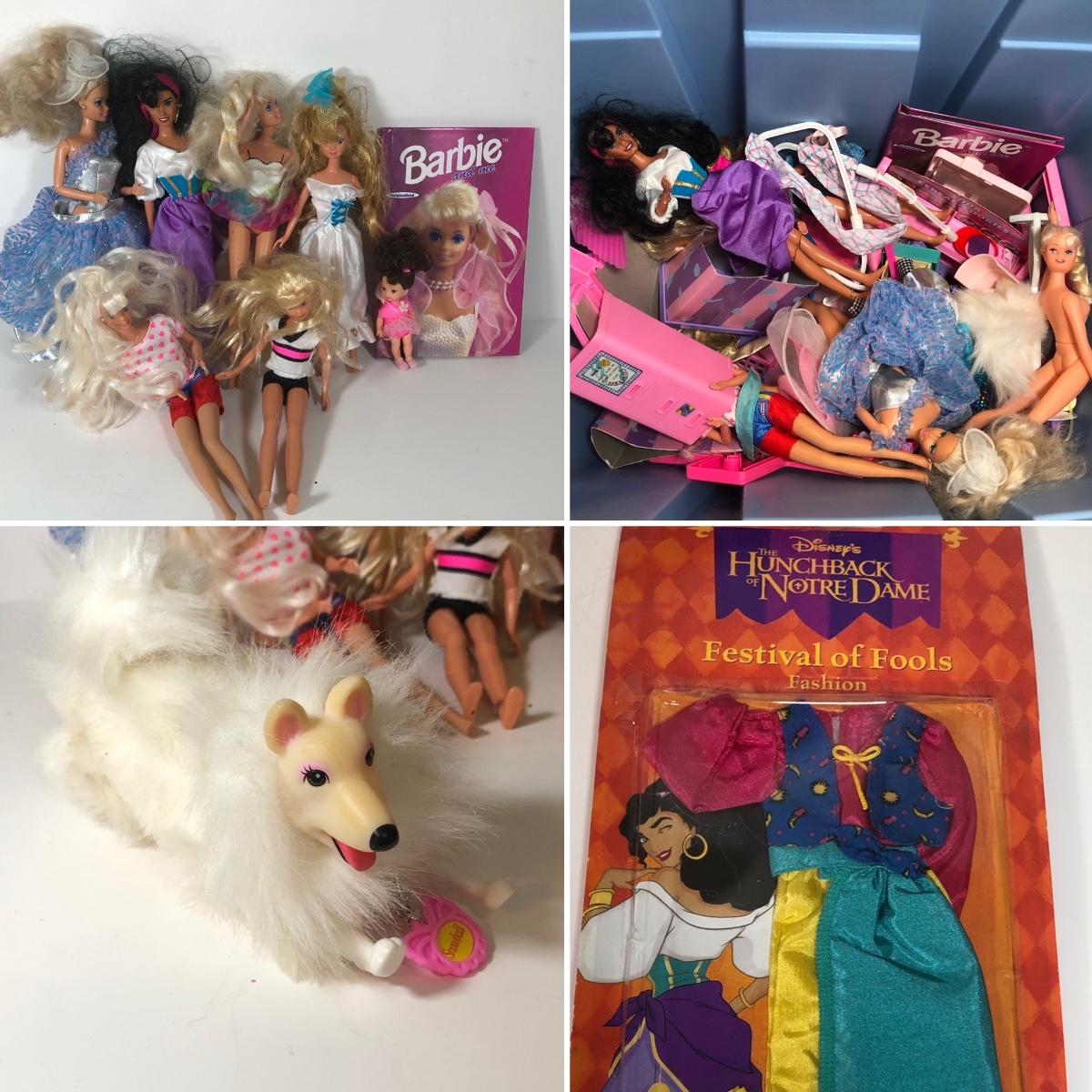 LOT 283L: Bin of Barbies, Accessories, Clothing & More - includes Articulated Esmerelda Doll