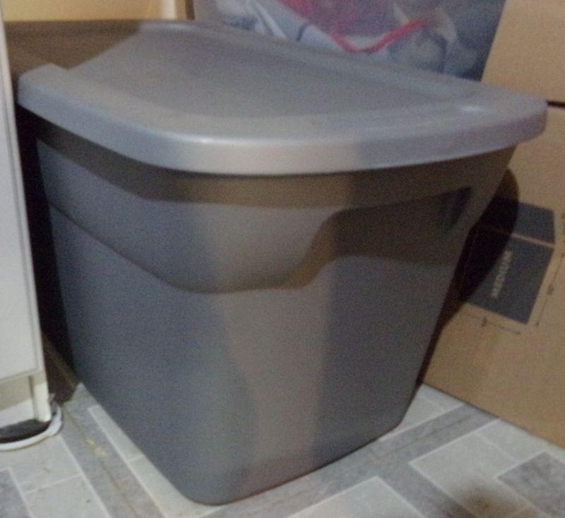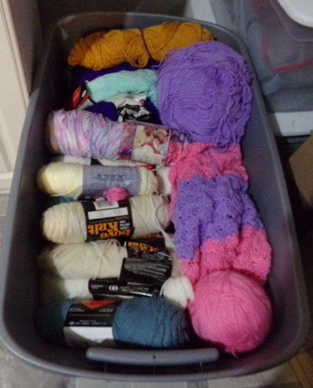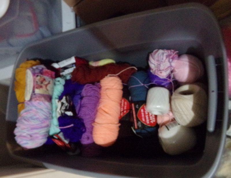 LARGE STORAGE TOTE FULL OF VARIOUS COLORS OF YARN