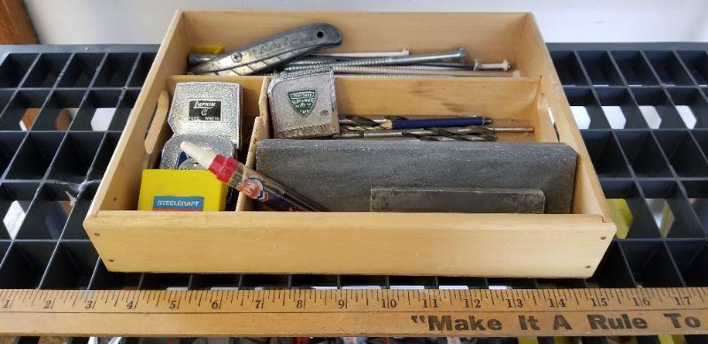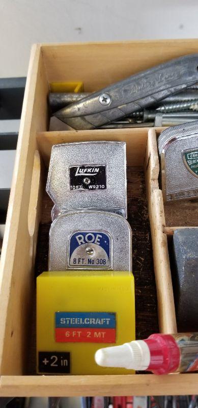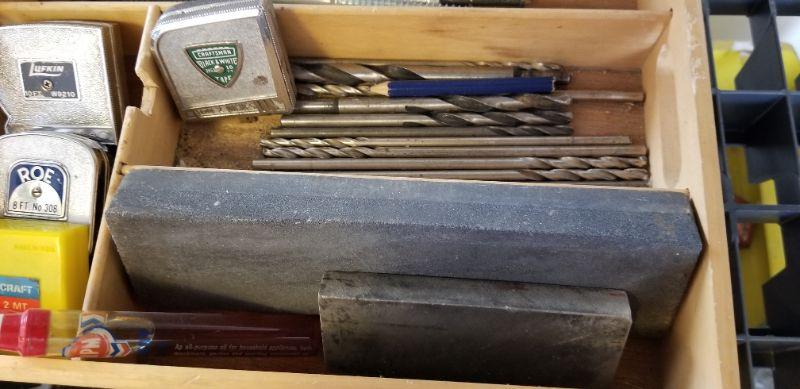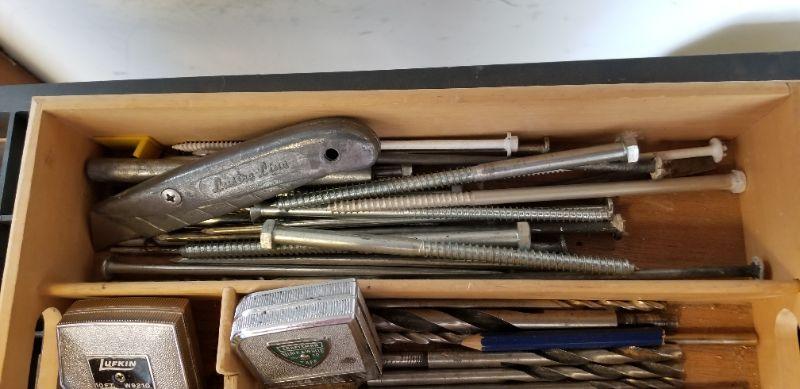 LOT #284: Tray of Measuring Tapes, Drill Bits, Large Bolt Screws and More
