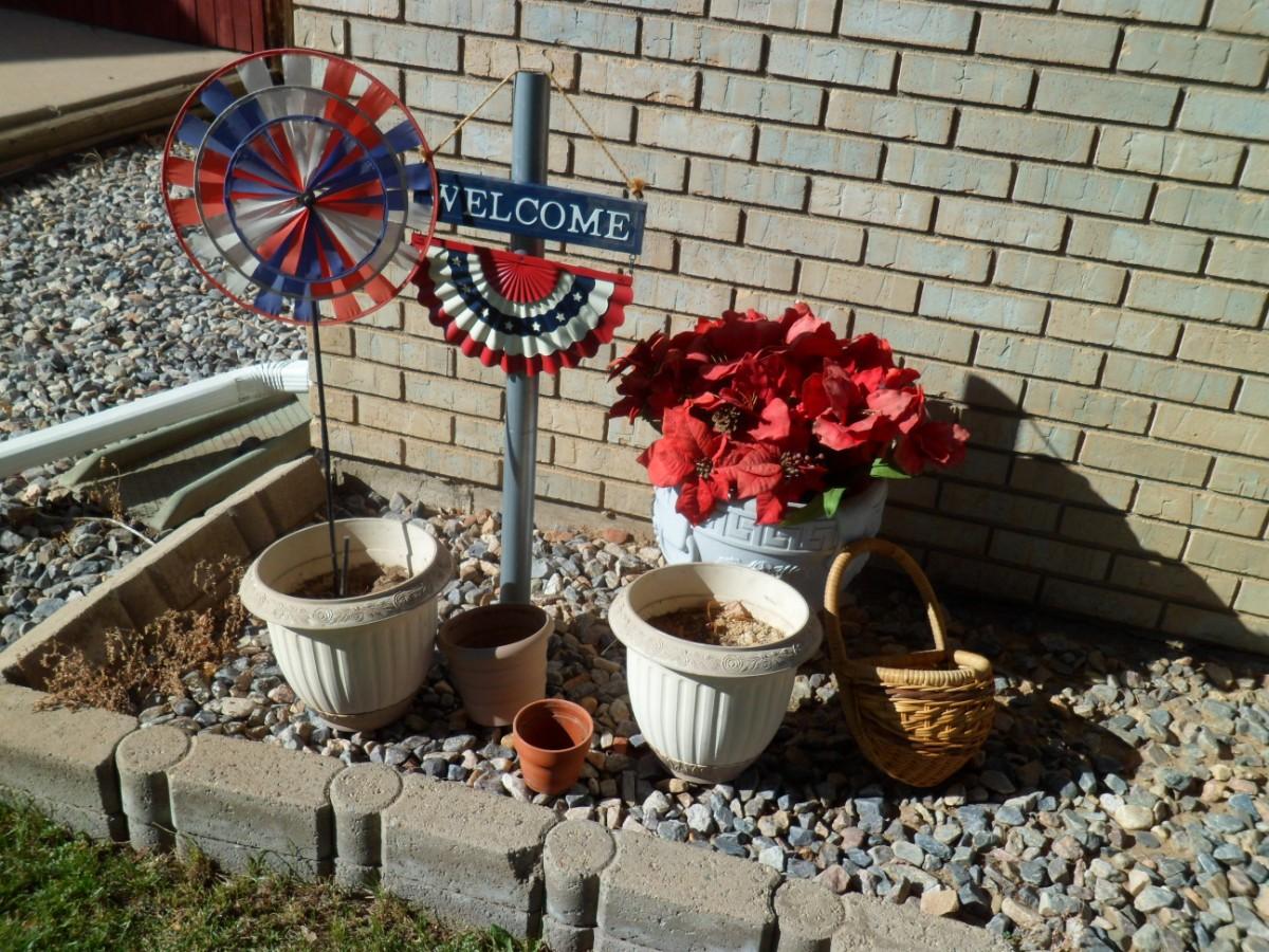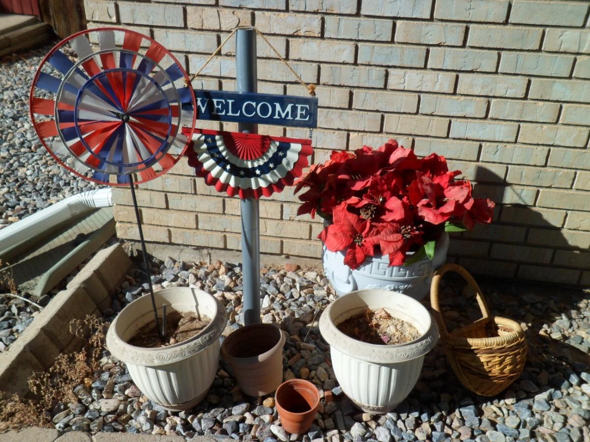LOT 284 FESTIVE AMERICAN YARD ART, WELCOME SIGN,  AND FLOWER POTS