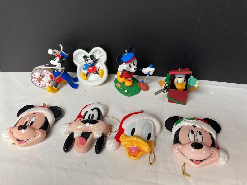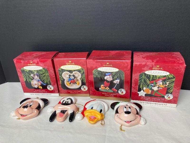 Hallmark Keepsake “Bandleader Mickey” “Mickey’s Snow Angel” “Mickey’s Long Shot” and “Donald’s Surprising Gift” ornaments. Mickey & Co. porcelain Mickey Mouse, Minnie Mouse, Donald Duck and Goofy ornaments