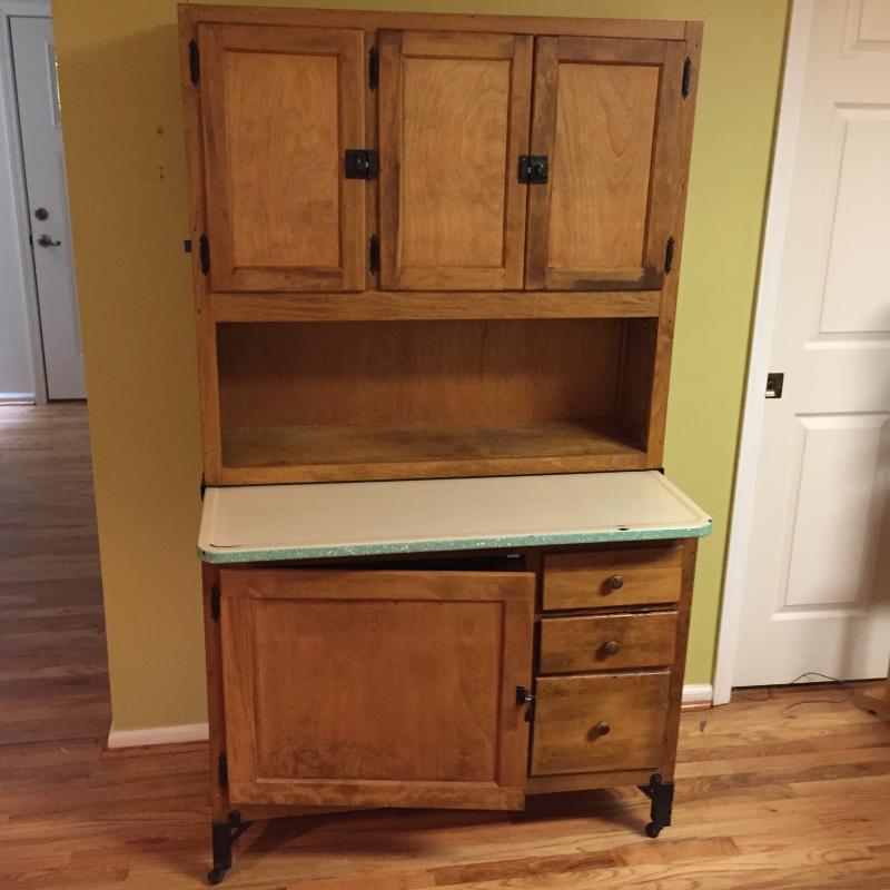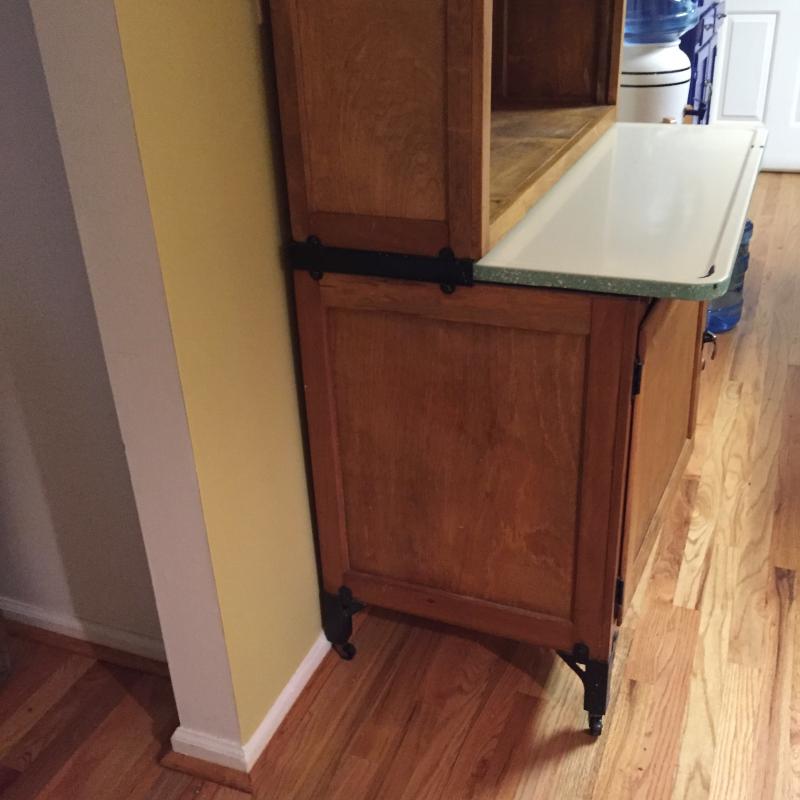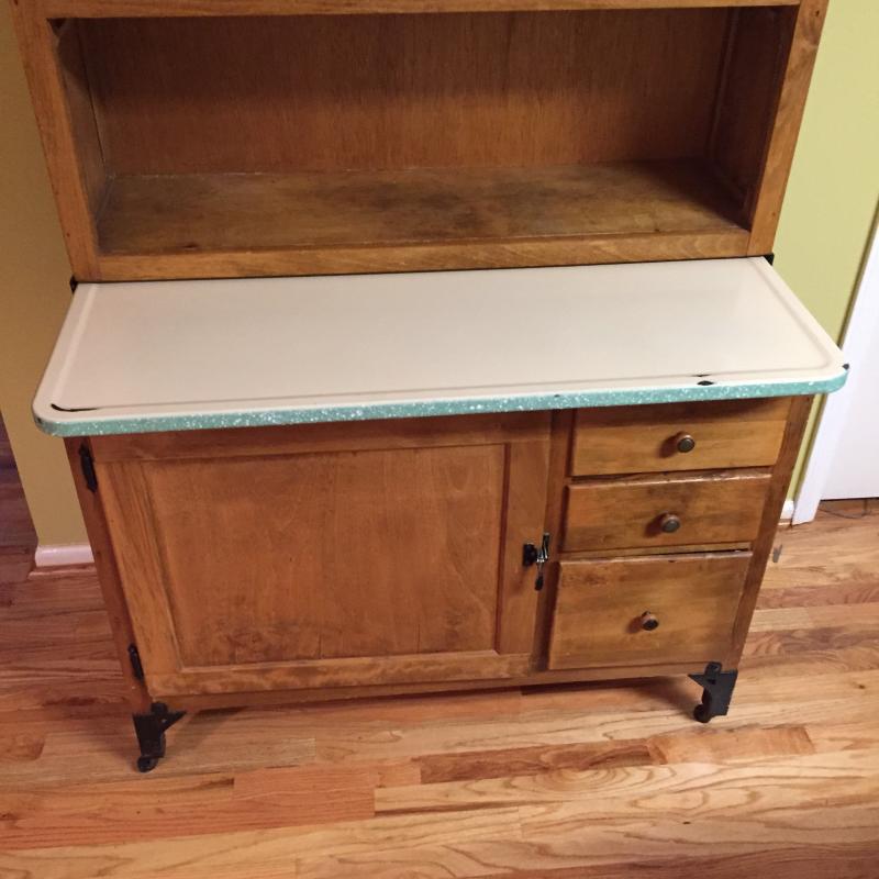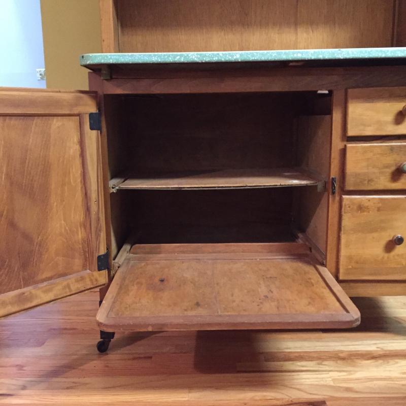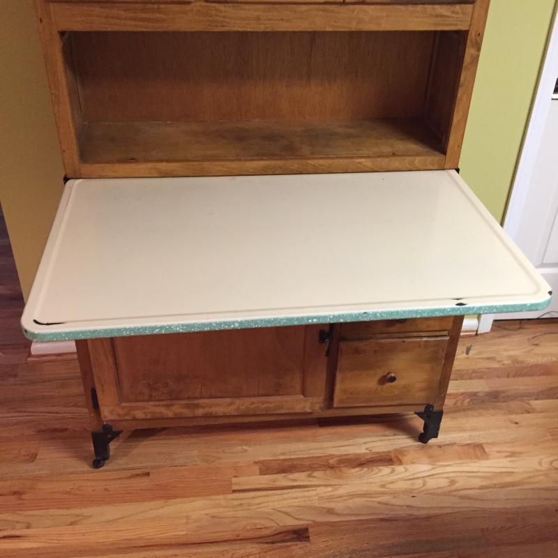 Lovely Hoosier Cabinet with Sliding Enamel Coated Pull Out Shelf. Bottom Cabinet Door will not Stay Latched. Cabinet is on casters. Cabinet Measures 70” Tall and 35.5” Deep. With Shelf Fully Extended Cabinet Measures 40” Wide. Local Pickup Only