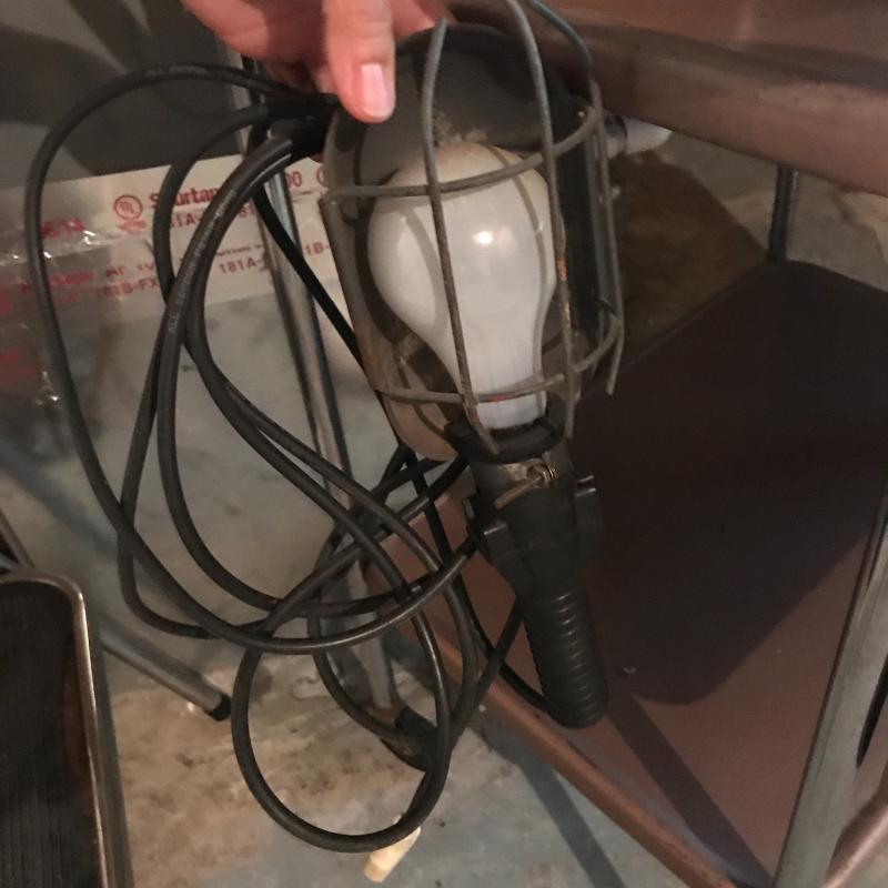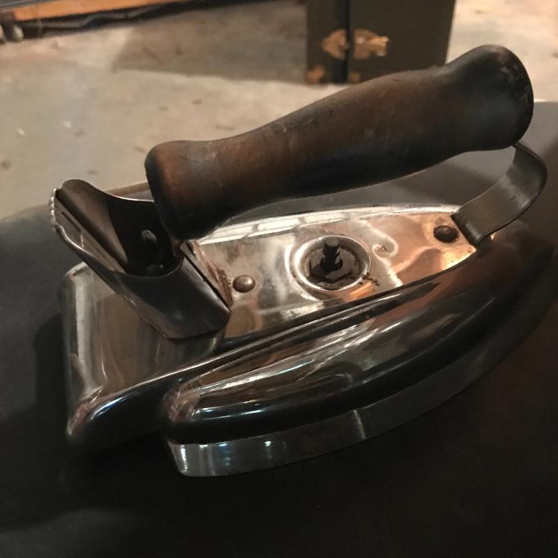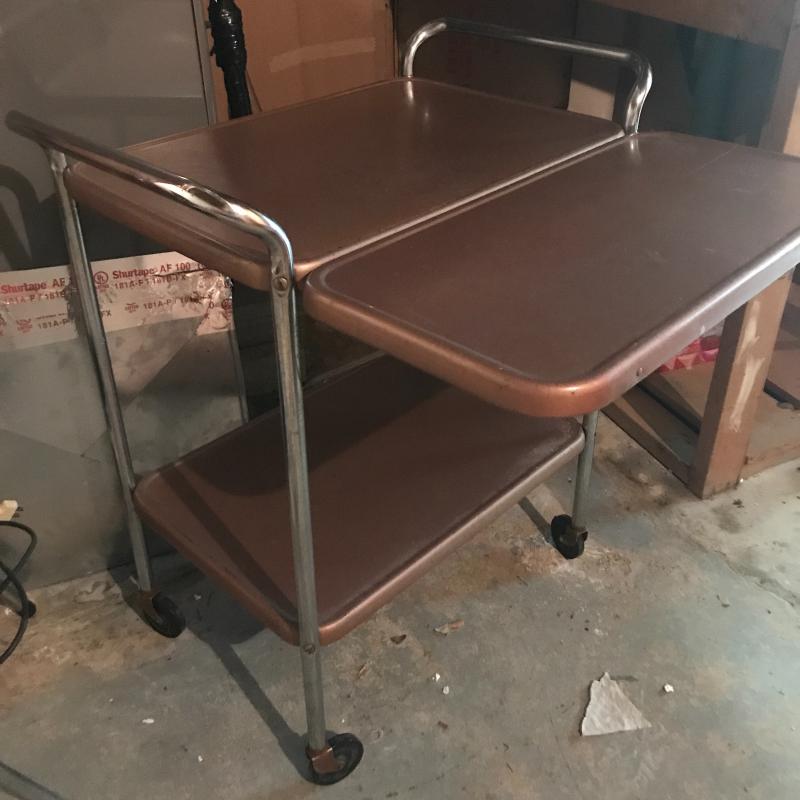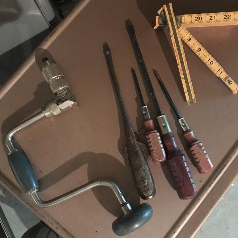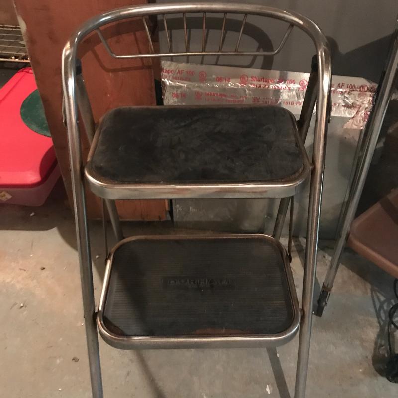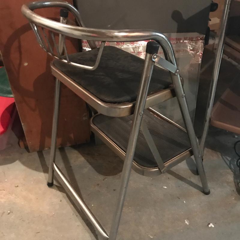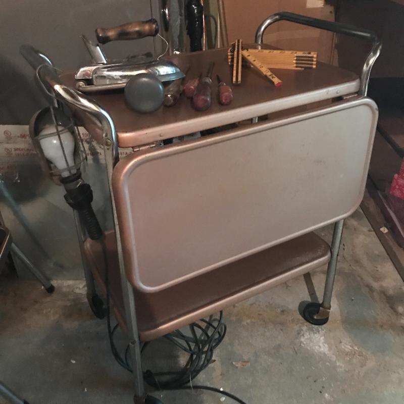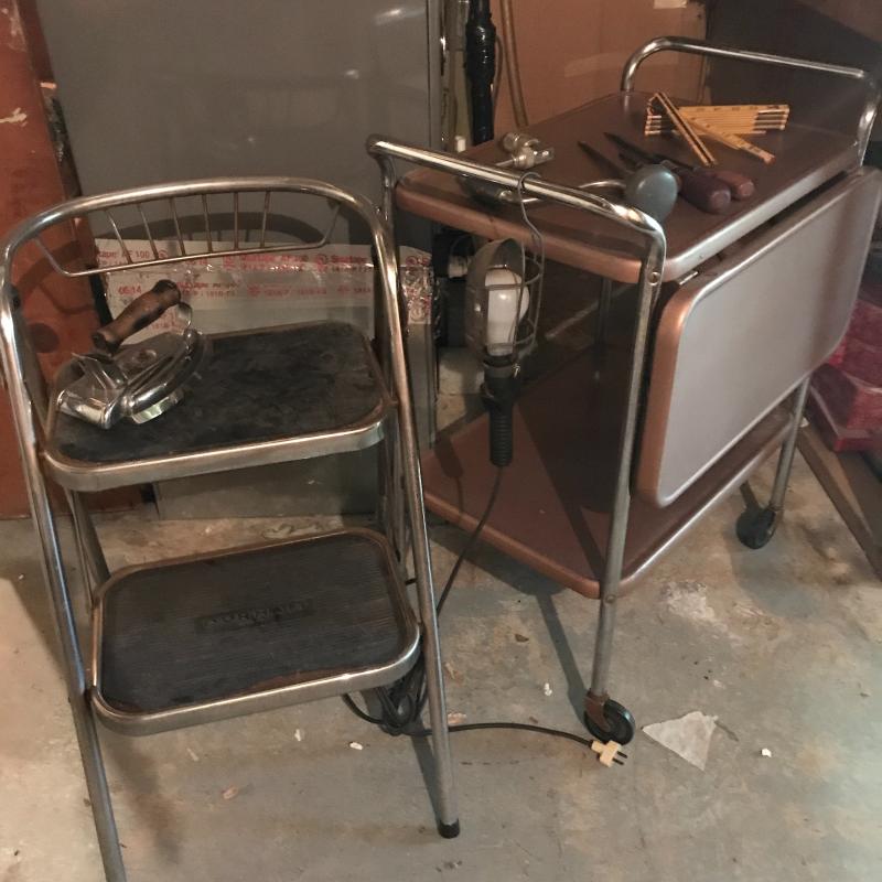 Great rolling metal cart with adjustable side. Great condition. Also includes step stool with vinyl steps and curved back. Don’t forget the vintage tools in this lot that include an iron, hanging light, folding ruler and more. See photos. No shipping. Local pick up only.