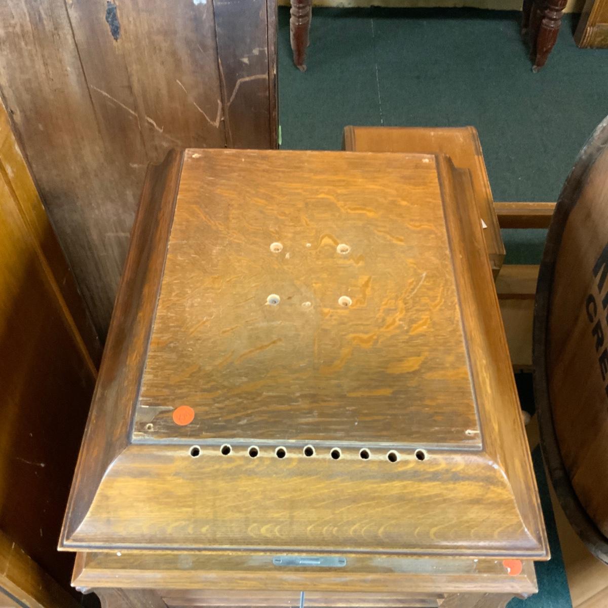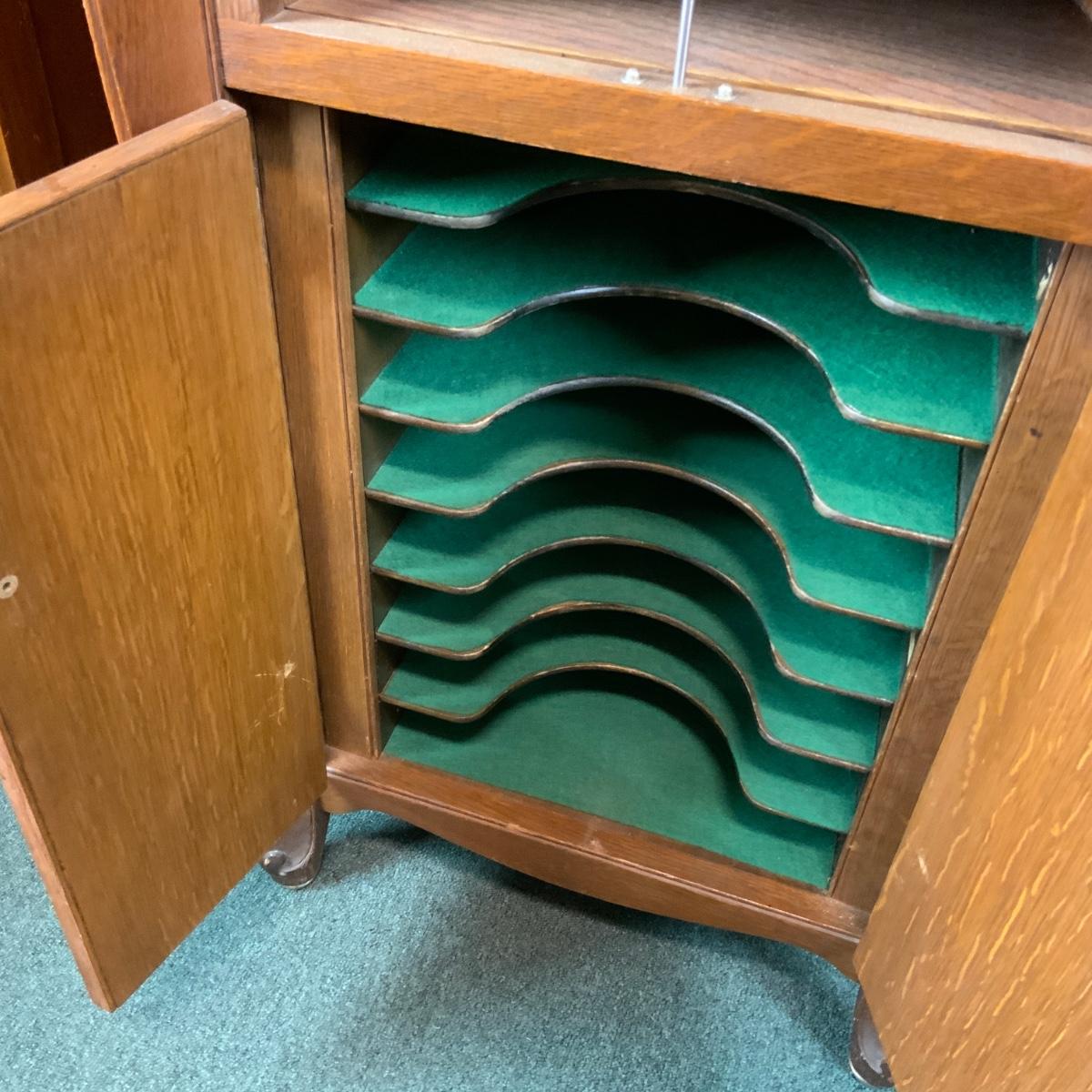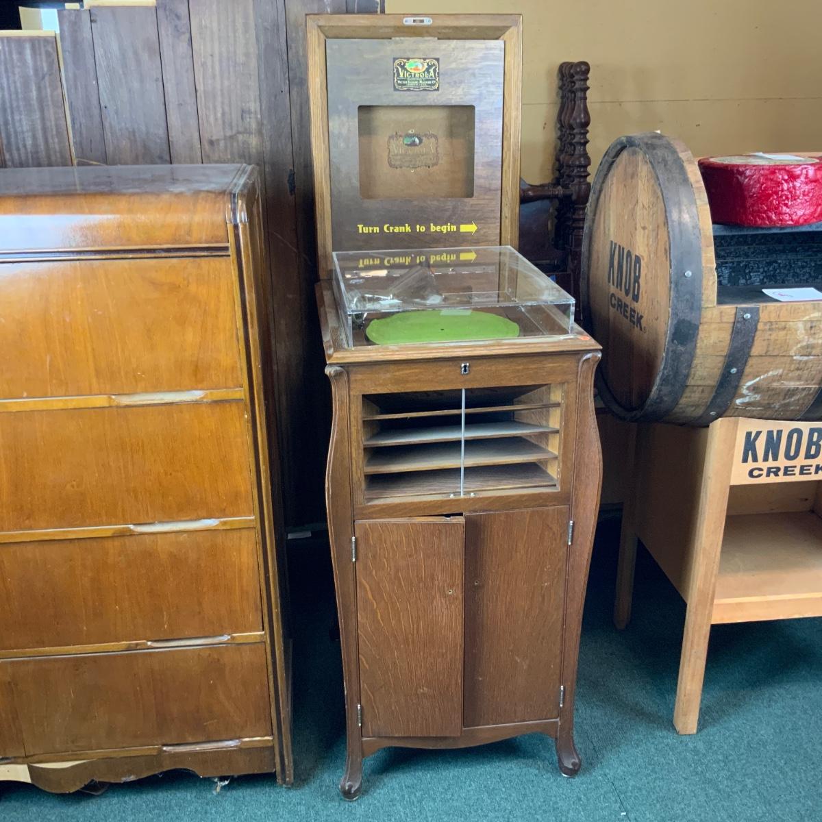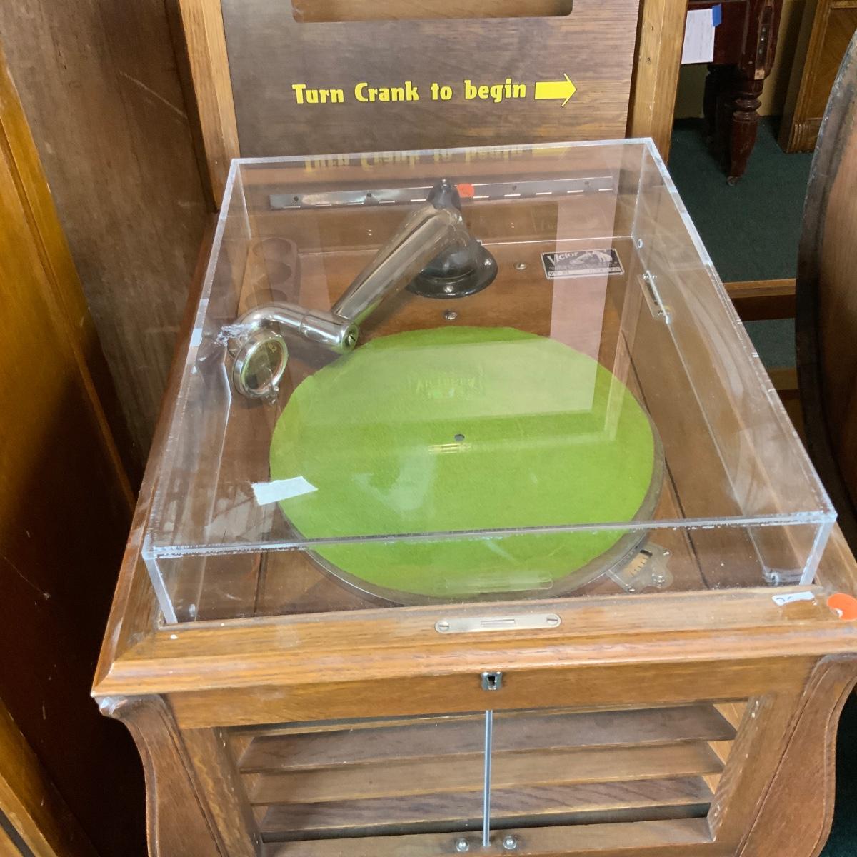 Oak Victor Victoria Store Display. Unique piece with plexiglass protector. Would be excellent in a music store or room as a teaching piece. //::\\ Please see photos for details and condition. No attempt has been made to hide any imperfections. All items listed in this auction are warehouse items, and need to be cleaned. A majority of the items need restoration as well. All items are sold AS IS and WITHOUT GUARANTEE. If you are uncertain about an item, DO NOT BID. Due to the nature of this online auction in-person inspection is HIGHLY recommended. All Sales are FINAL. Pick Up Times are FIRM. Please confirm with your own schedule that you can pick up in the scheduled times listed in the Terms and Conditions. Any questions please message the auctioneer. DO NOT Contact The Harp Gallery.