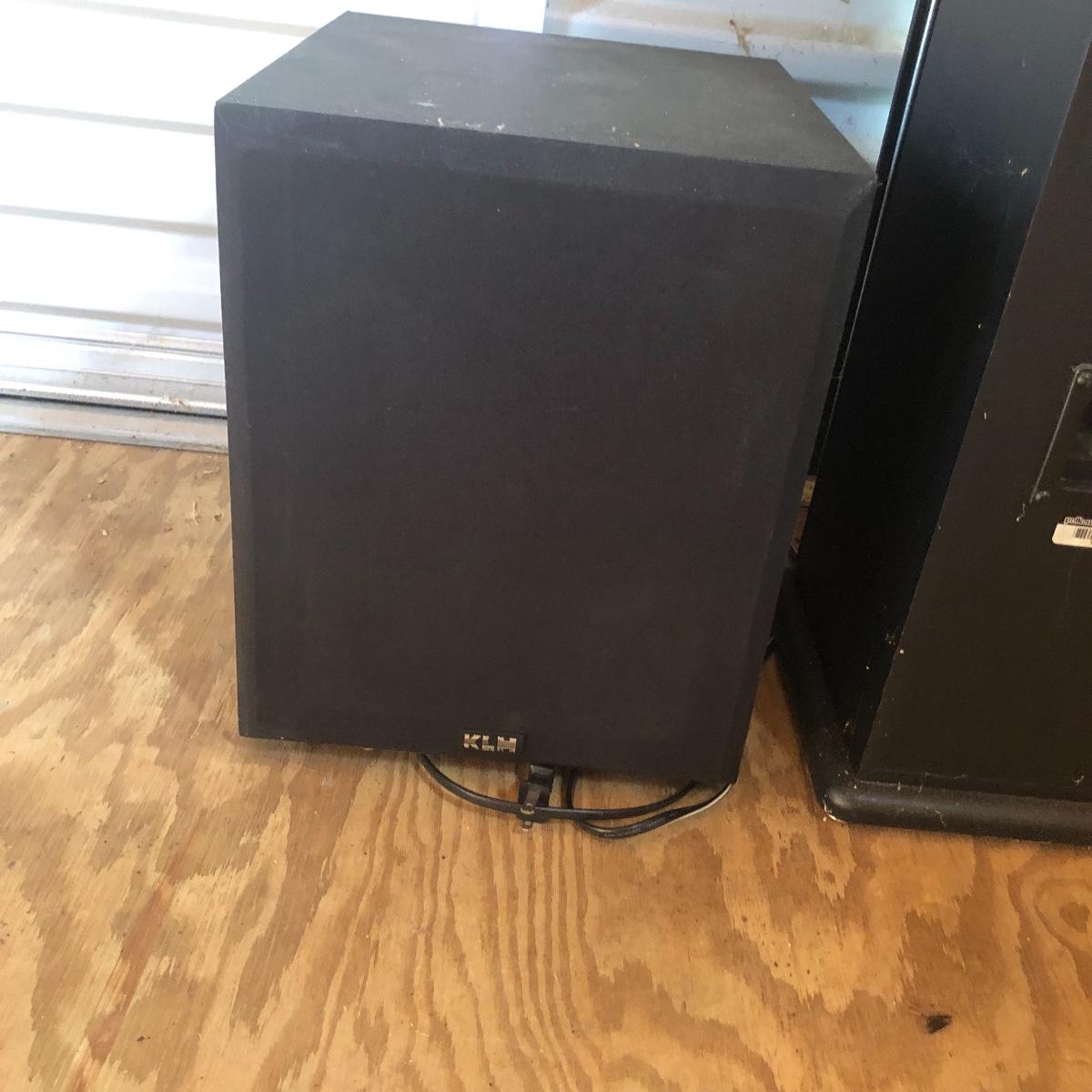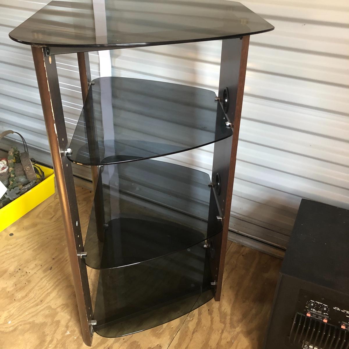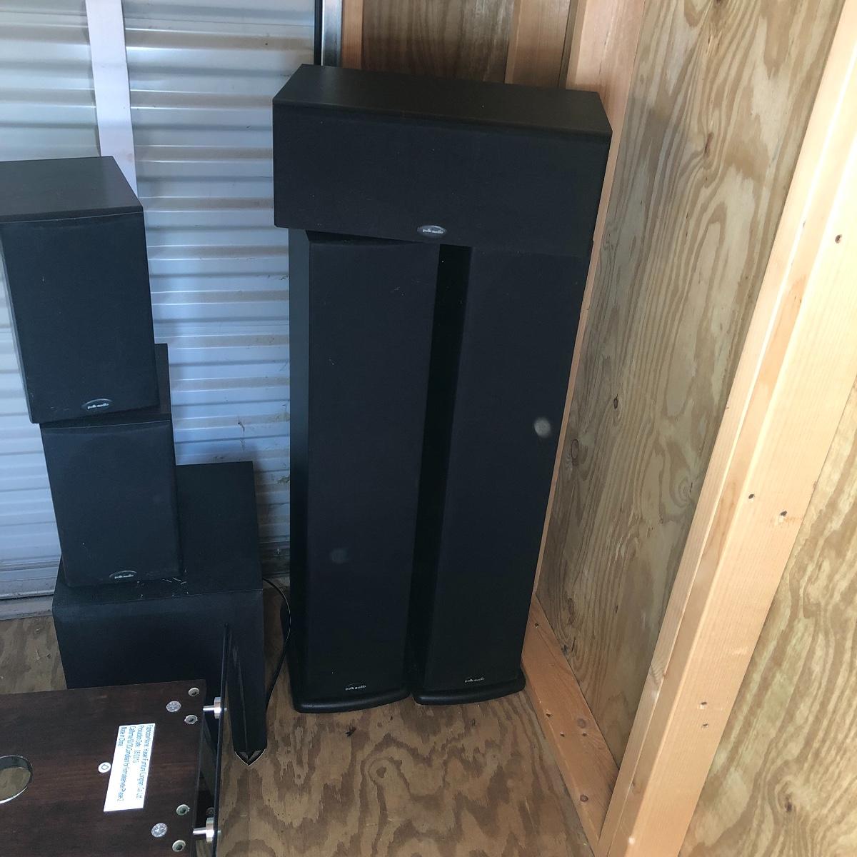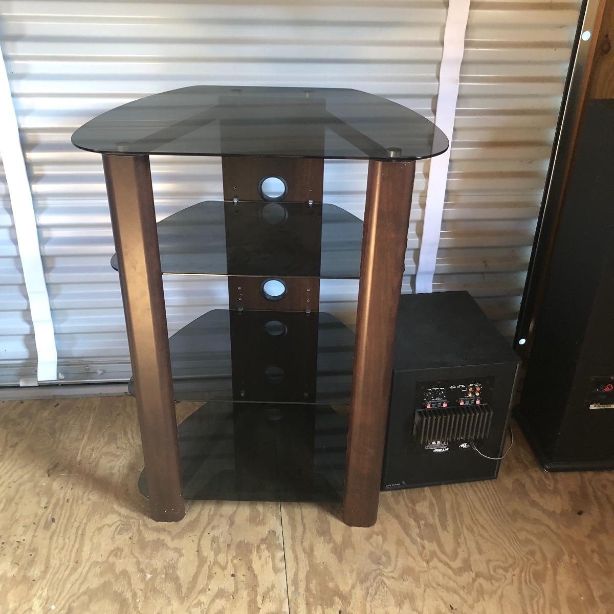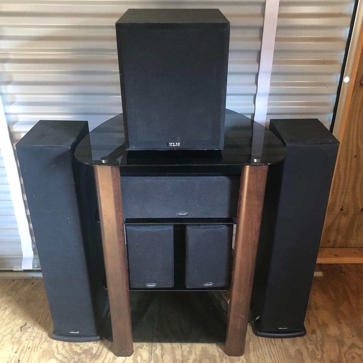 This lot has a total of five Polk Audio speakers, as well as a KLM subwoofer (images show all model numbers). We were unable to test any. The lot also includes a retro looking stereo stand that has a dark pressed wood frame and four removable dark tinted glass shelves with three holes in the back of the stand for wires. The two taller speakers measure 9.5” deep x 7” wide x 35” tall.