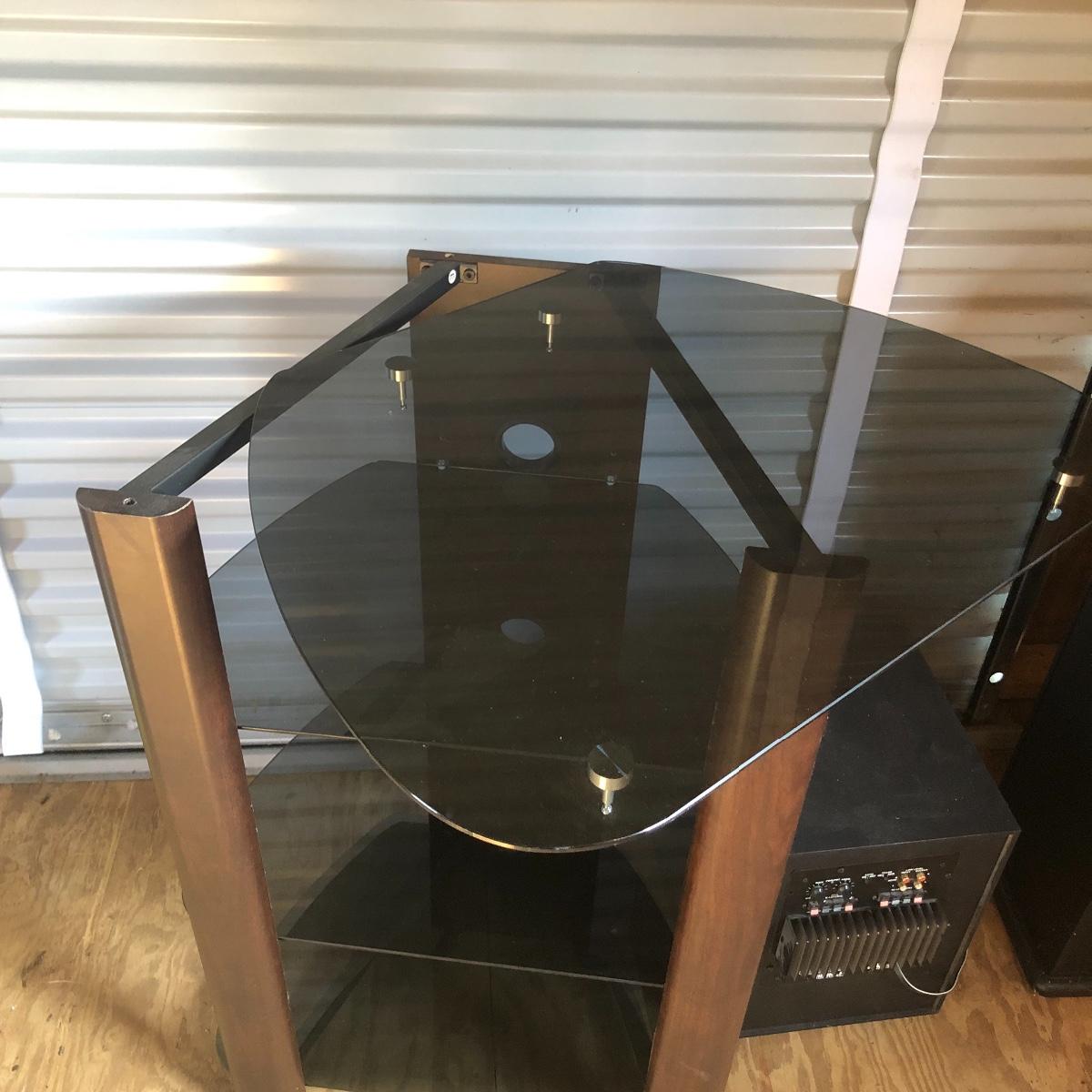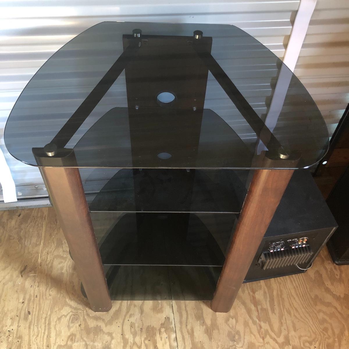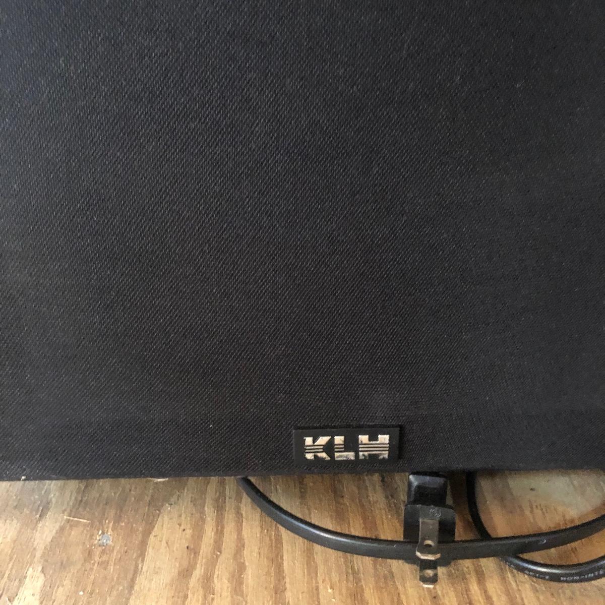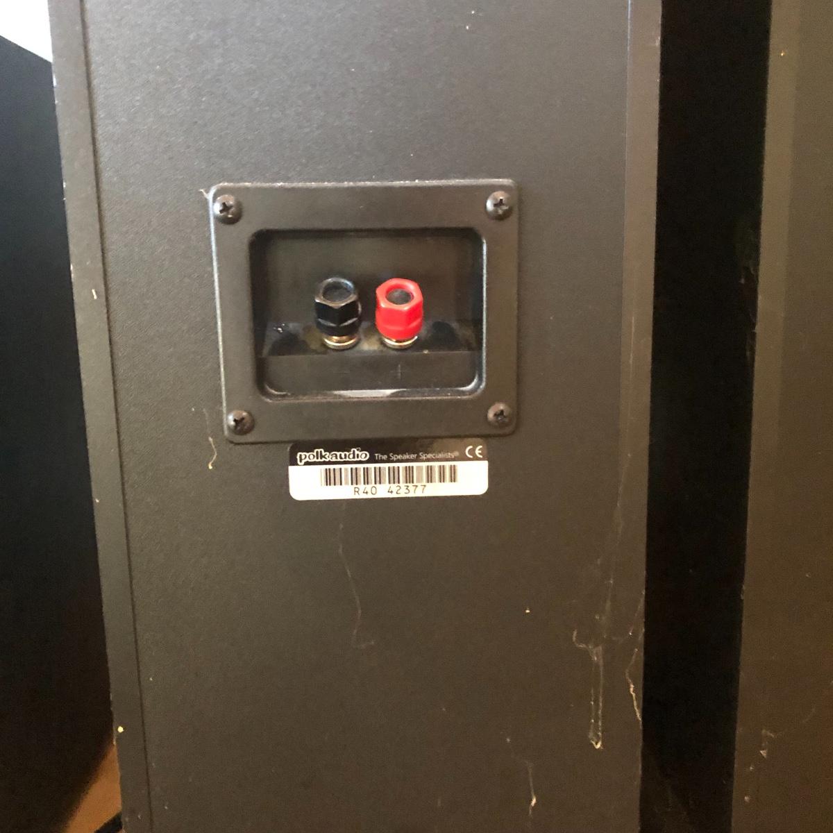 This lot has a total of five Polk Audio speakers, as well as a KLM subwoofer (images show all model numbers). We were unable to test any. The lot also includes a retro looking stereo stand that has a dark pressed wood frame and four removable dark tinted glass shelves with three holes in the back of the stand for wires. The two taller speakers measure 9.5” deep x 7” wide x 35” tall.