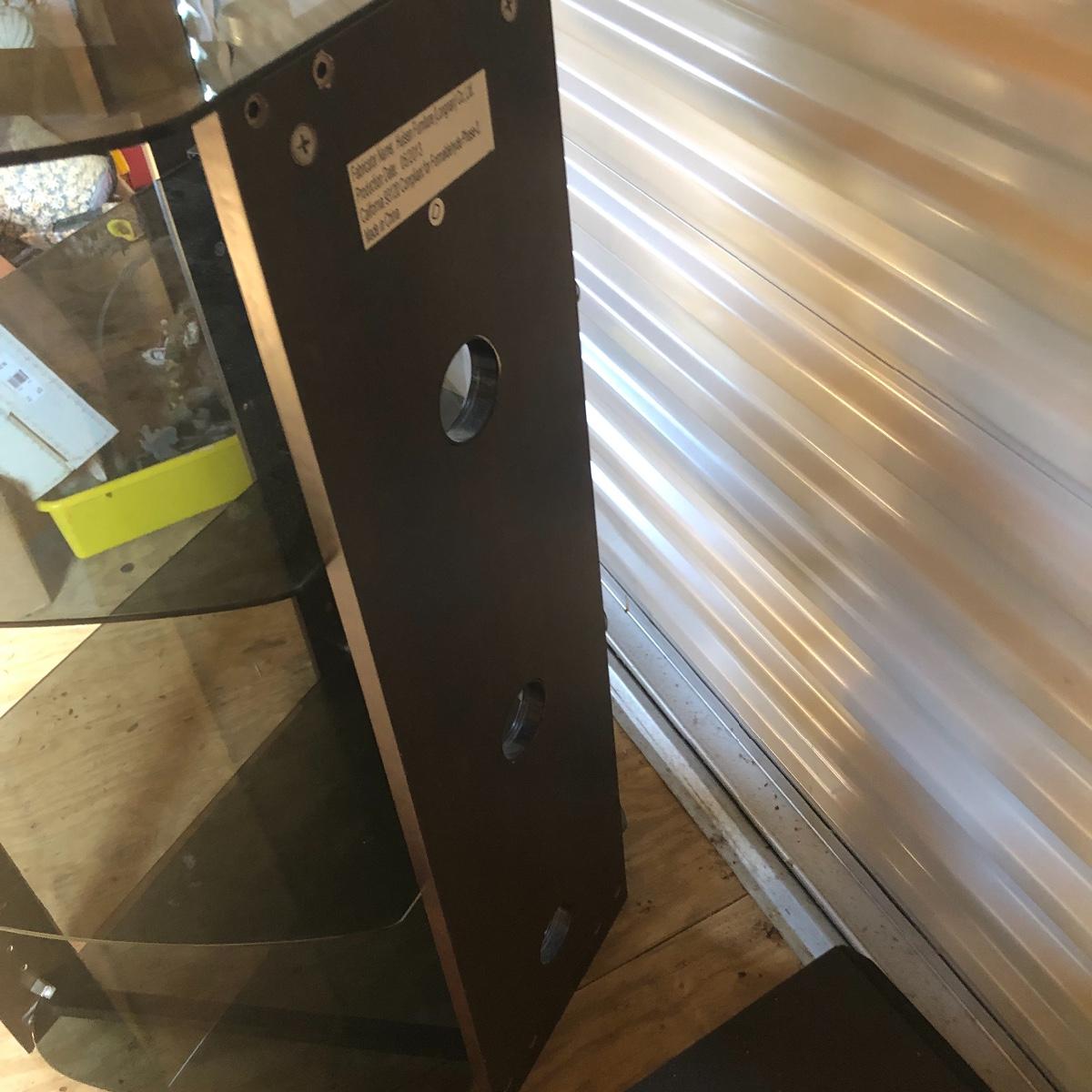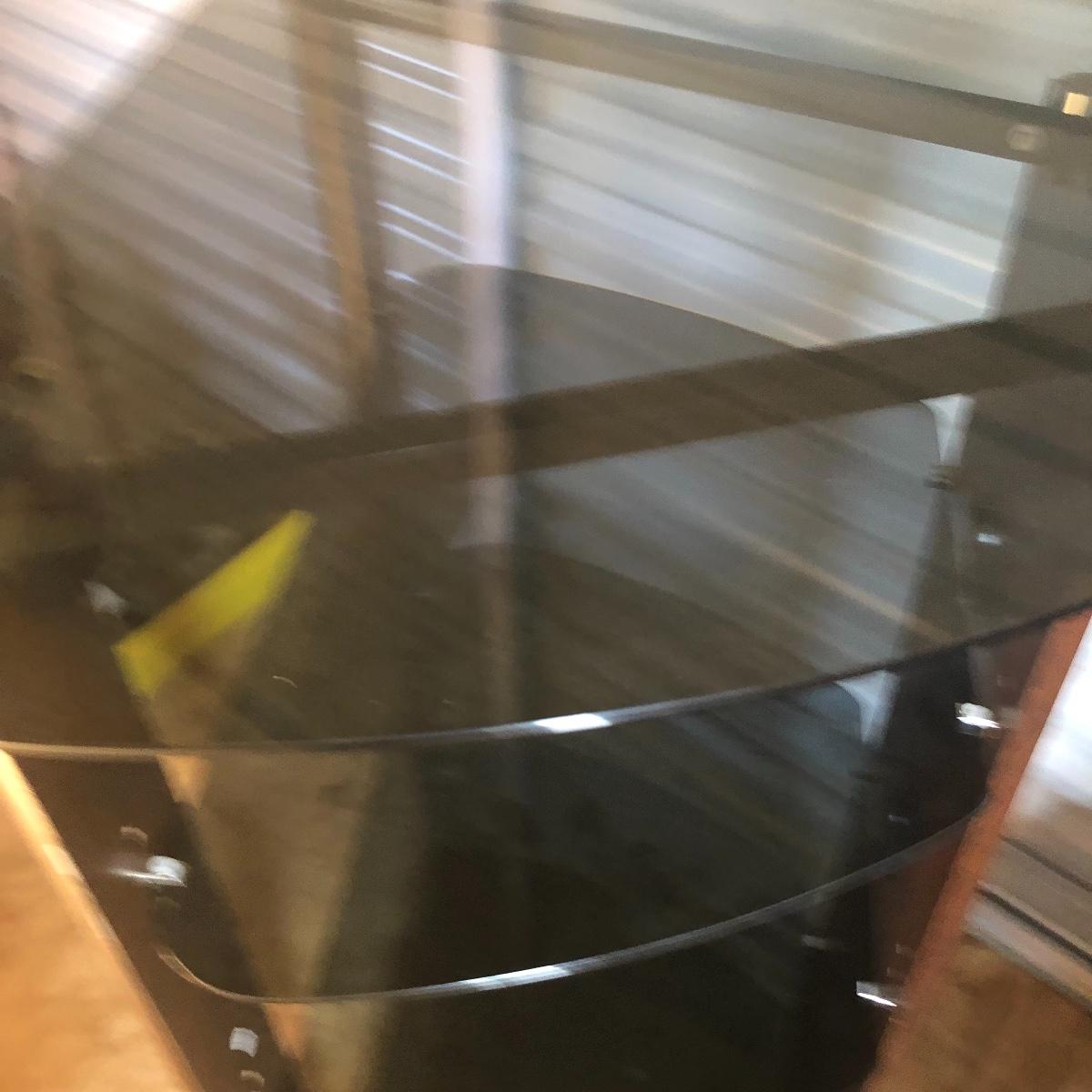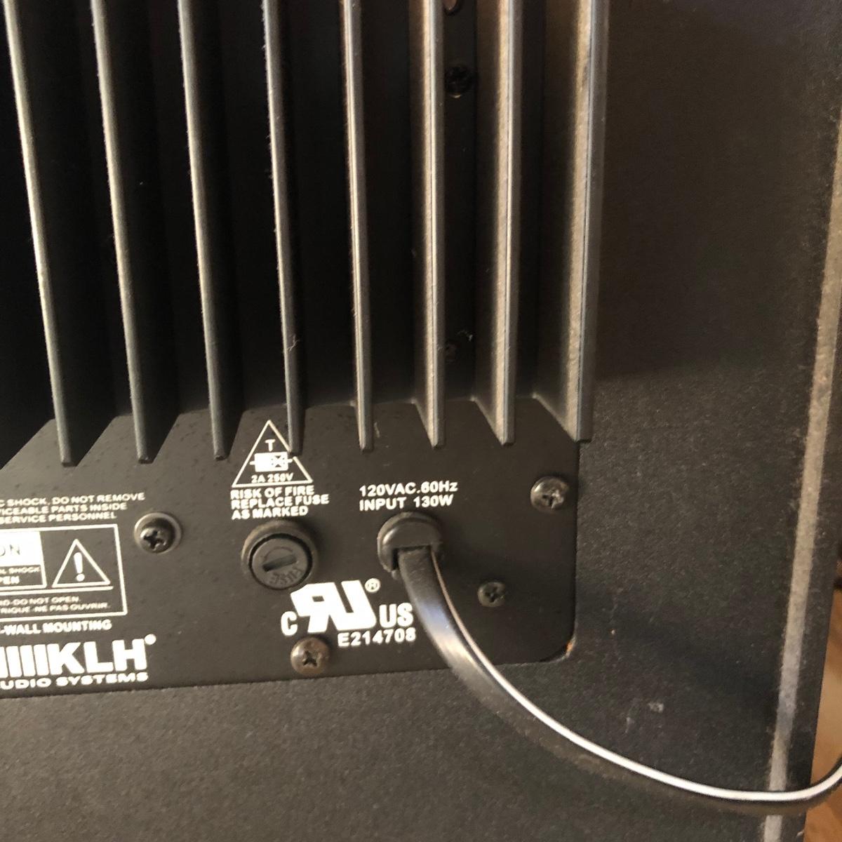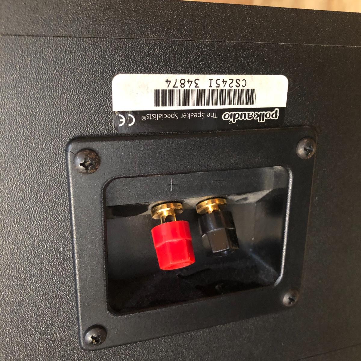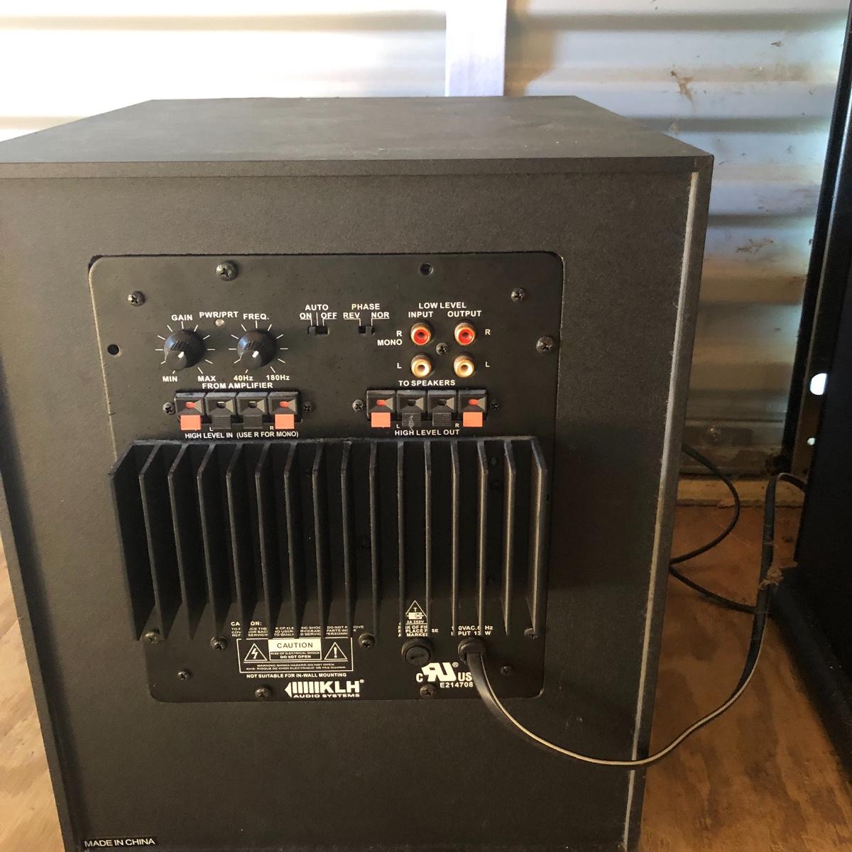 This lot has a total of five Polk Audio speakers, as well as a KLM subwoofer (images show all model numbers). We were unable to test any. The lot also includes a retro looking stereo stand that has a dark pressed wood frame and four removable dark tinted glass shelves with three holes in the back of the stand for wires. The two taller speakers measure 9.5” deep x 7” wide x 35” tall.
