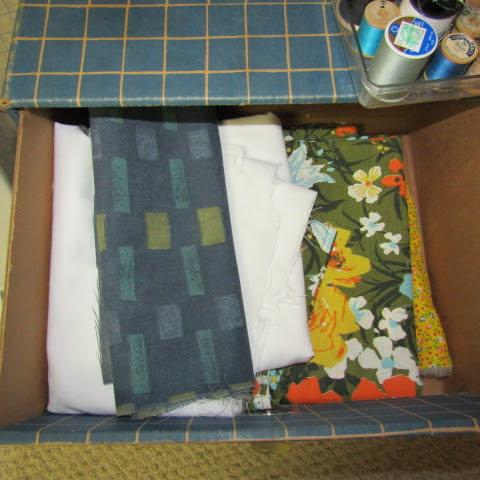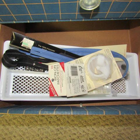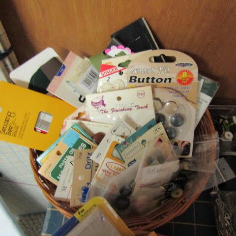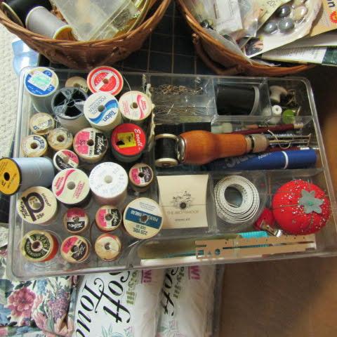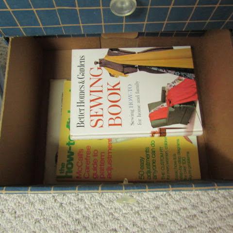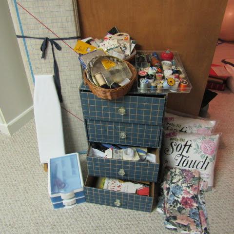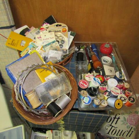 LARGE COLLECTION OF SEWING AND CRAFTING SUPPLIES. INCLUDES MATERIALS AND BOOKS. LOTS OF SEWING THREAD SPOOLS.
