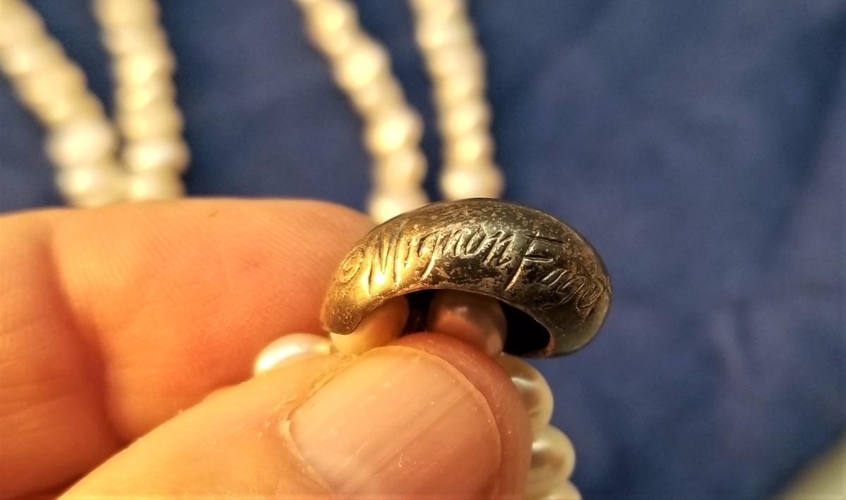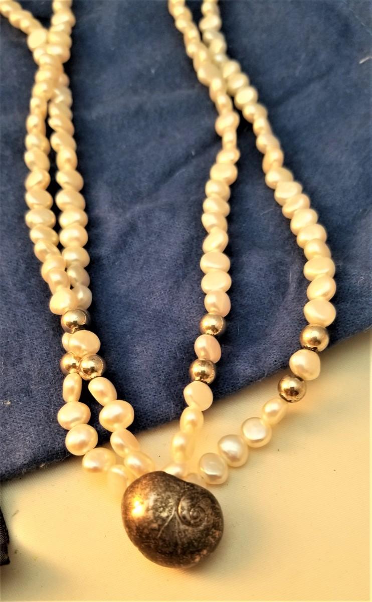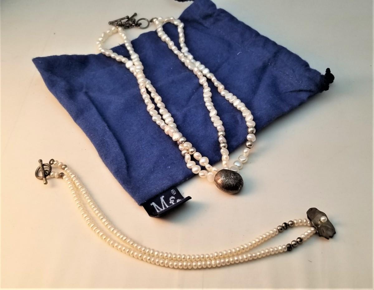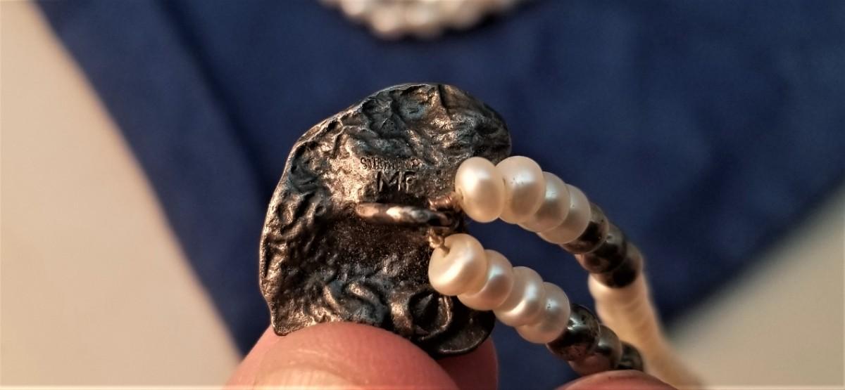 Two Mignon Faget Sterling necklaces with freshwater pearls. The double strand has the MF bag - adjustable toggle clasp, measures about 16" - adjustable to 18". The smaller one feature an "oyster shell" and is an earlier piece - small freshwater pearls, toggle clasp, 16" long. This one is perfect for a young girl and would make a great stocking stuffer.