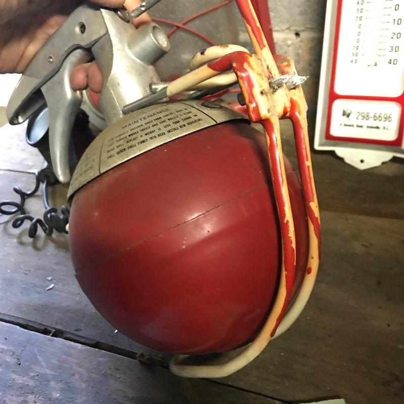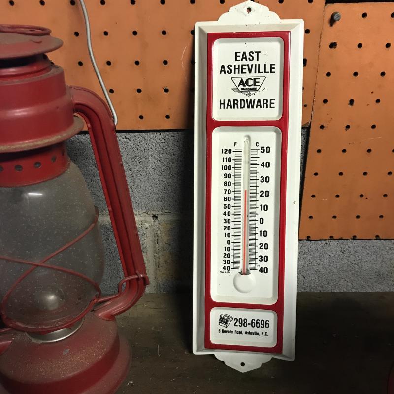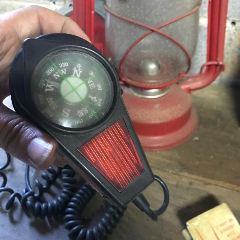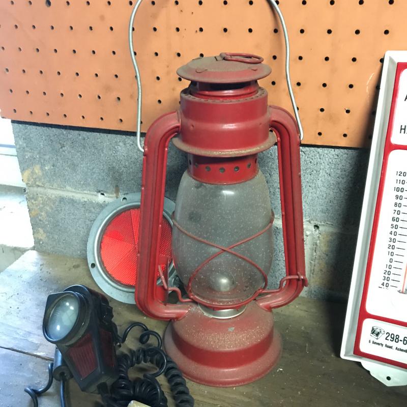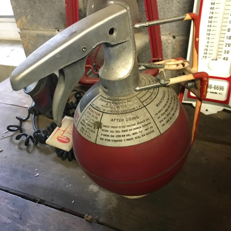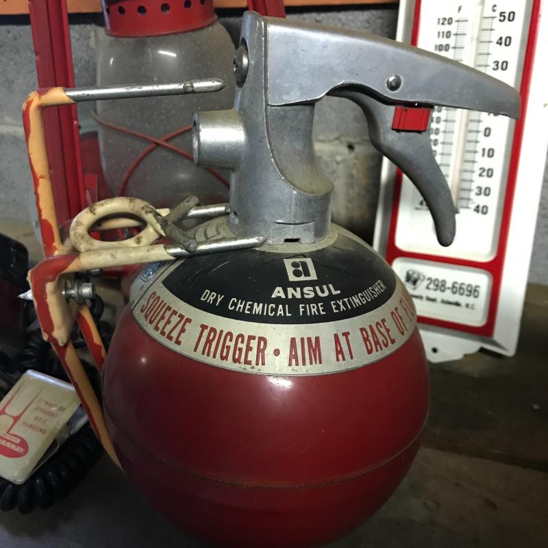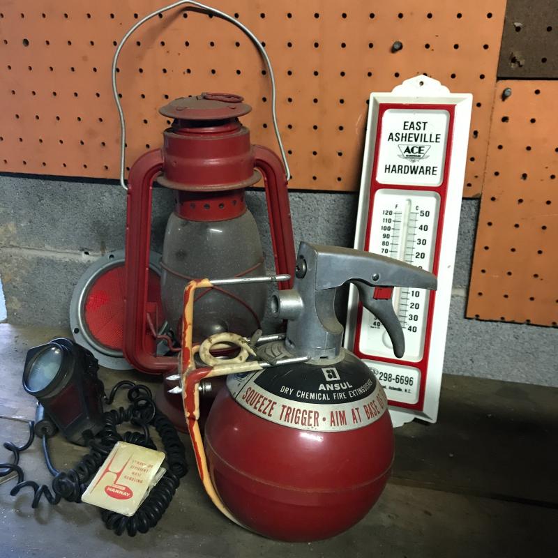 Ansul Dry Chemical Fire Extinguisher with wall mount, a tin Ace Hardware Temperature Gauge, a red lantern, a car compass, and a few misc items. No shipping.