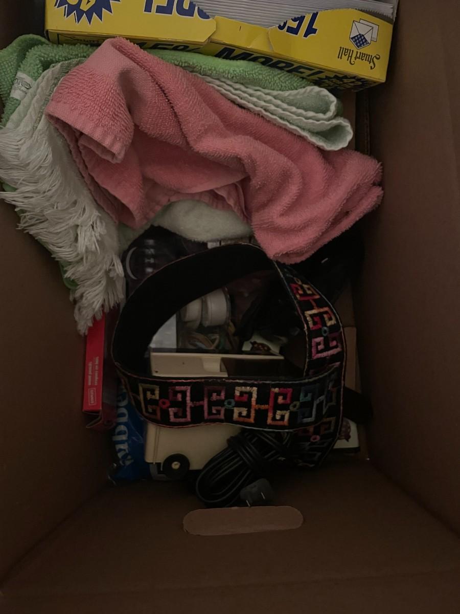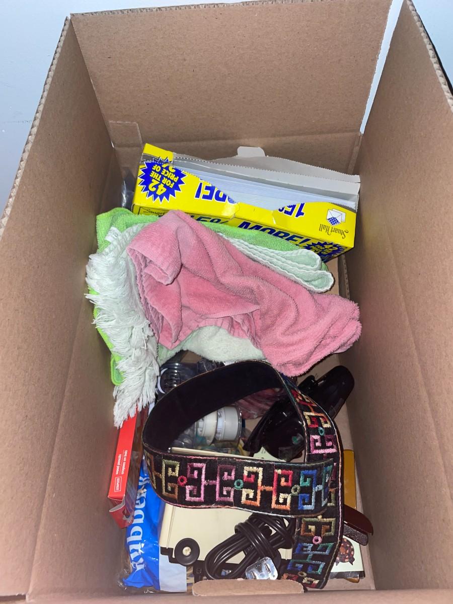 Lot 285- Box of misc. towels, office supplies, belt, ect.