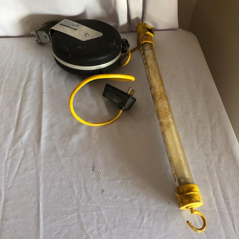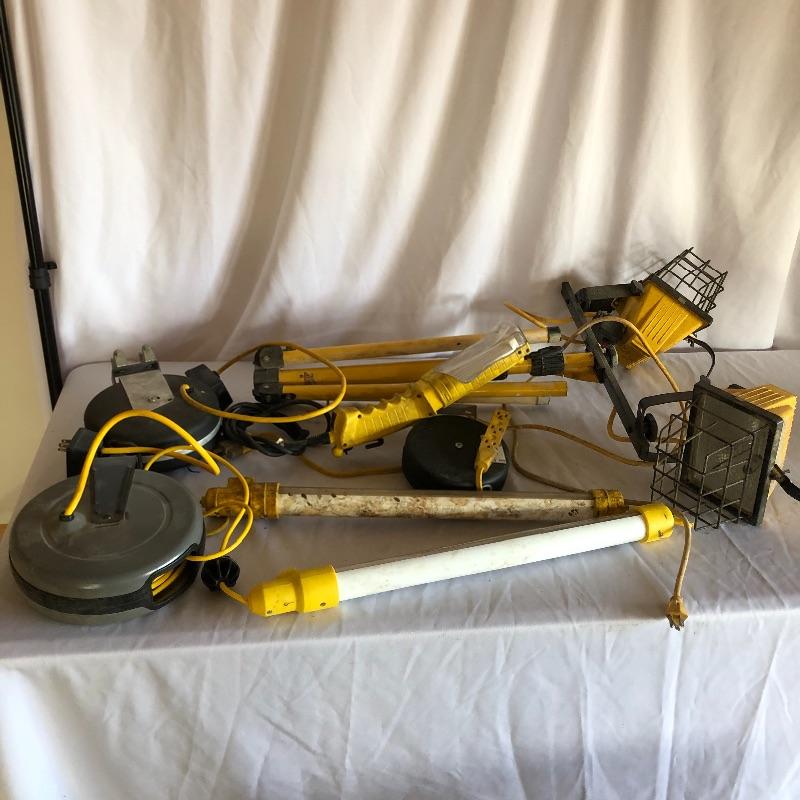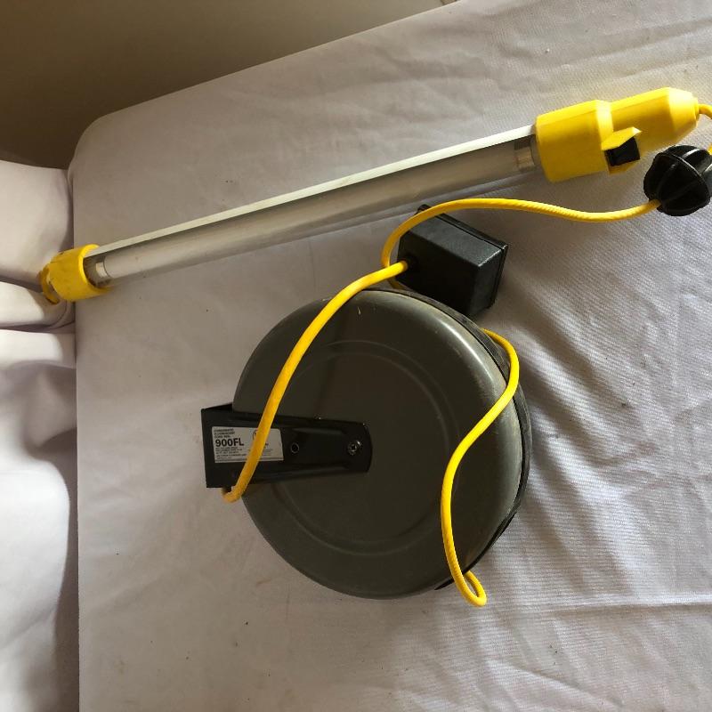 Put some light on the subject with this collection of lights. Lot includes dual halogen lights with adjustable stand, two fluorescent on cord reels, one fluorescent work light and a extension cord reel. All lights worked when tested.