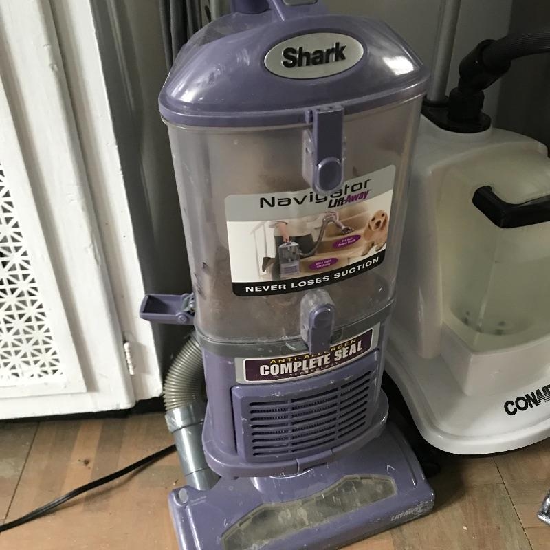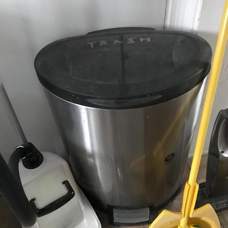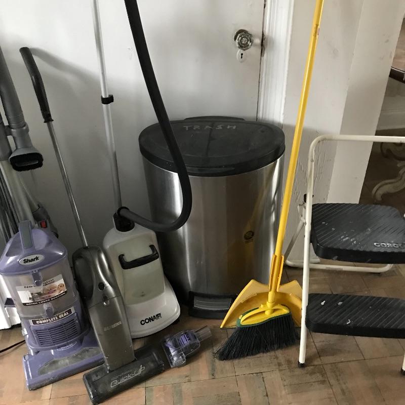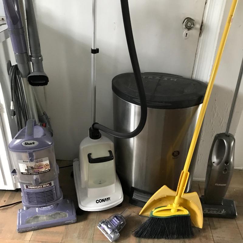 Lot includes essentials for cleaning your home and kitchen. Large kitchen garbage can, step stool, broom, clothing steamer, Shark vacuum, and rechargeable cordless pickup vac. See pics. Local pickup only.