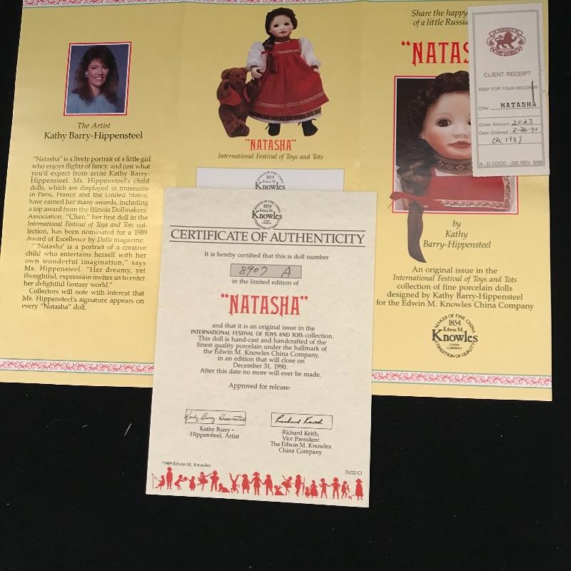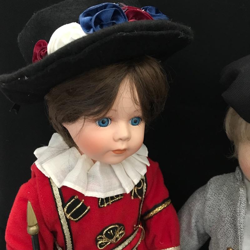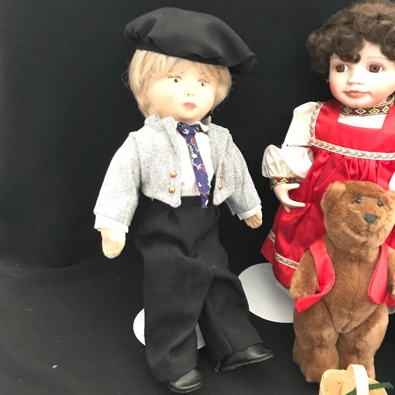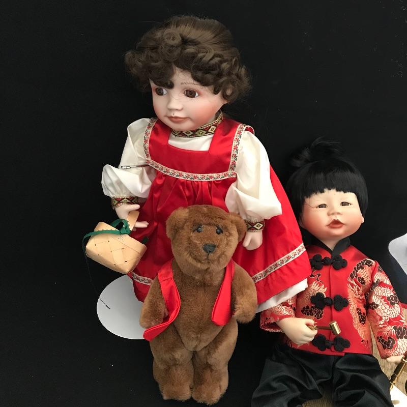 Four various dolls to add some culture to your collection. First is a Leonardo Collection Beefeater Doll with staff and glass eyes. Next is a Swiss cloth doll. He comes with a a removable hat and stand. His face is painted nicely on cloth and he’s not lacking style with his paisley tie and bead tie tack. Next is the lovely Natasha from the International Festival of Toys and Tots Collection. She is porcelain and cloth with ruby earrings, a teddy bear and basket. Natasha is also complete with stand and certificate. Chen concludes our international doll lot, he is also from the International Festival of Toys and Tots Collection. He’s meant to kneel on his mat and complete with gong and certificate. See photos. Shipping available.