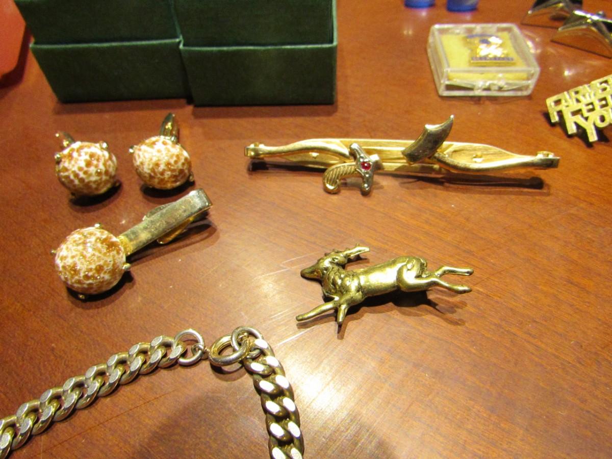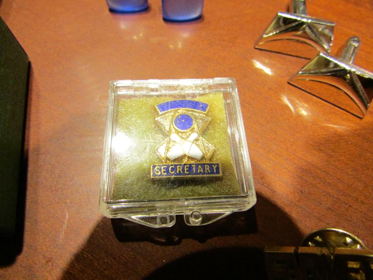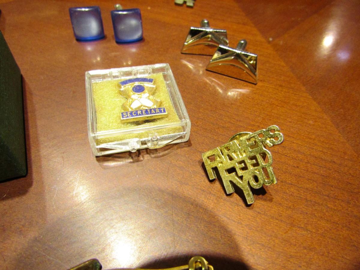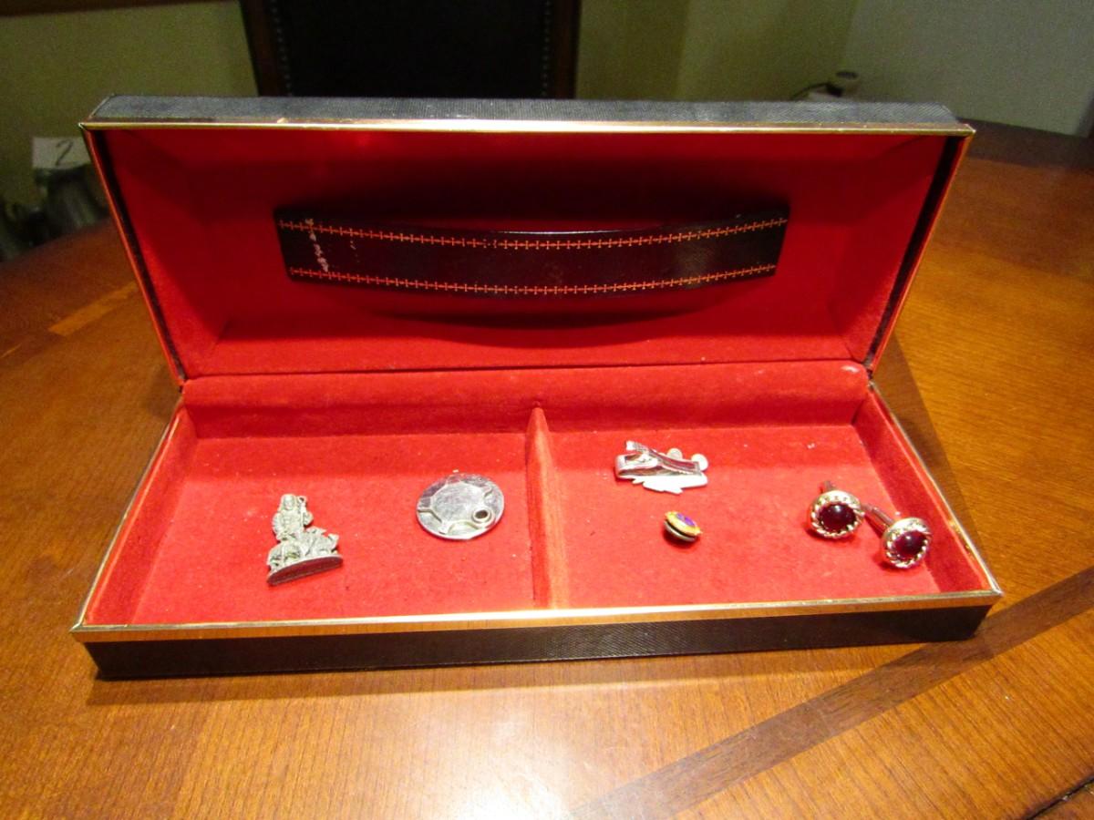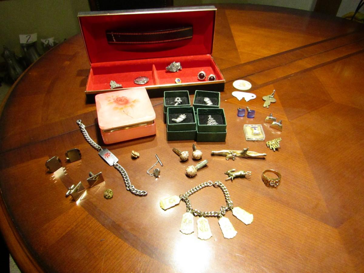 FRATERNITY CHARM BRACELET, MEN'S GOLD FILLED RING SIZE 12.5, CUFFLINKS, TIE TACKS, PINS, 4 PEWTER PINS IN BOXES, GLASS TRINKET BOX AND A MEN'S JEWELRY BOX