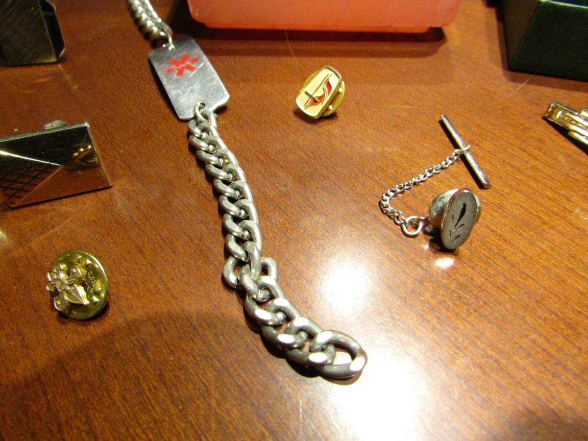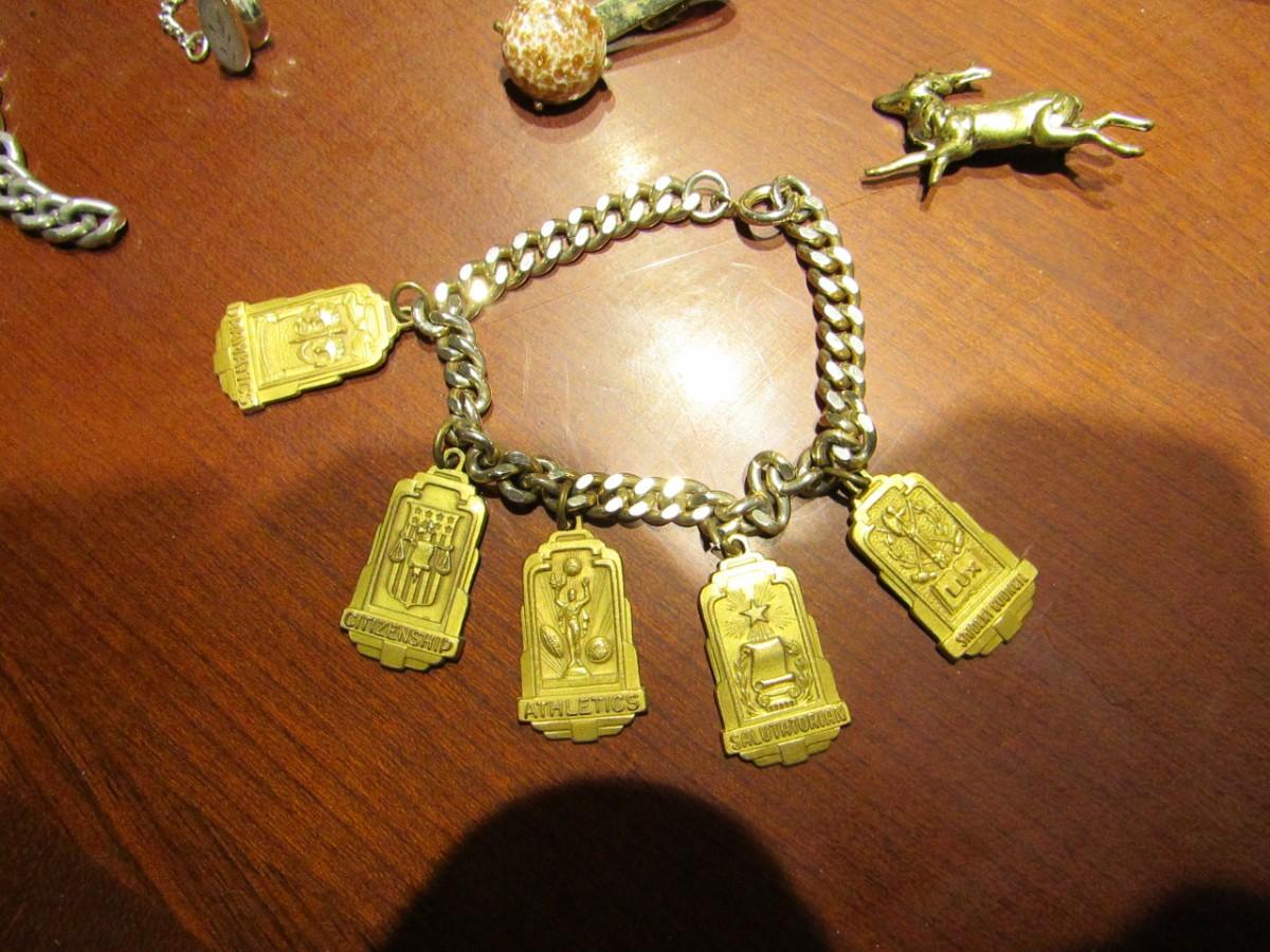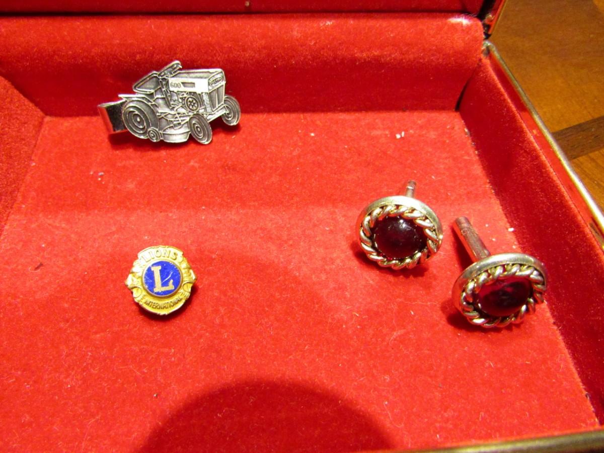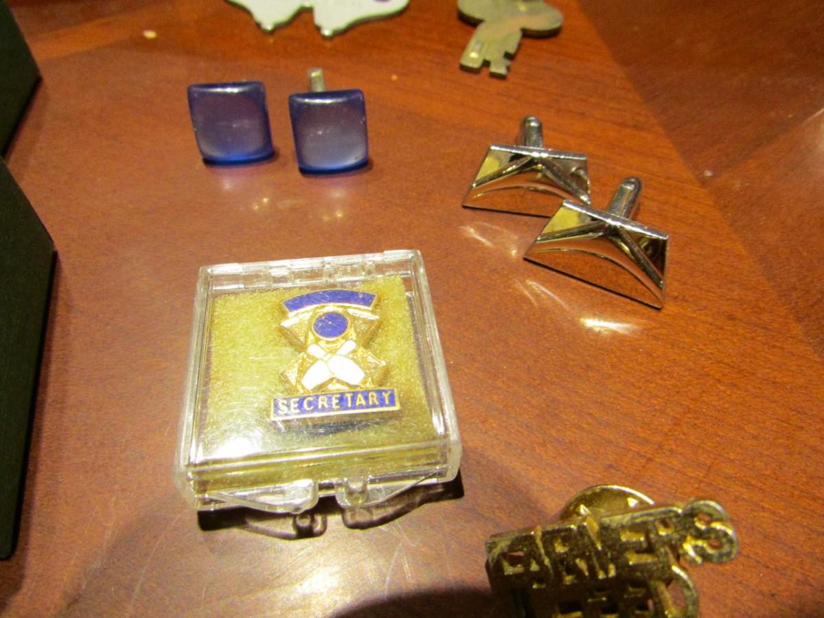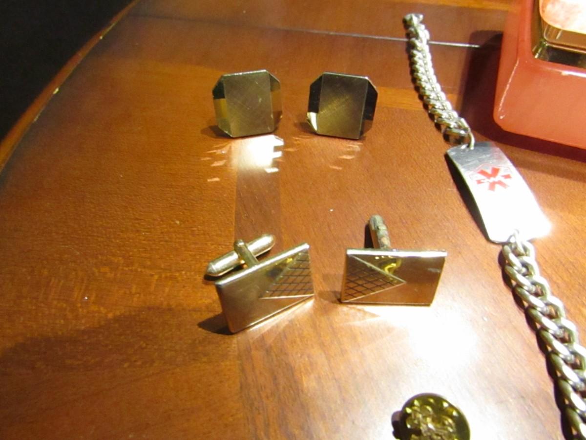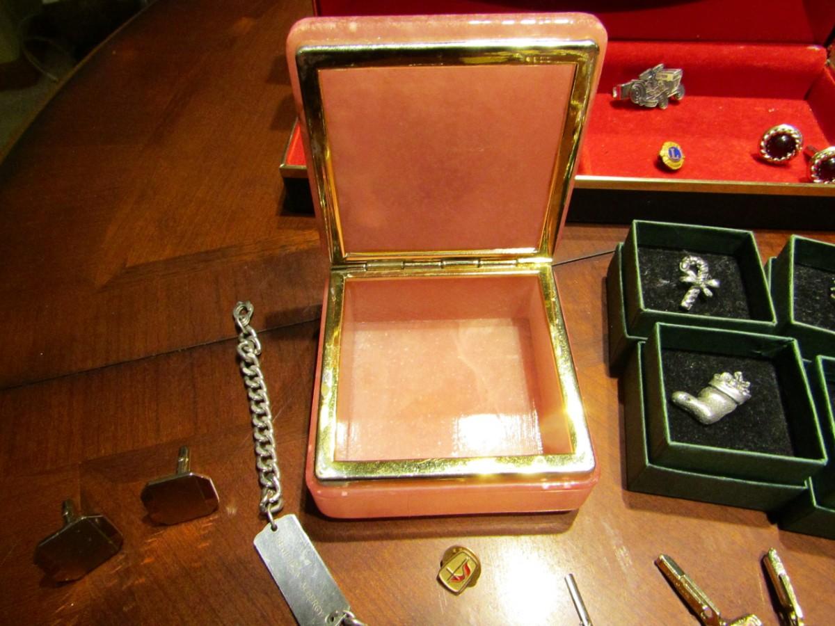 FRATERNITY CHARM BRACELET, MEN'S GOLD FILLED RING SIZE 12.5, CUFFLINKS, TIE TACKS, PINS, 4 PEWTER PINS IN BOXES, GLASS TRINKET BOX AND A MEN'S JEWELRY BOX