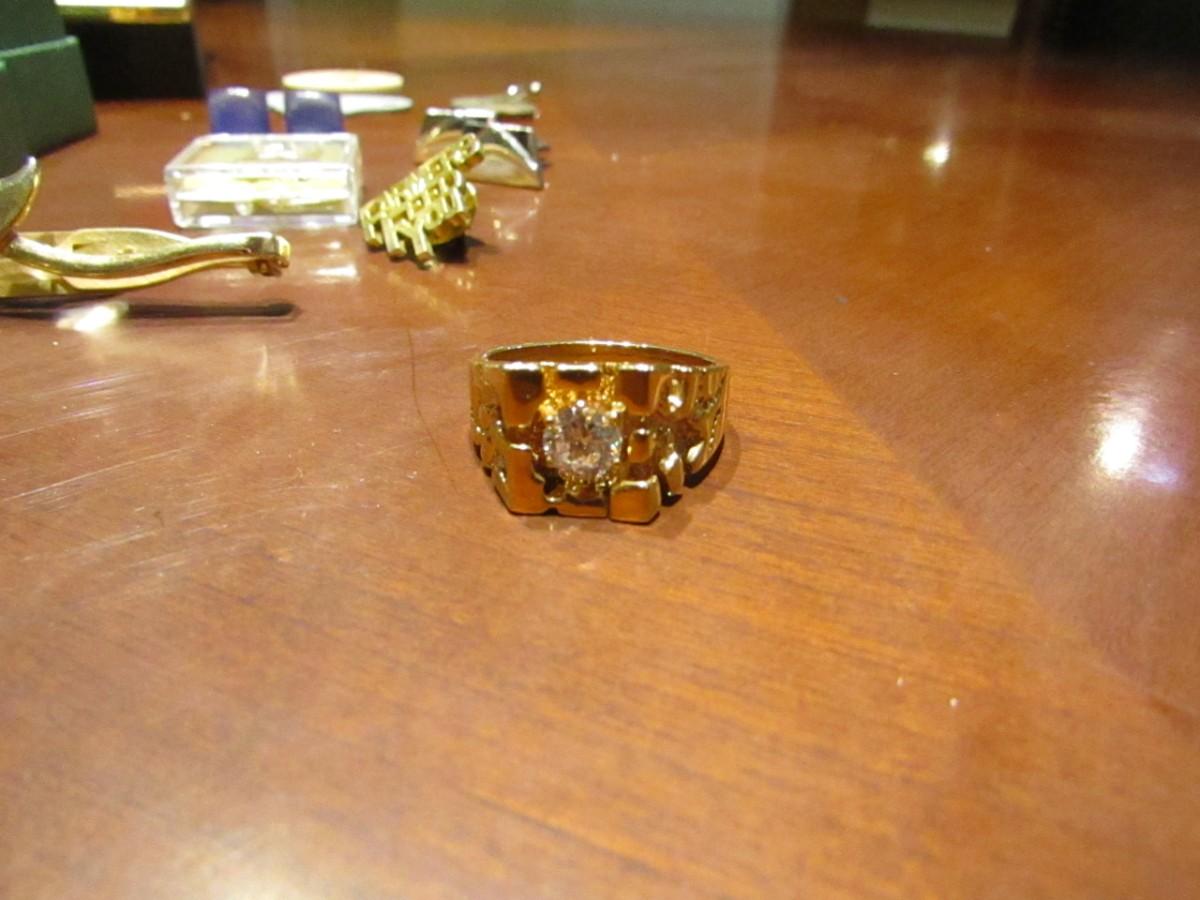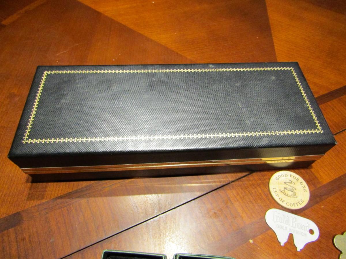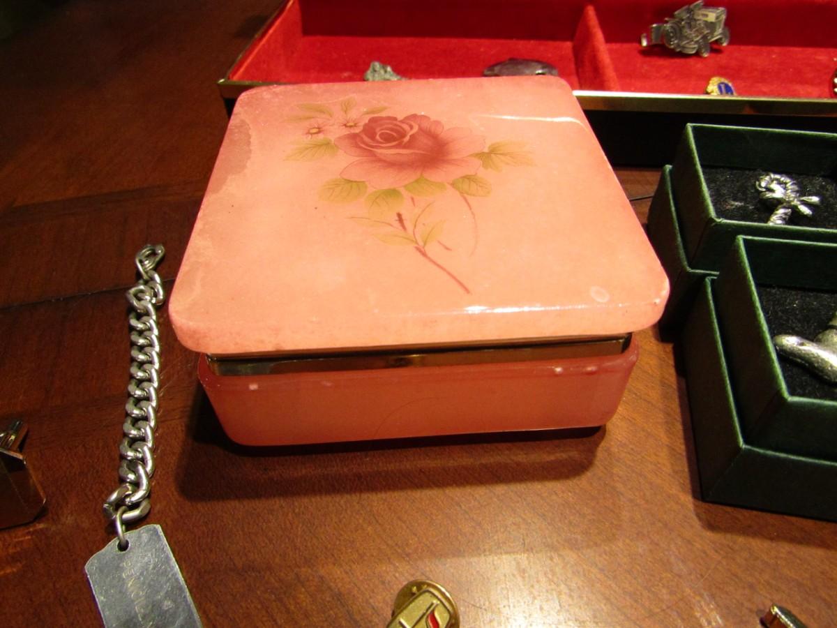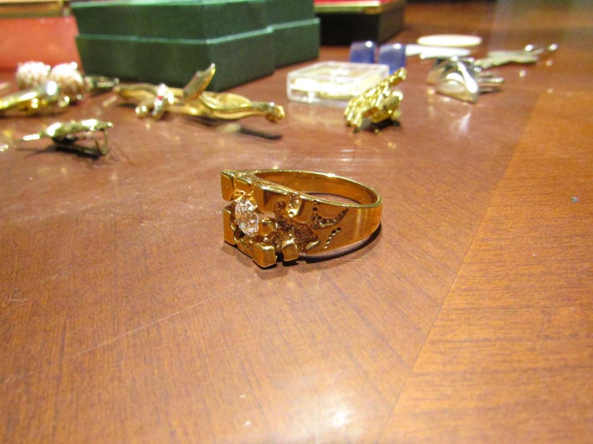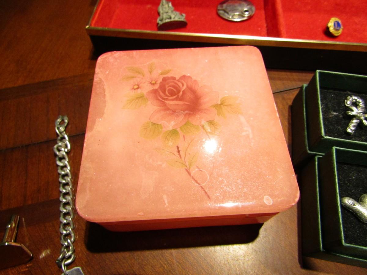 FRATERNITY CHARM BRACELET, MEN'S GOLD FILLED RING SIZE 12.5, CUFFLINKS, TIE TACKS, PINS, 4 PEWTER PINS IN BOXES, GLASS TRINKET BOX AND A MEN'S JEWELRY BOX