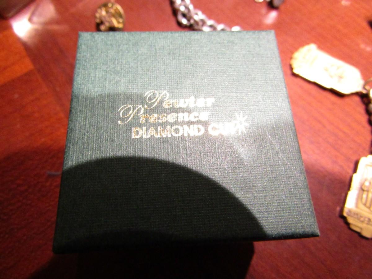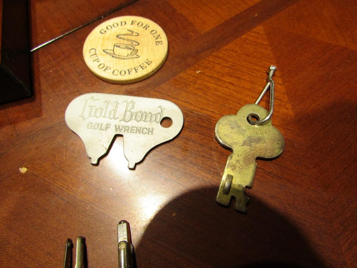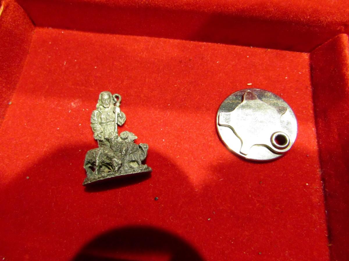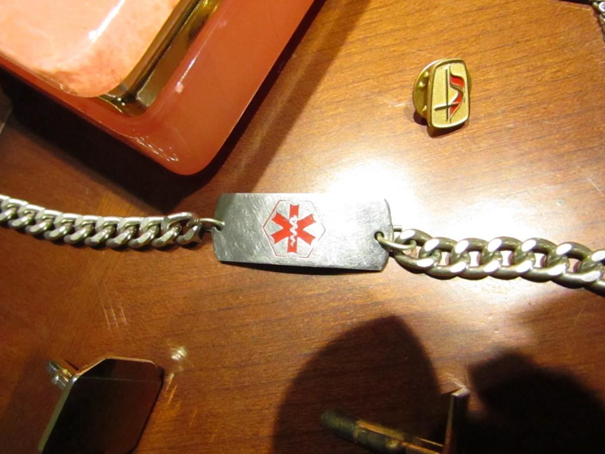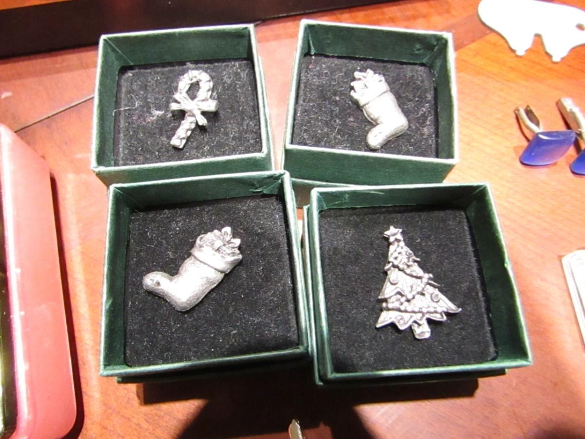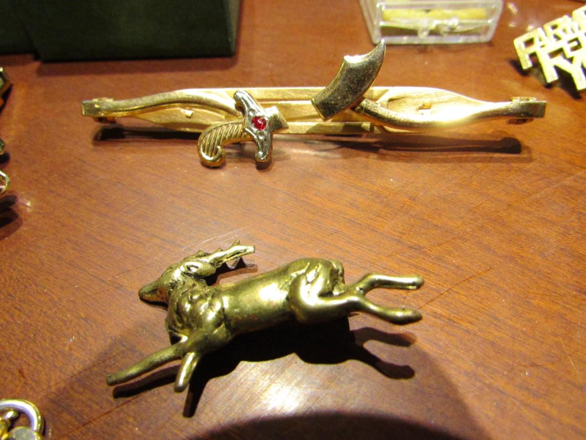 FRATERNITY CHARM BRACELET, MEN'S GOLD FILLED RING SIZE 12.5, CUFFLINKS, TIE TACKS, PINS, 4 PEWTER PINS IN BOXES, GLASS TRINKET BOX AND A MEN'S JEWELRY BOX
