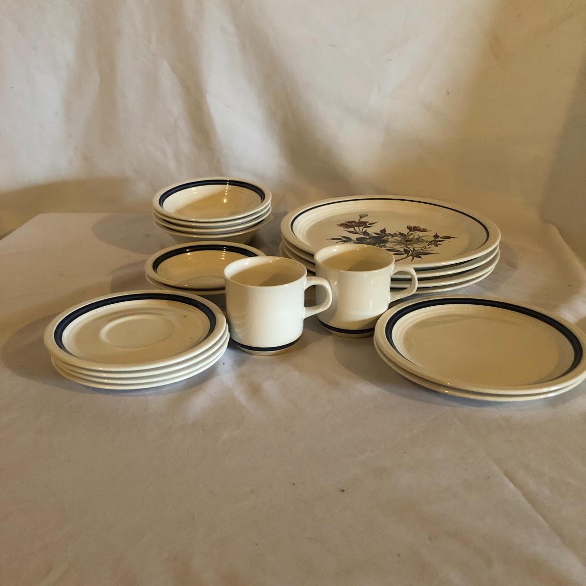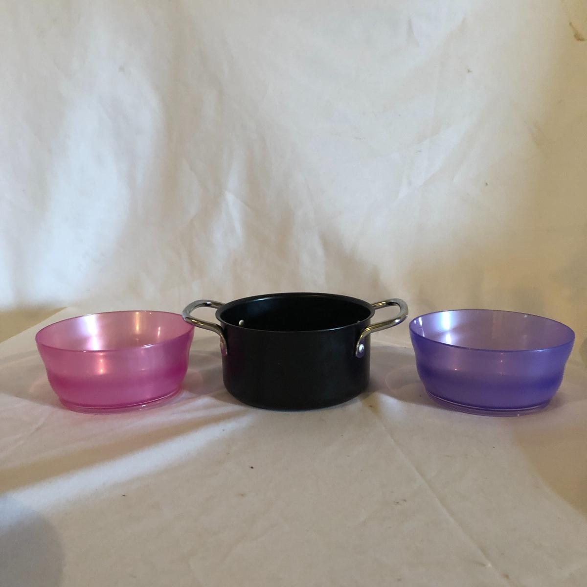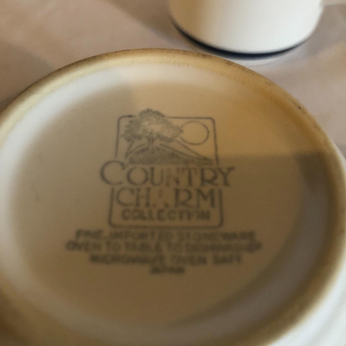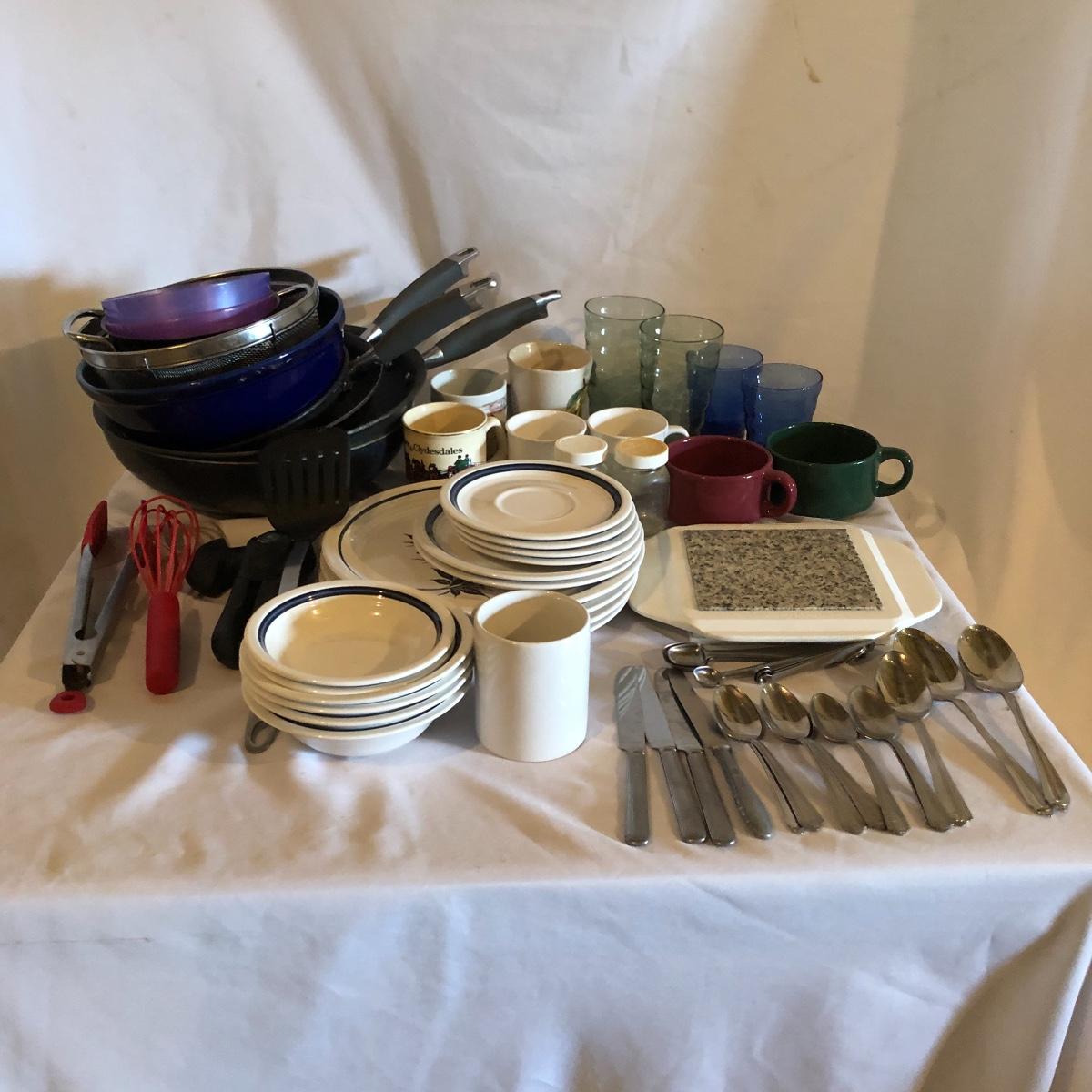 This is a great set for your college student or for a small apartment. Lot includes Country charm set with two cups, small plates and bowls and four dinner plates, bowls and saucers. Also includes four glasses, warming stone, salt and pepper shakers, wok type pan, colander, three frying pans and more. Largest frying pan measures 13”D.