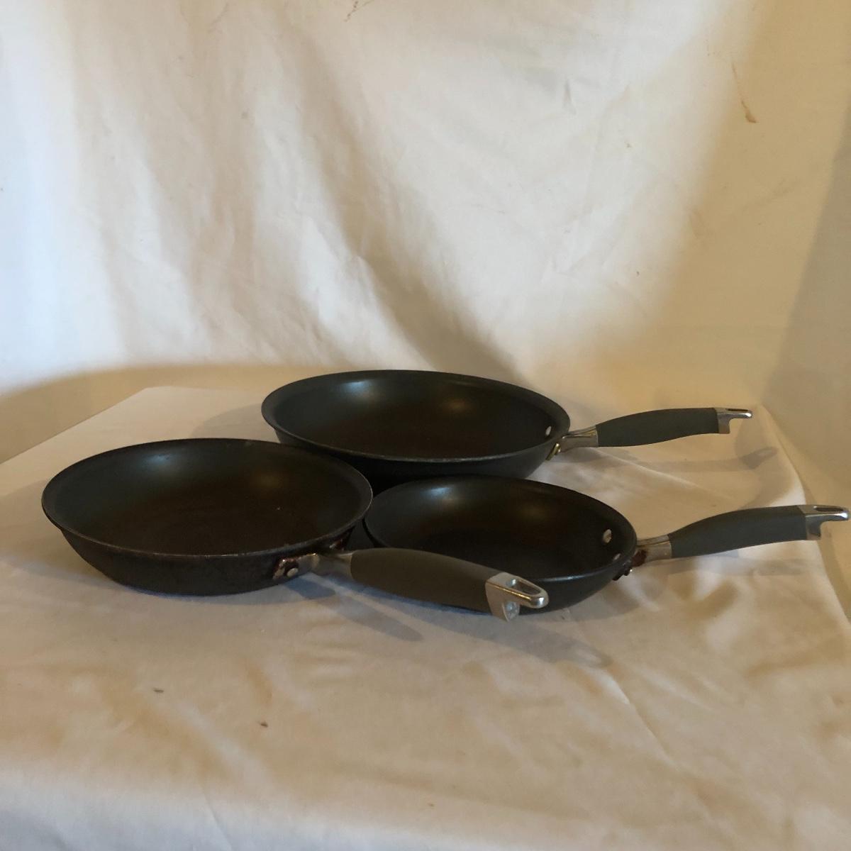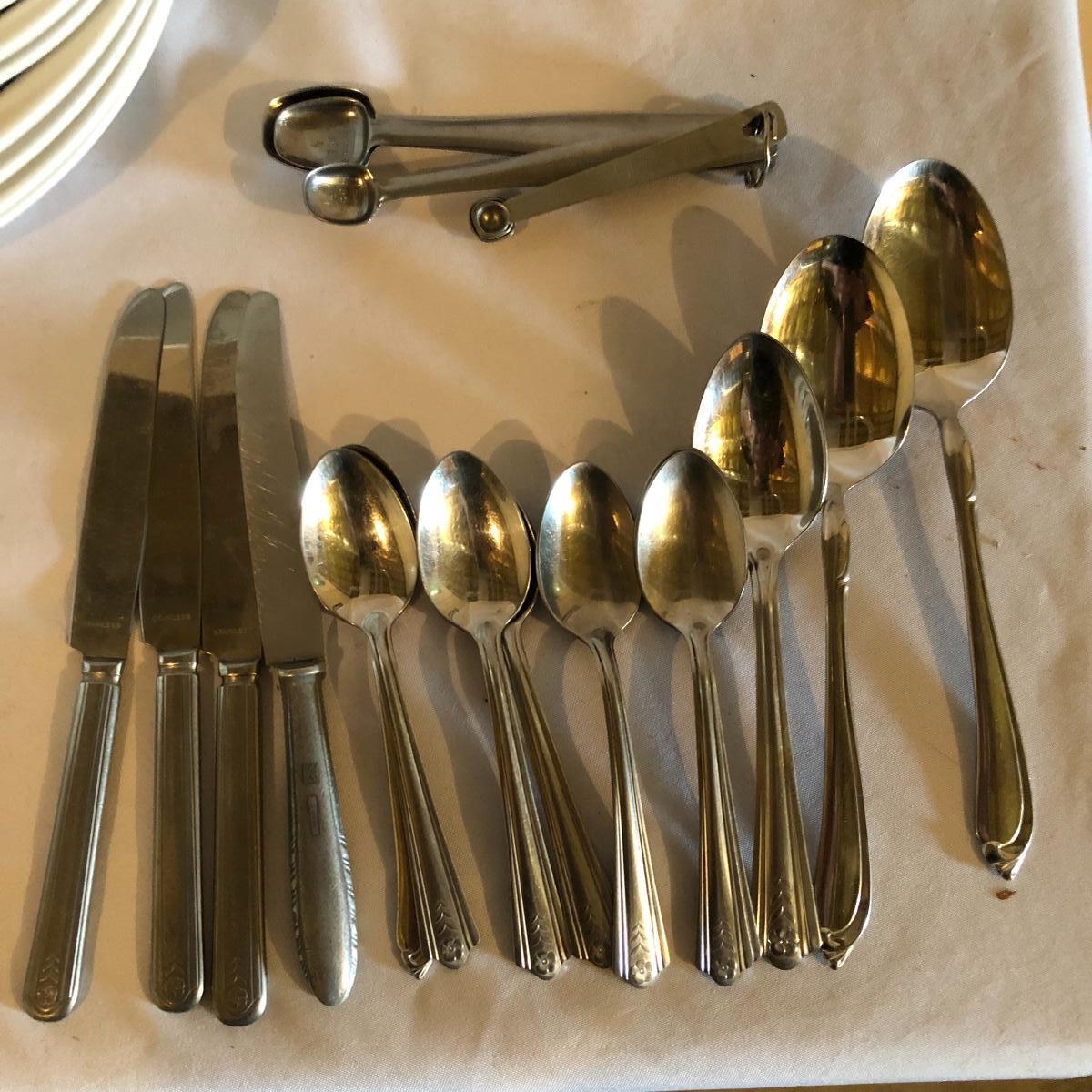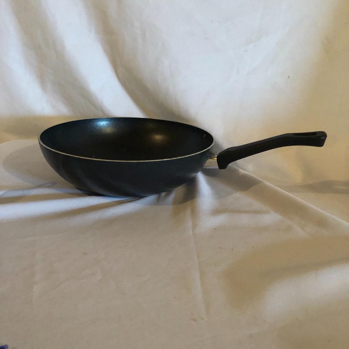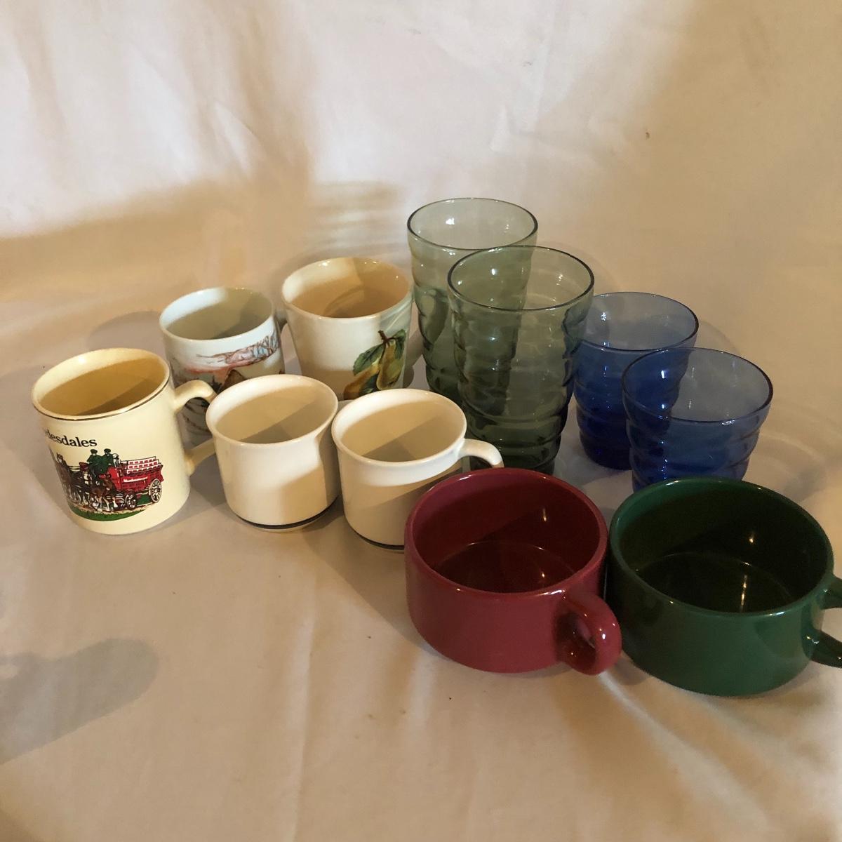 This is a great set for your college student or for a small apartment. Lot includes Country charm set with two cups, small plates and bowls and four dinner plates, bowls and saucers. Also includes four glasses, warming stone, salt and pepper shakers, wok type pan, colander, three frying pans and more. Largest frying pan measures 13”D.