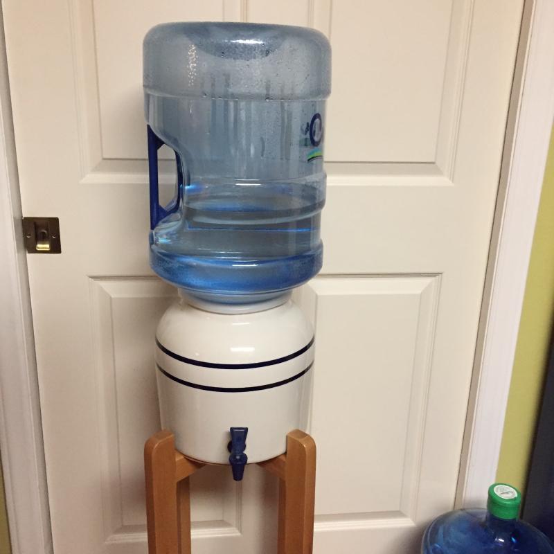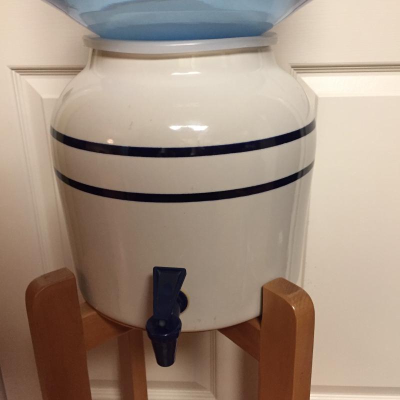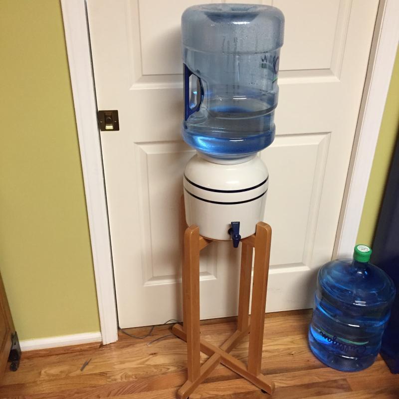 Ceramic Water Dispenser on Wooden Stand. Stand with Water Bottle on Measures 13.5”x50.5”. Extra bottle in photos does not convey with this lot. The Culligan cooler does go with the buyer. Local Pickup Only