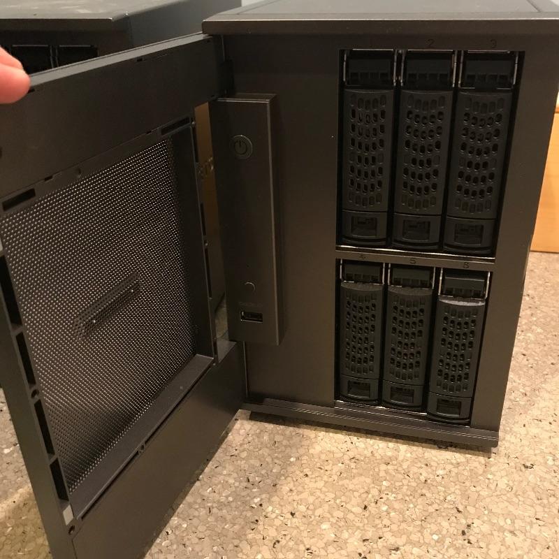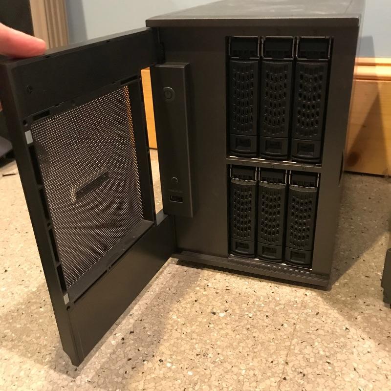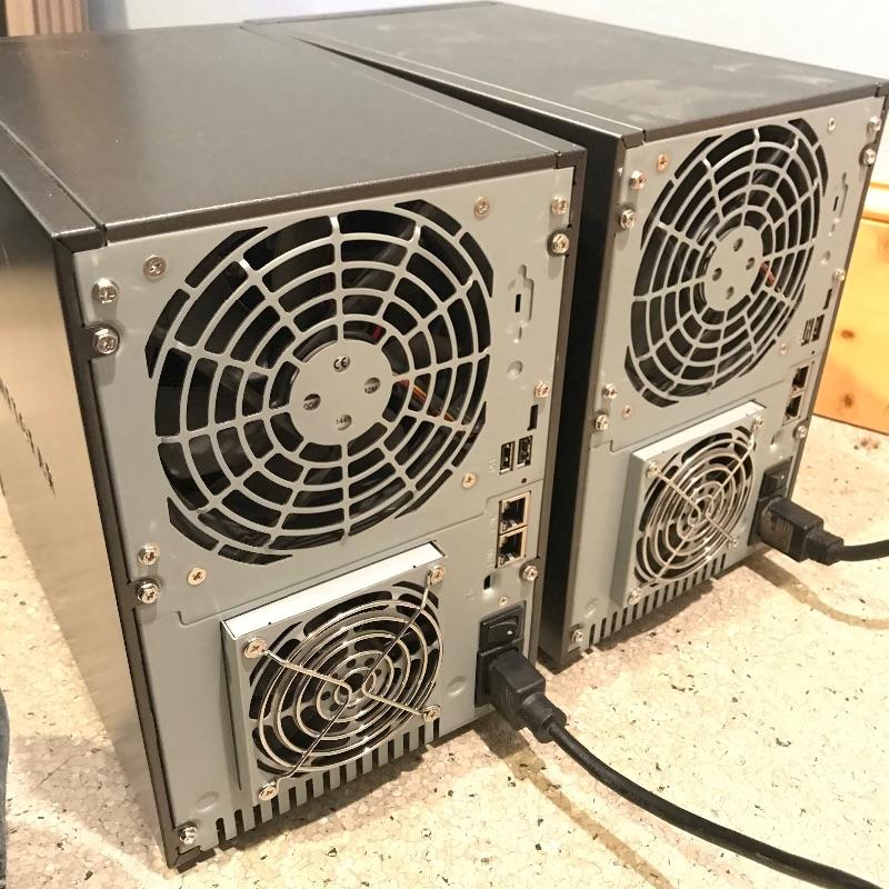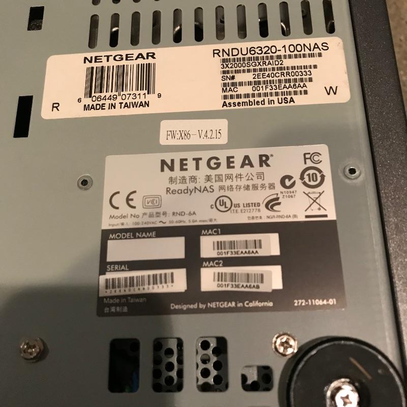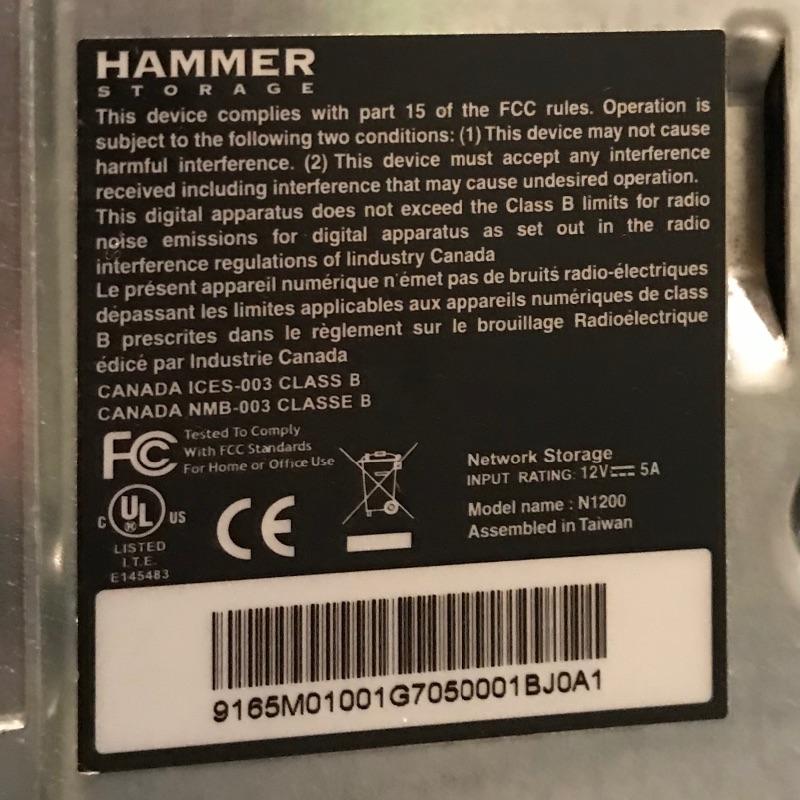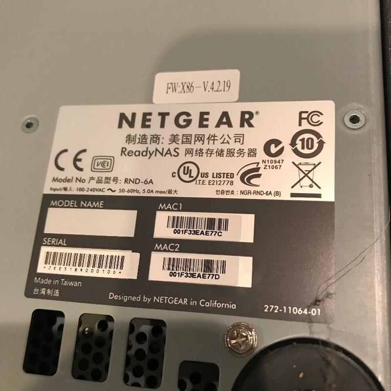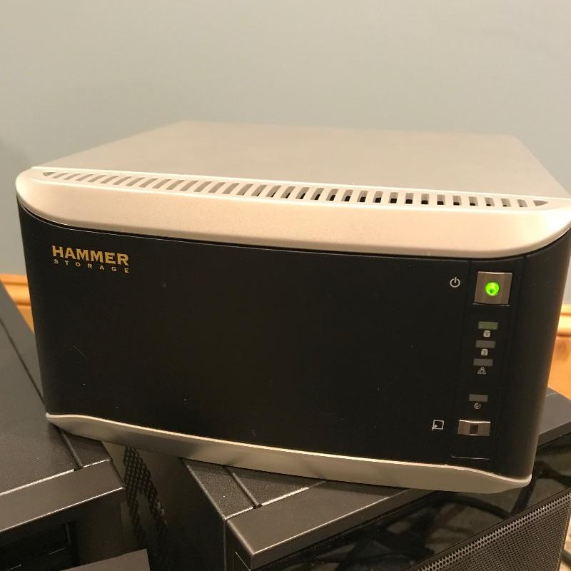 Sweet lot to make sure you never lose your electronic data! Two NetGear ReadyNAS with one NetGear ReadyNAS NV+ and one Hammer N1200 storage. The three NetGear backups all have error messages stating no disks. The Hammer storage does not have a text screen and it is unclear but likely that it will also need hard drives. All four power on when prompted. The Hammer Storage has a loose piece inside that rattles, but still appears to work. See photos. No shipping.