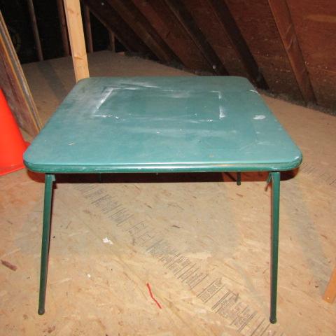 GREEN TABLE HAS PAINT OR SOMETHING LIKE IT ON THE TOP