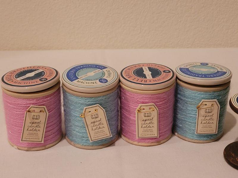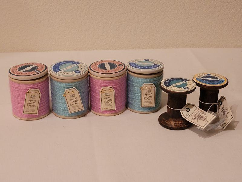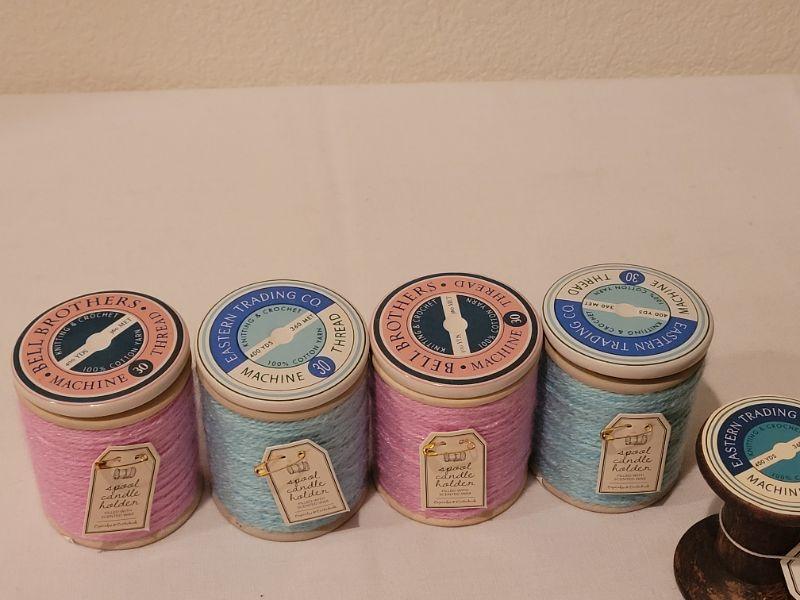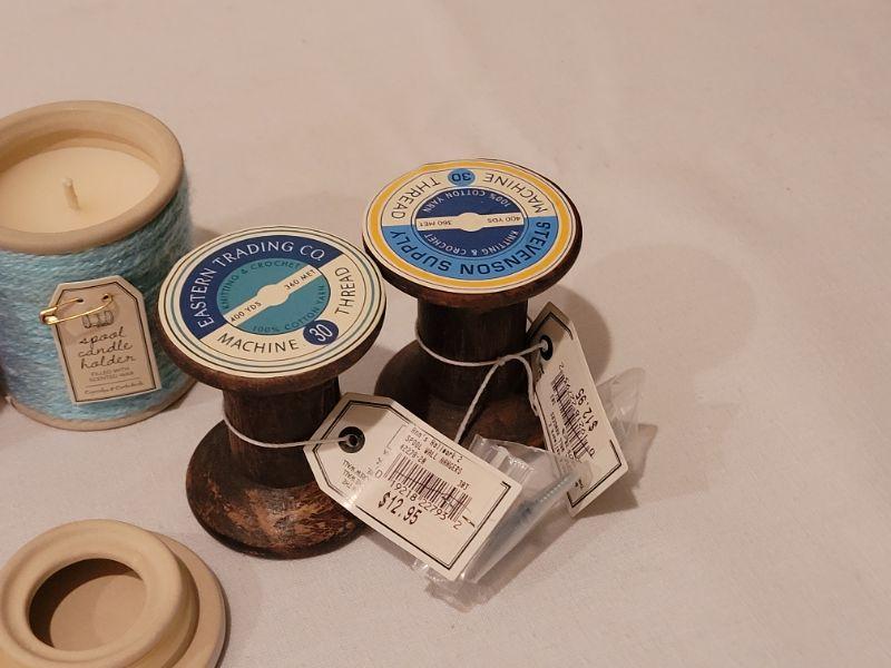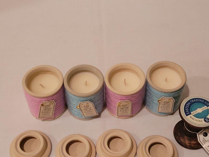 Lot 286: New (4) Small Spool Candles and Spool Deco Hangers