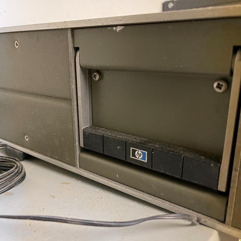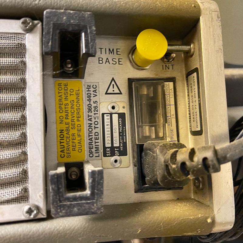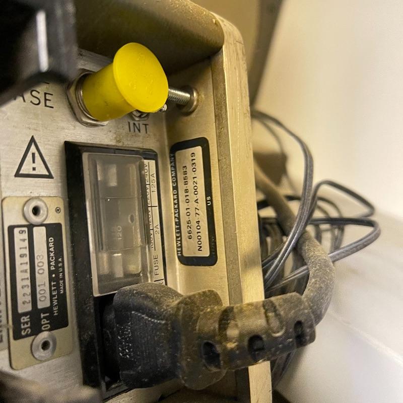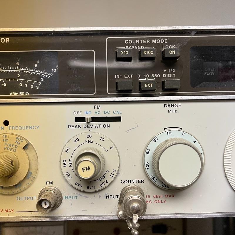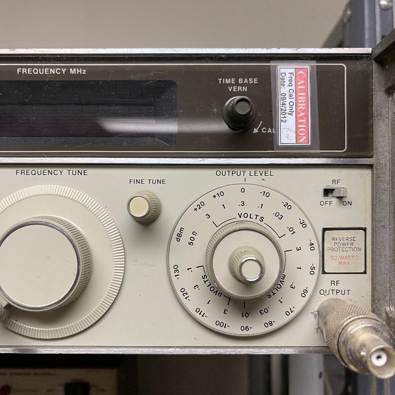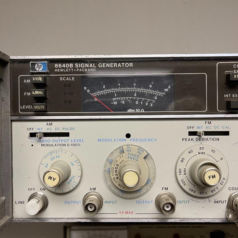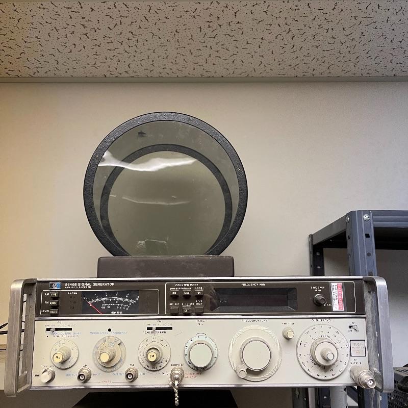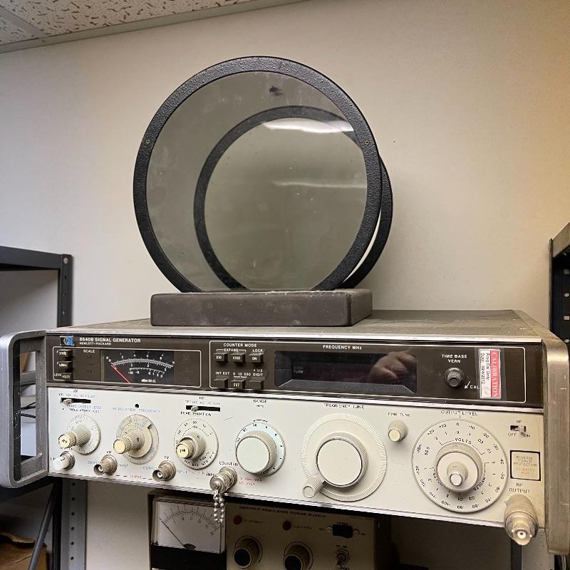 HP 8640B signal generator and more. One opaque circle and one transparent circle sitting on a wooden base.