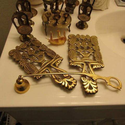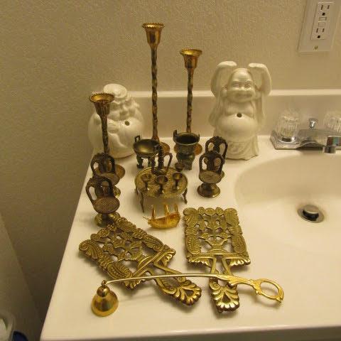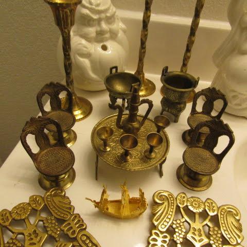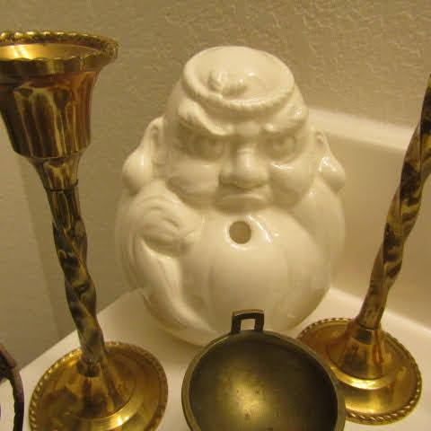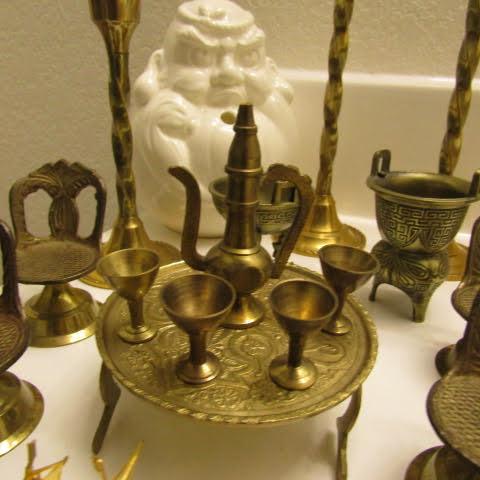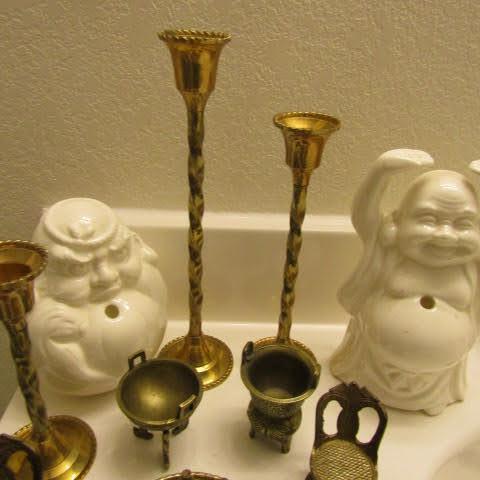BRASS SET OF CEREMONIAL ALTER DECOR. POSSIBLY INCENSE HOLDERS. WHITE CERAMIC BUDDHA FIGURINES. VARIOUS SIZES AND PIECES.