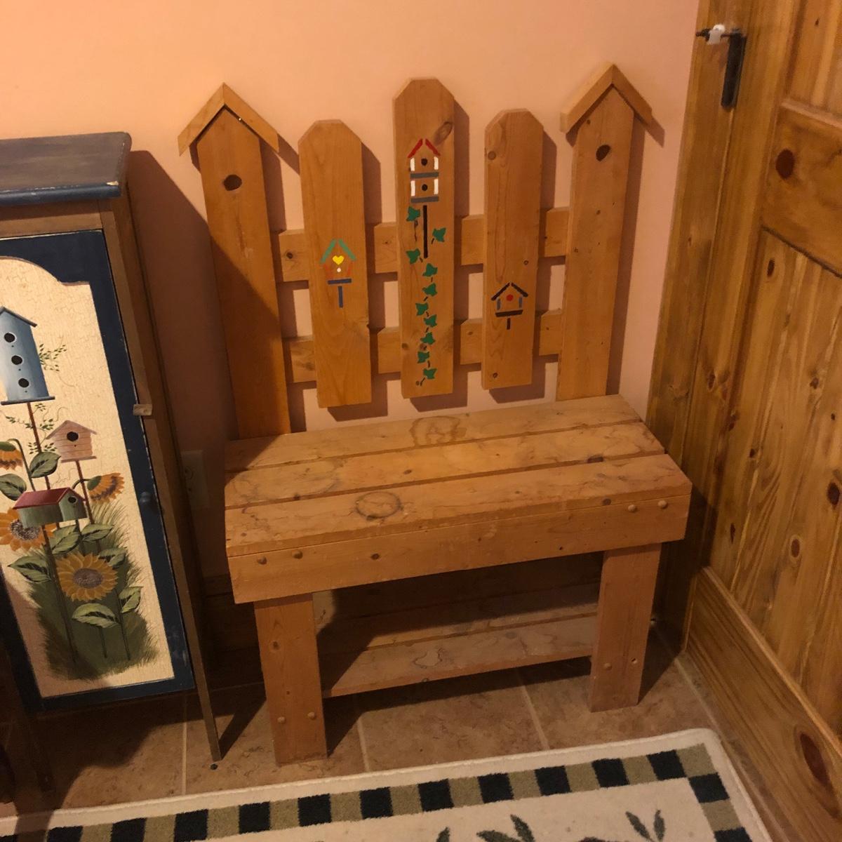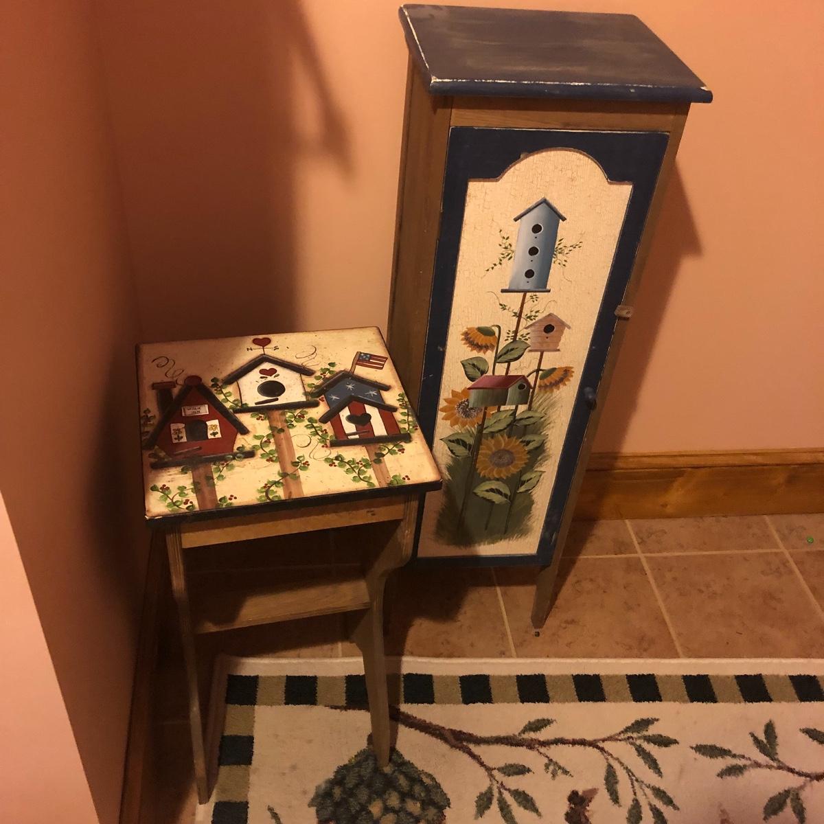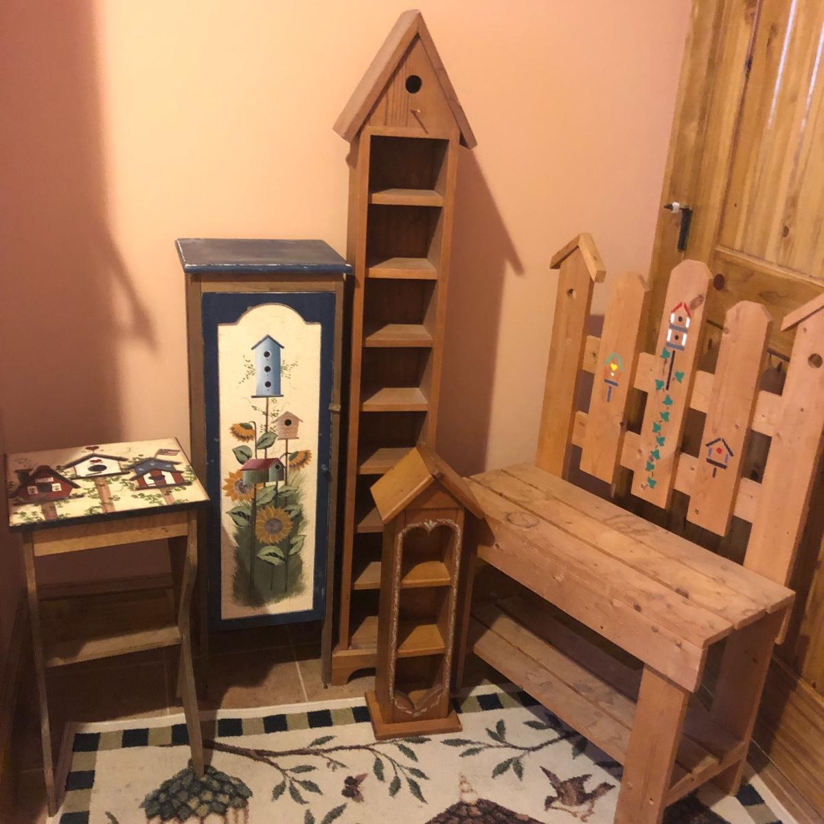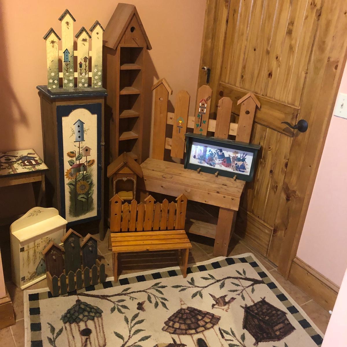 This large assortment of mostly wood items all have one thing in common; they are adorned with birdhouse art. The larger pine bench measures 12” deep x 32” wide x 42” tall and is fairly sturdy for sitting on; it does have some water marks that could potentially be sanded out. The smaller bench is decorative only. Also included is a rug, some cabinets, a small green coat/key hook, shelves and more. The two shelf units appear to be solid pine along with the benches. Everything else appears to be pressed wood.