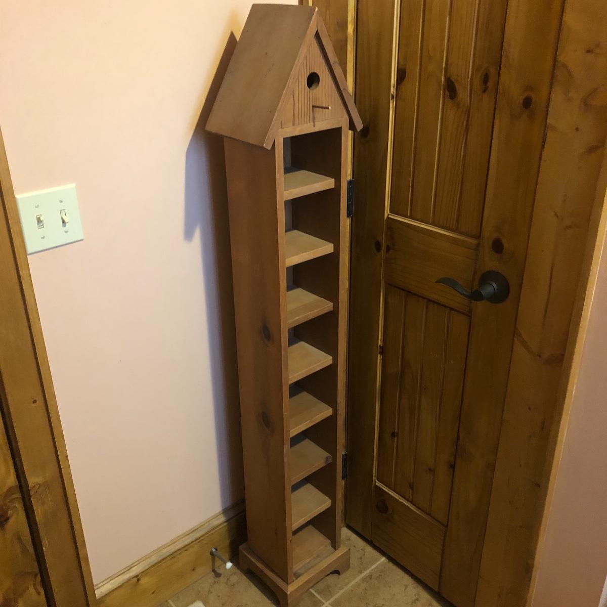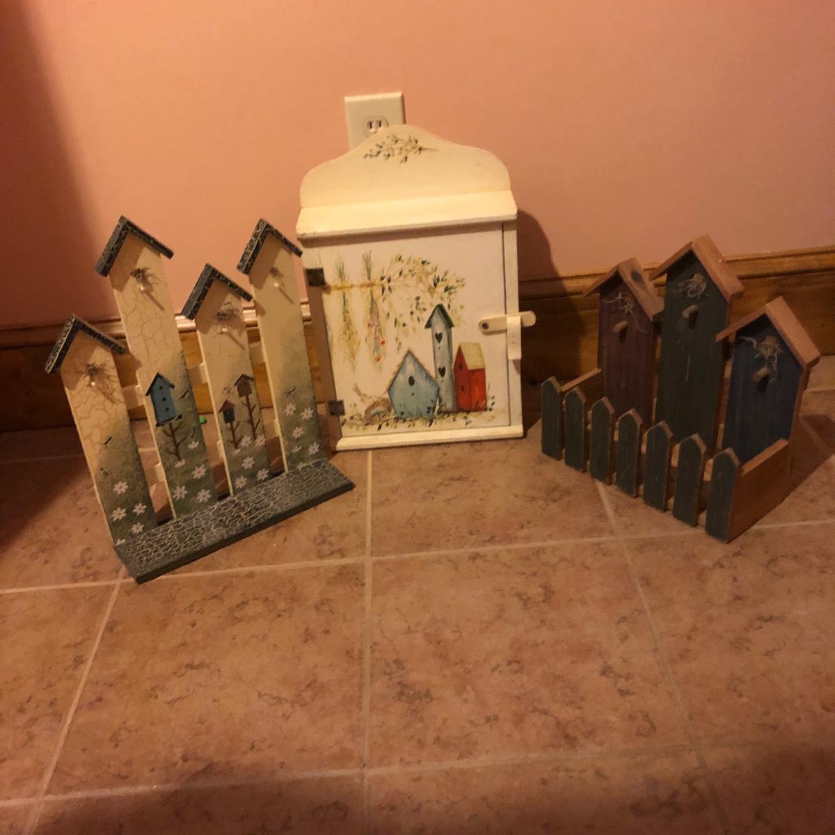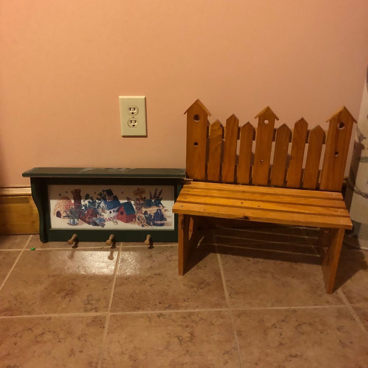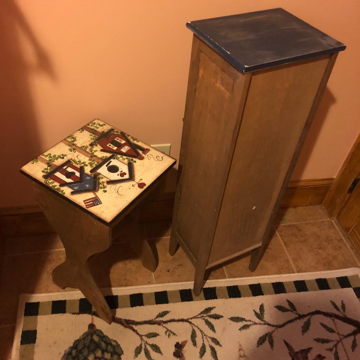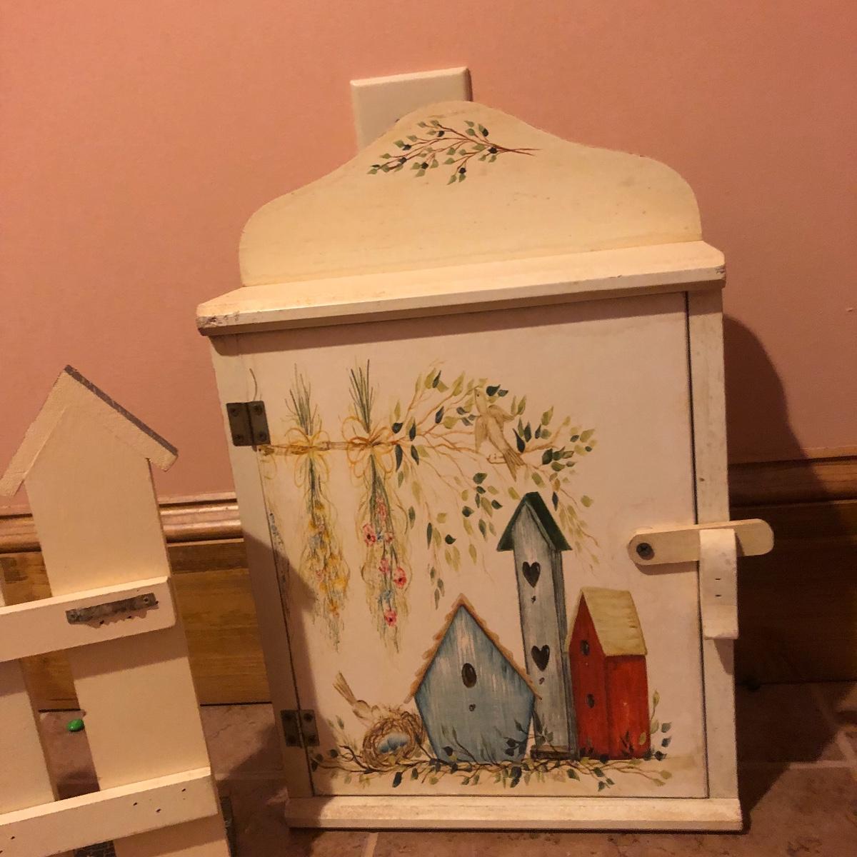 This large assortment of mostly wood items all have one thing in common; they are adorned with birdhouse art. The larger pine bench measures 12” deep x 32” wide x 42” tall and is fairly sturdy for sitting on; it does have some water marks that could potentially be sanded out. The smaller bench is decorative only. Also included is a rug, some cabinets, a small green coat/key hook, shelves and more. The two shelf units appear to be solid pine along with the benches. Everything else appears to be pressed wood.