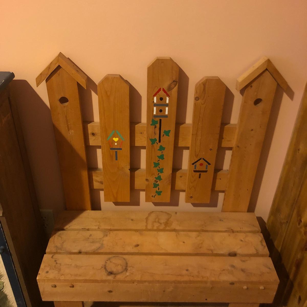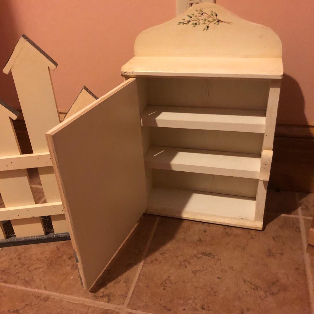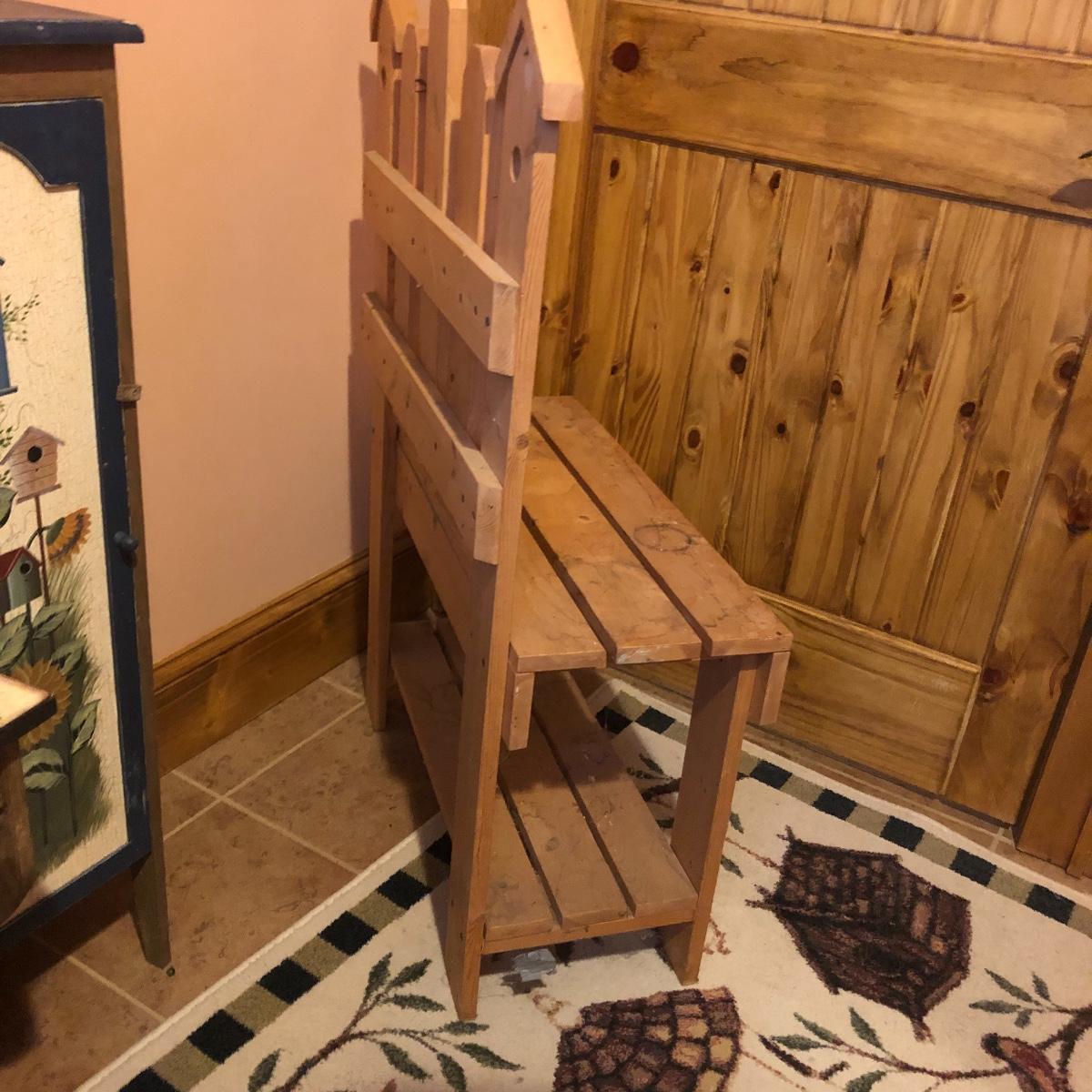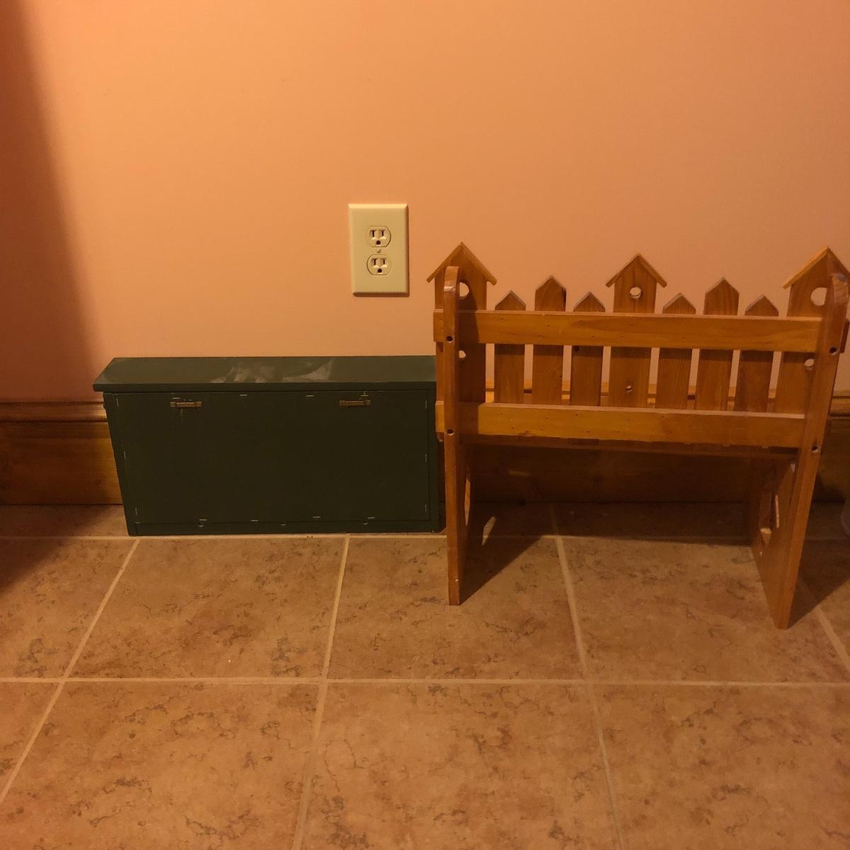 This large assortment of mostly wood items all have one thing in common; they are adorned with birdhouse art. The larger pine bench measures 12” deep x 32” wide x 42” tall and is fairly sturdy for sitting on; it does have some water marks that could potentially be sanded out. The smaller bench is decorative only. Also included is a rug, some cabinets, a small green coat/key hook, shelves and more. The two shelf units appear to be solid pine along with the benches. Everything else appears to be pressed wood.