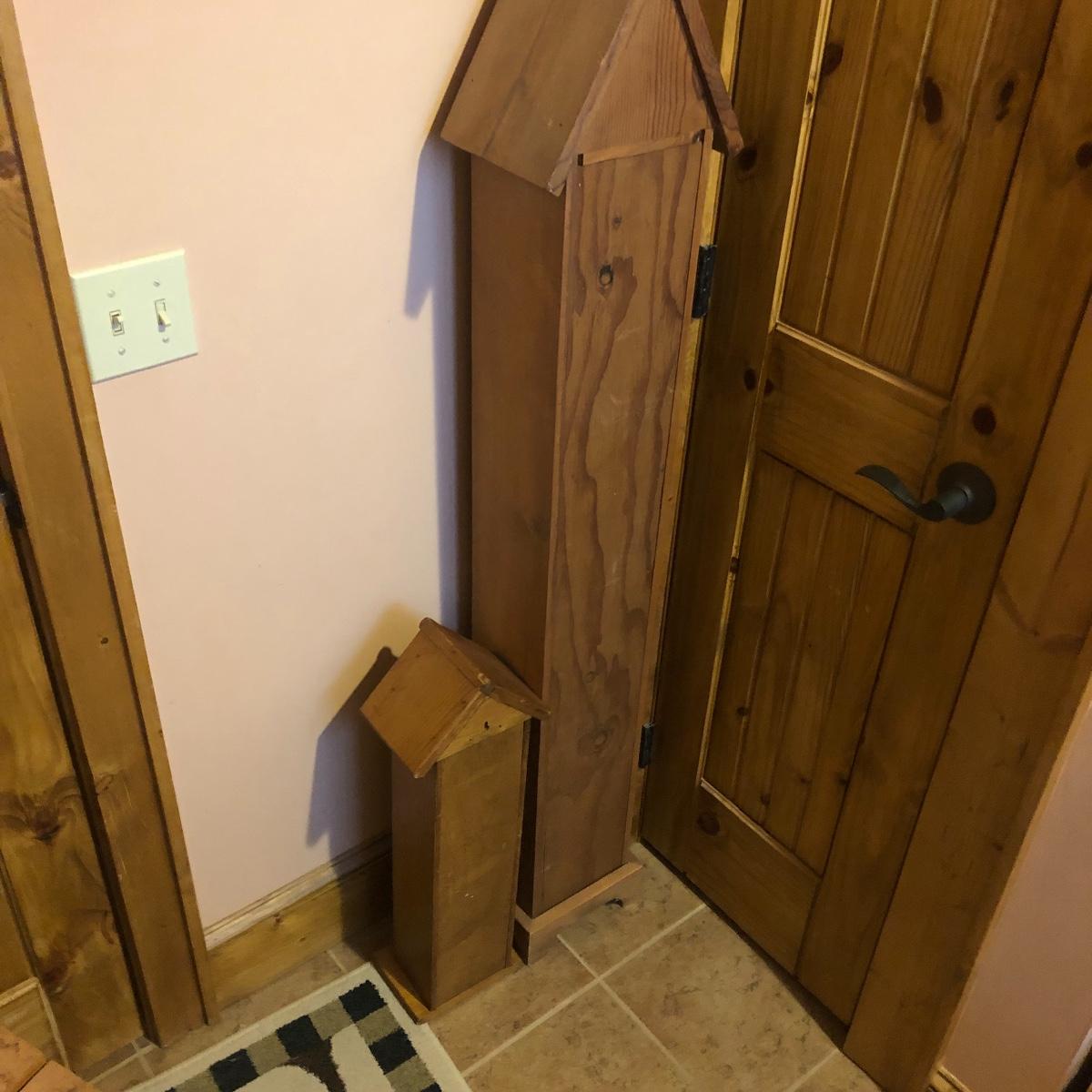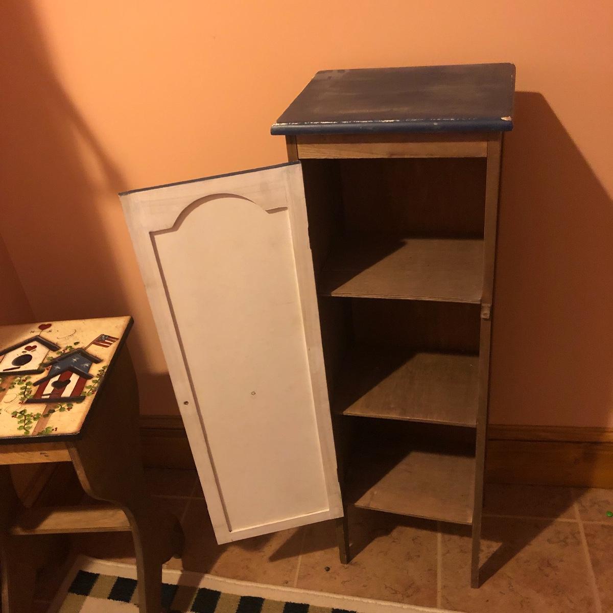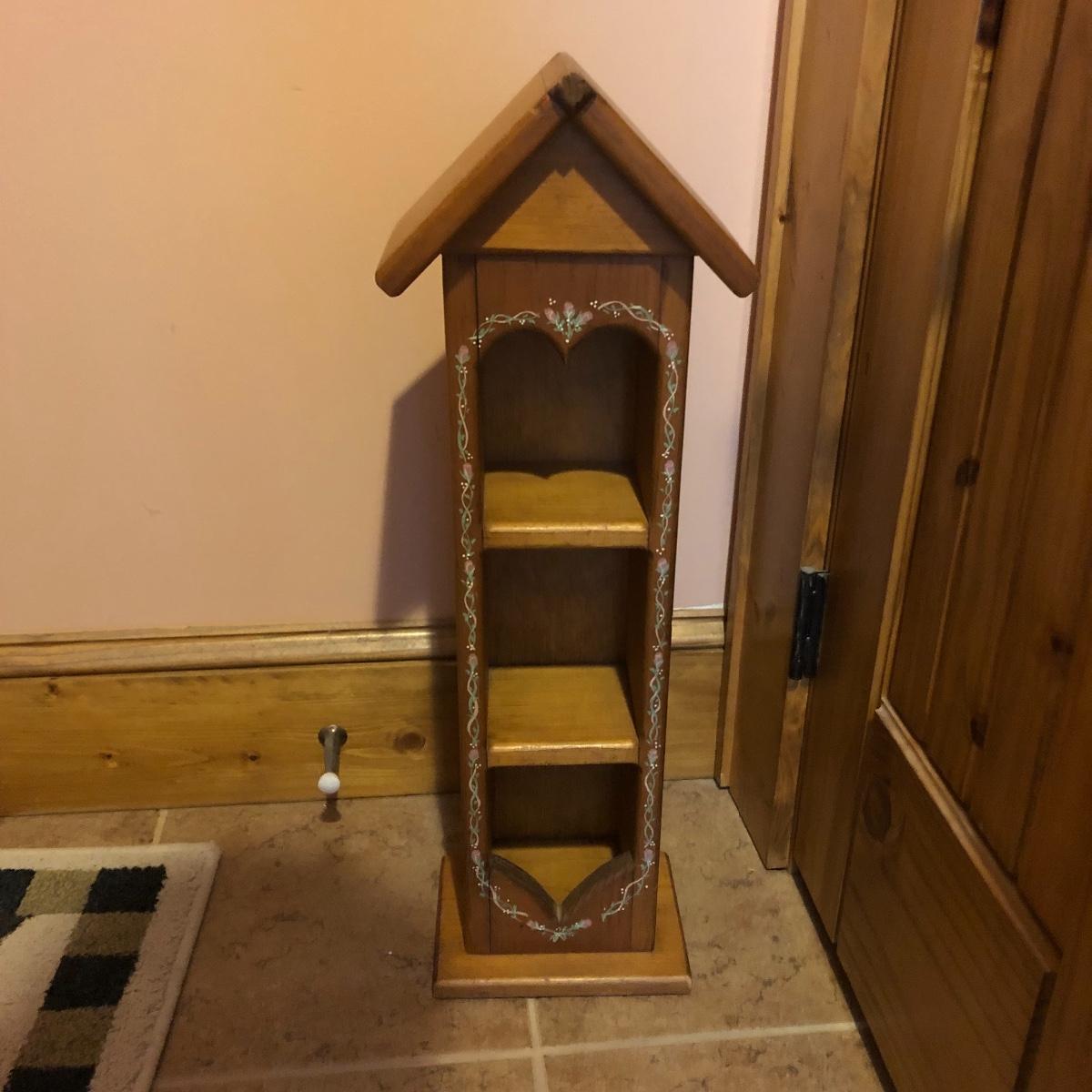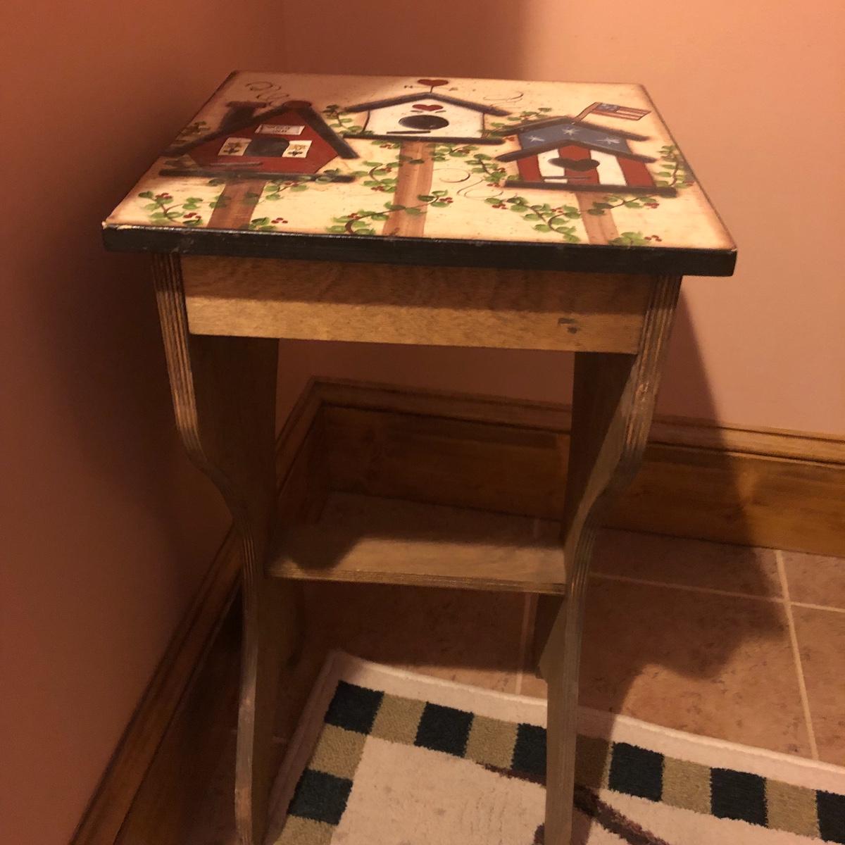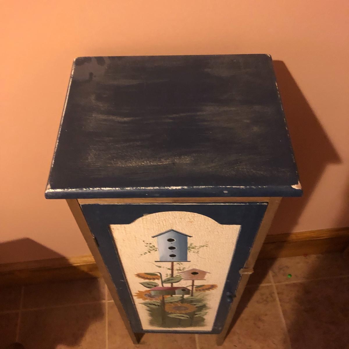 This large assortment of mostly wood items all have one thing in common; they are adorned with birdhouse art. The larger pine bench measures 12” deep x 32” wide x 42” tall and is fairly sturdy for sitting on; it does have some water marks that could potentially be sanded out. The smaller bench is decorative only. Also included is a rug, some cabinets, a small green coat/key hook, shelves and more. The two shelf units appear to be solid pine along with the benches. Everything else appears to be pressed wood.