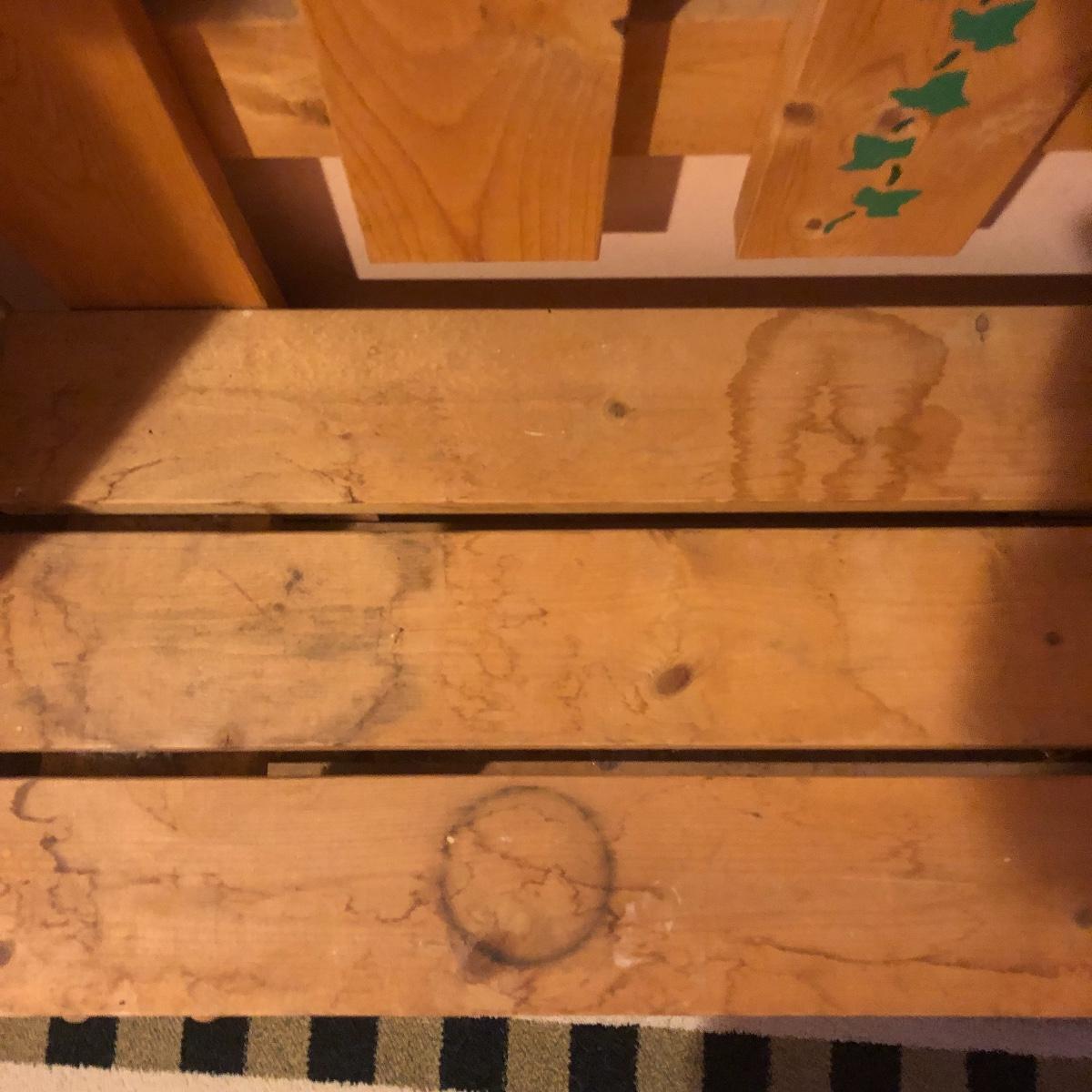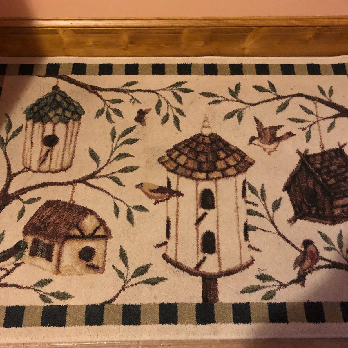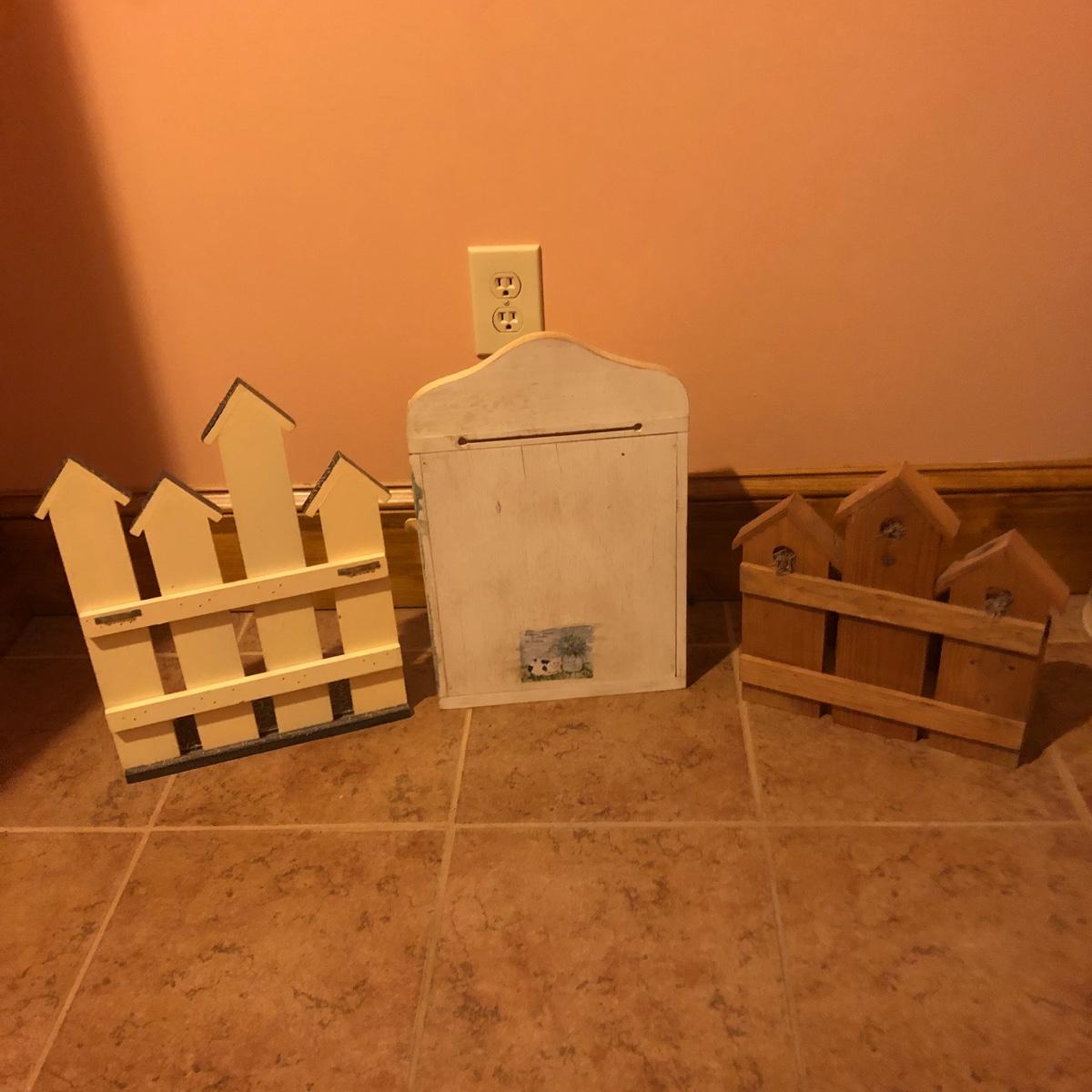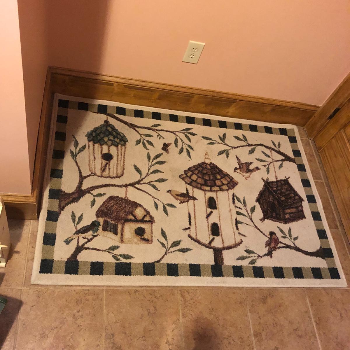 This large assortment of mostly wood items all have one thing in common; they are adorned with birdhouse art. The larger pine bench measures 12” deep x 32” wide x 42” tall and is fairly sturdy for sitting on; it does have some water marks that could potentially be sanded out. The smaller bench is decorative only. Also included is a rug, some cabinets, a small green coat/key hook, shelves and more. The two shelf units appear to be solid pine along with the benches. Everything else appears to be pressed wood.