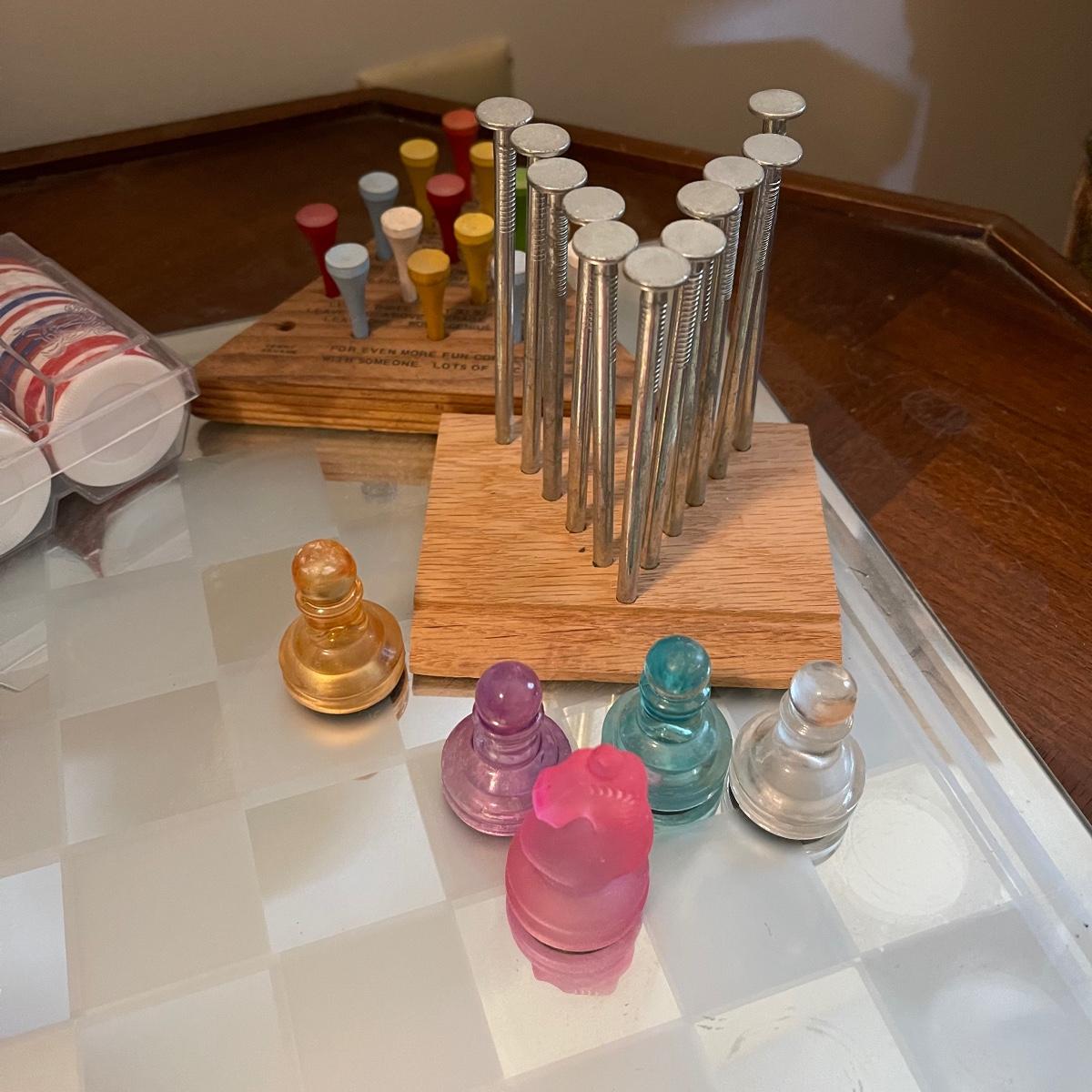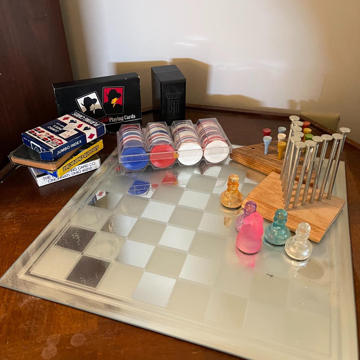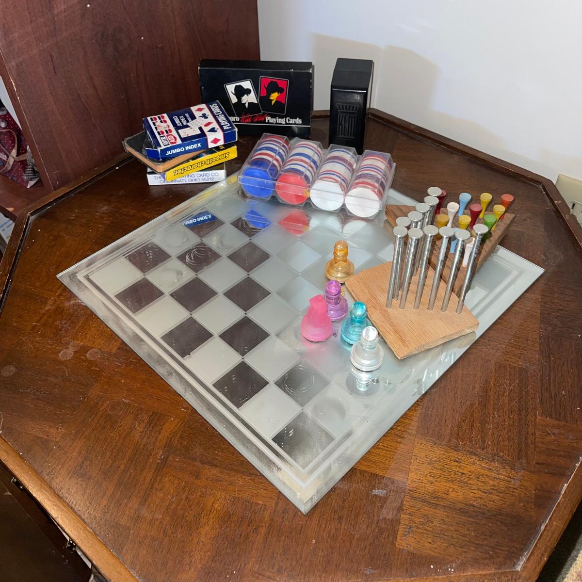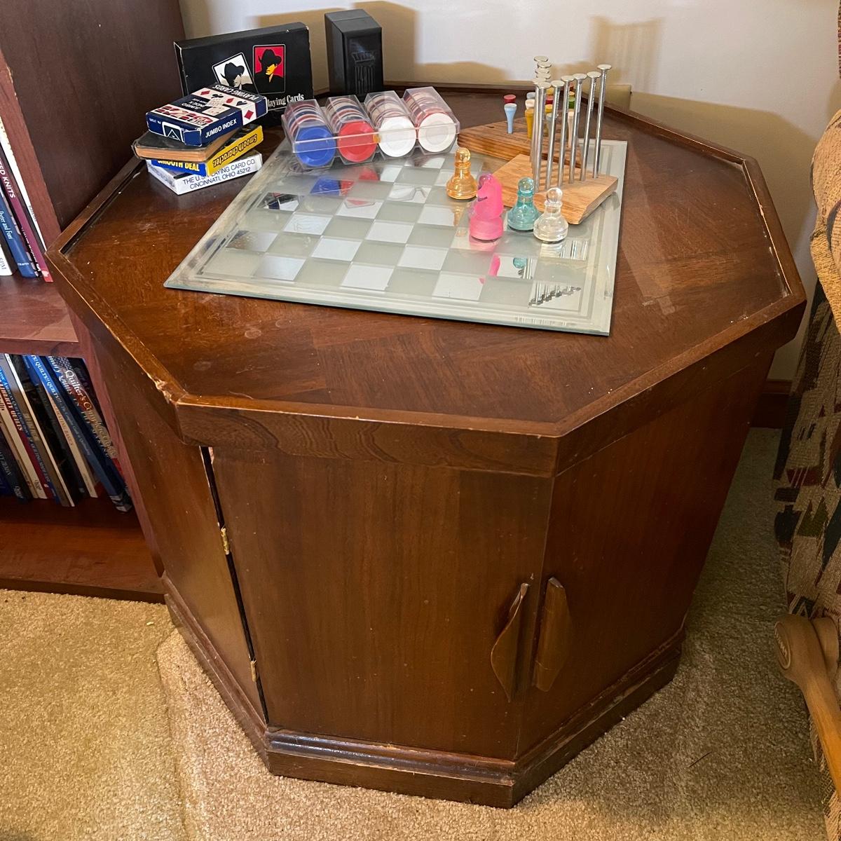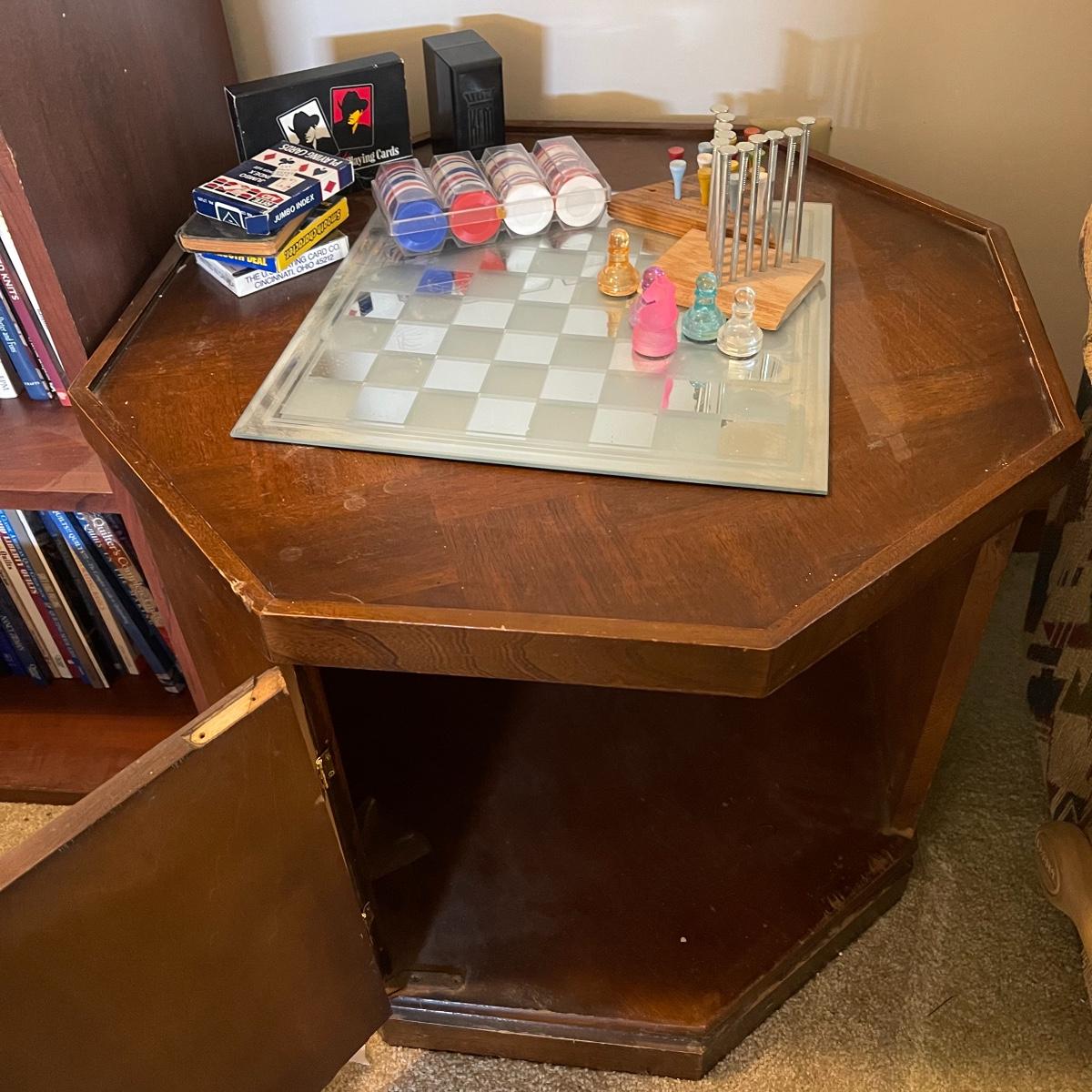 Get your game on with this glass chessboard and colored glass pieces, decks of cards, poker chips, handheld solitaire, and handmade bar games. Included with the games is an octagonal side table and cabinet. It is a darker colored wood and it has a door that opens up for storage space; ideal for storing games! It measures 20” tall, 24” from one flat side to the opposite, and 26” from one angled corner to the opposite.