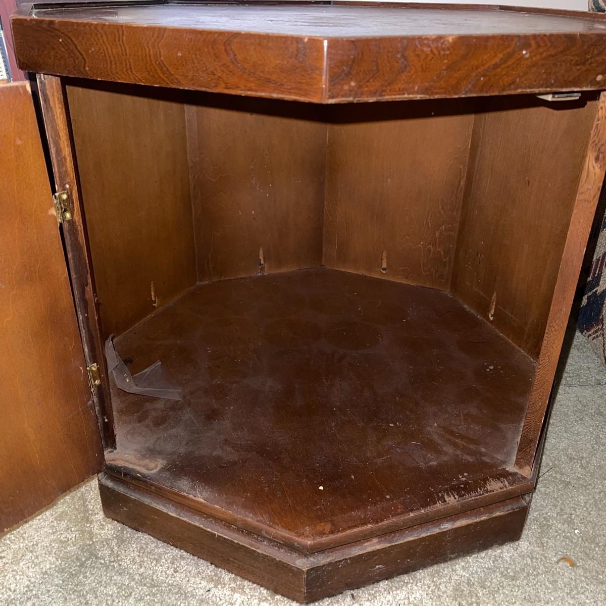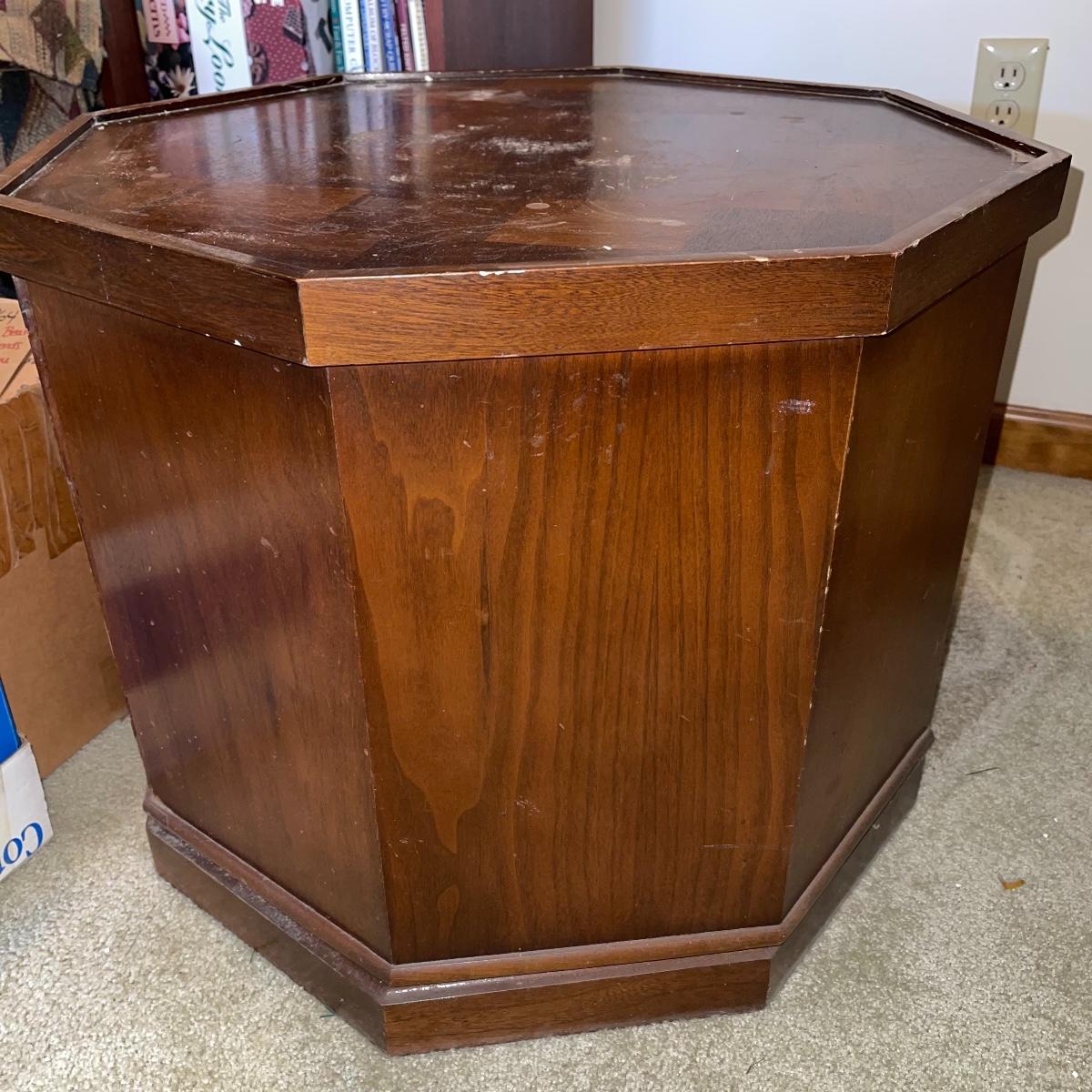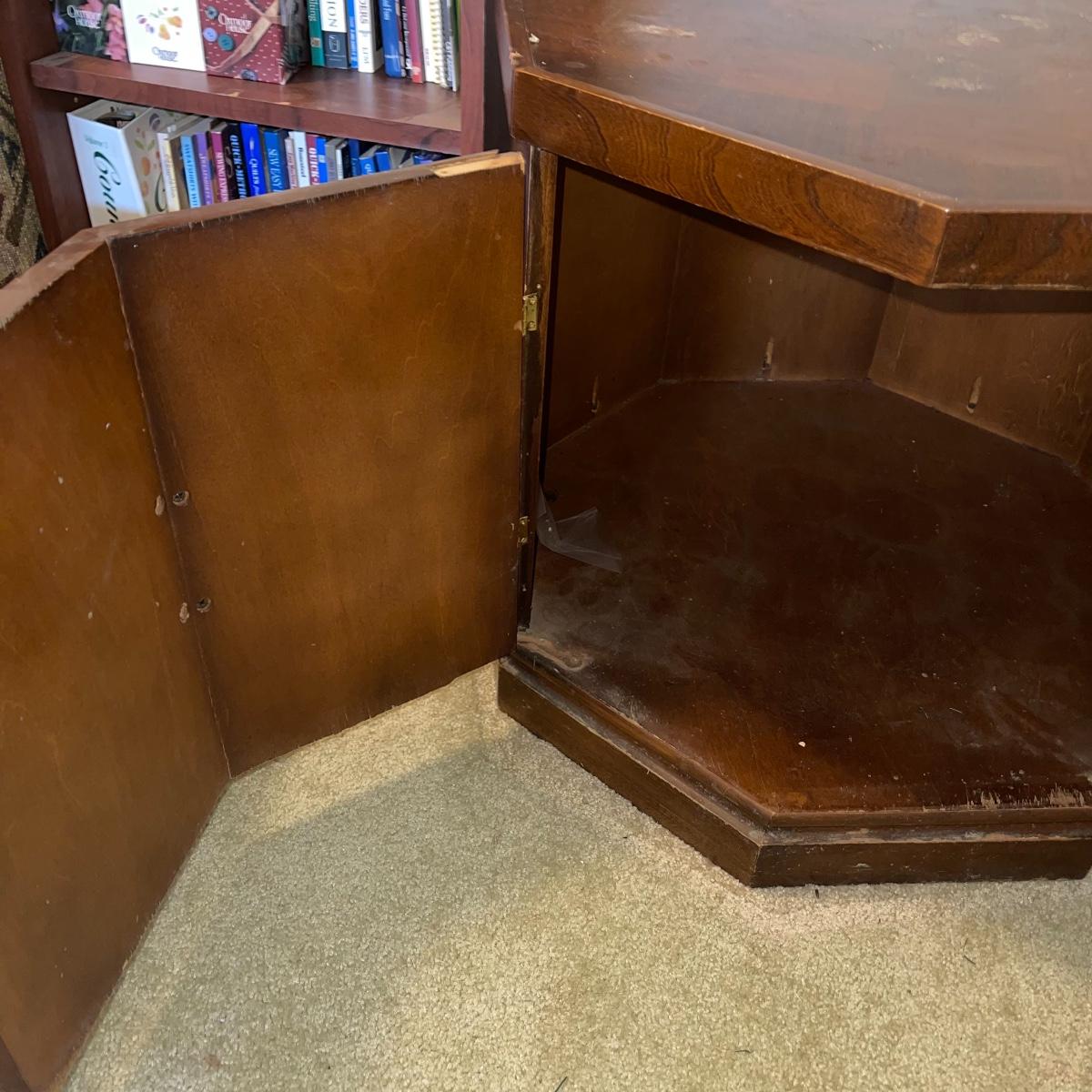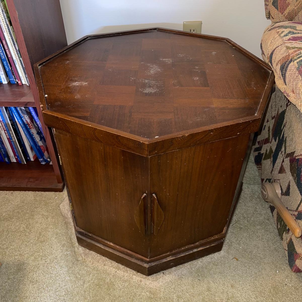 Get your game on with this glass chessboard and colored glass pieces, decks of cards, poker chips, handheld solitaire, and handmade bar games. Included with the games is an octagonal side table and cabinet. It is a darker colored wood and it has a door that opens up for storage space; ideal for storing games! It measures 20” tall, 24” from one flat side to the opposite, and 26” from one angled corner to the opposite.