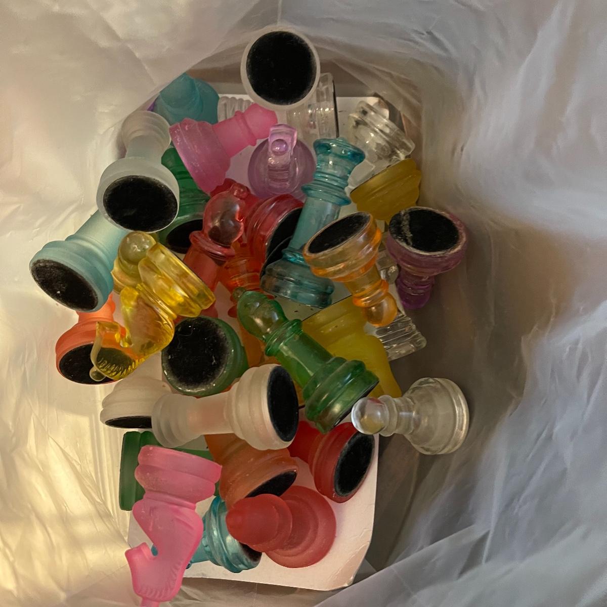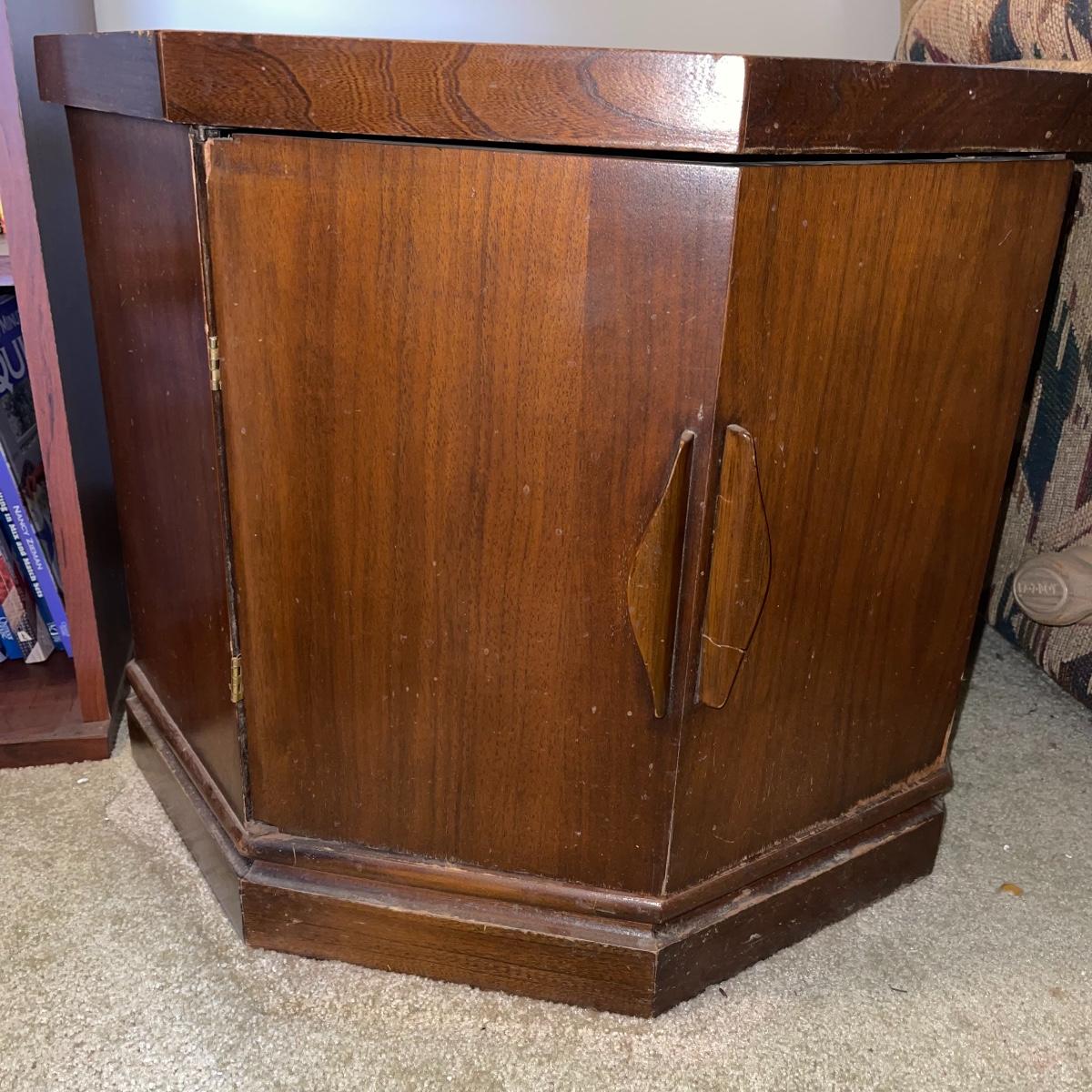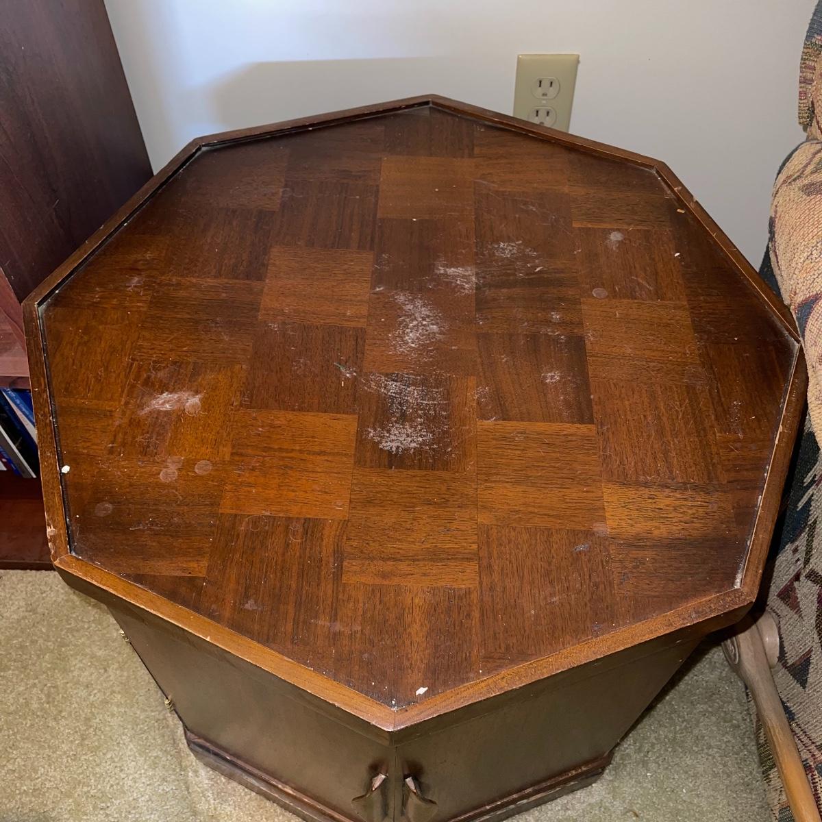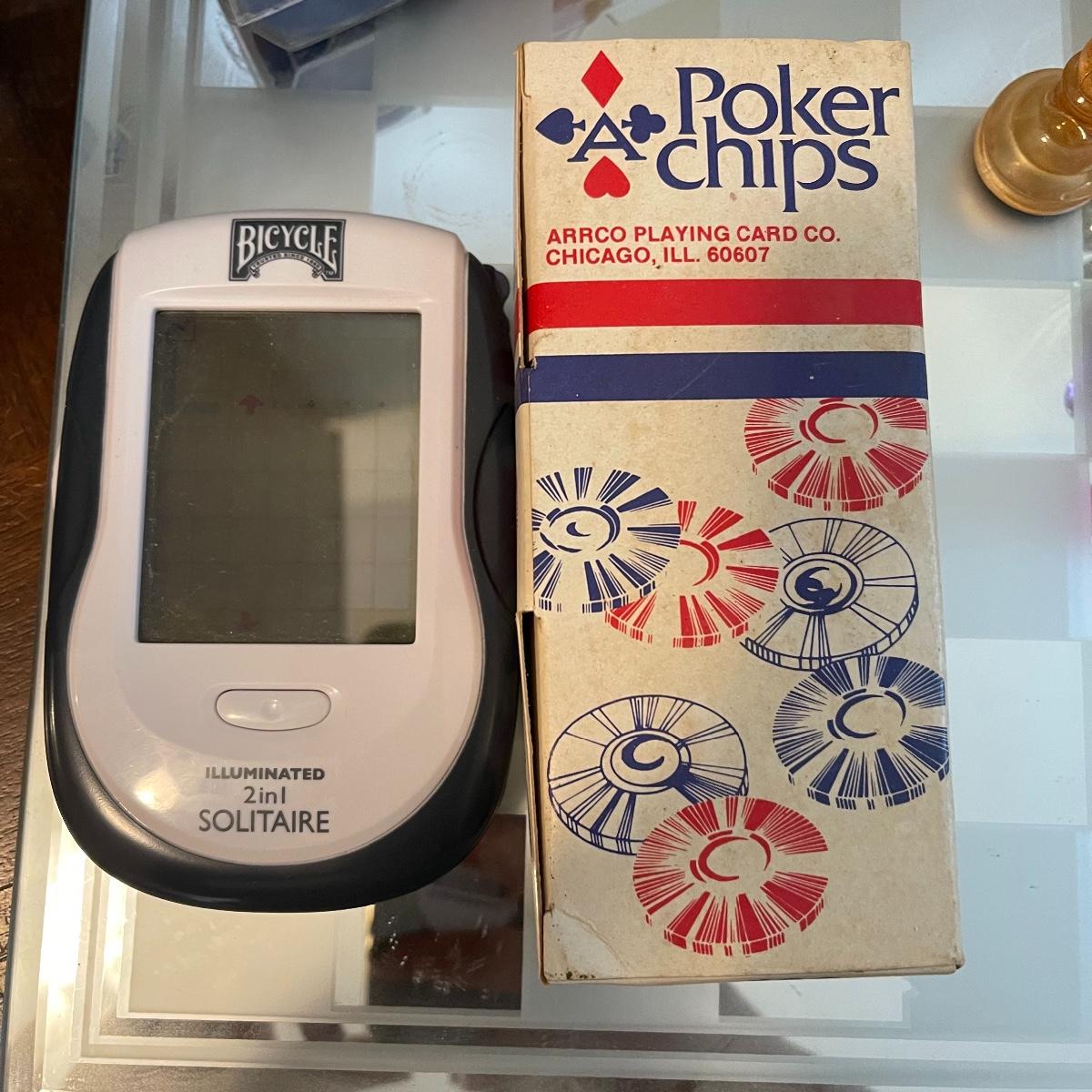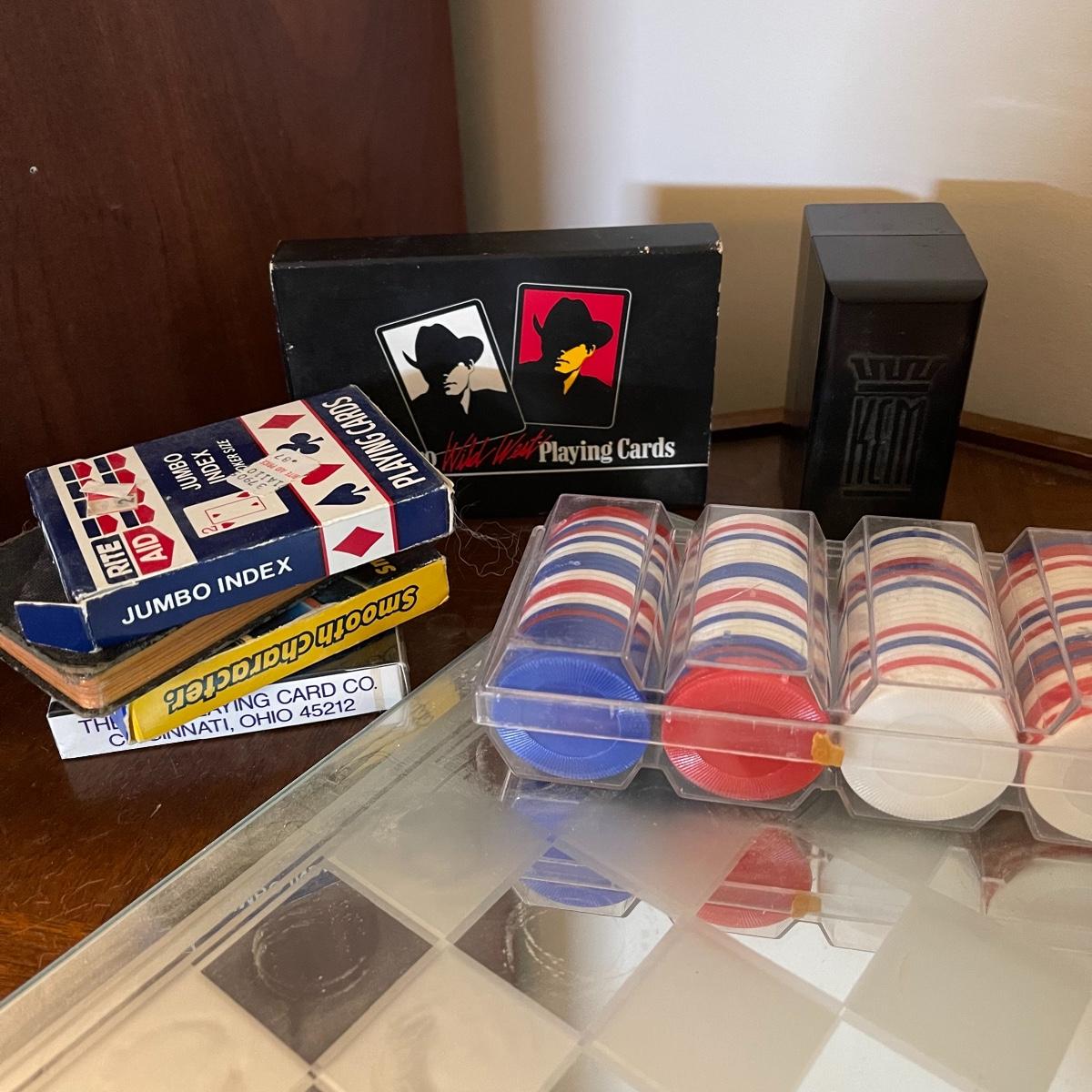 Get your game on with this glass chessboard and colored glass pieces, decks of cards, poker chips, handheld solitaire, and handmade bar games. Included with the games is an octagonal side table and cabinet. It is a darker colored wood and it has a door that opens up for storage space; ideal for storing games! It measures 20” tall, 24” from one flat side to the opposite, and 26” from one angled corner to the opposite.