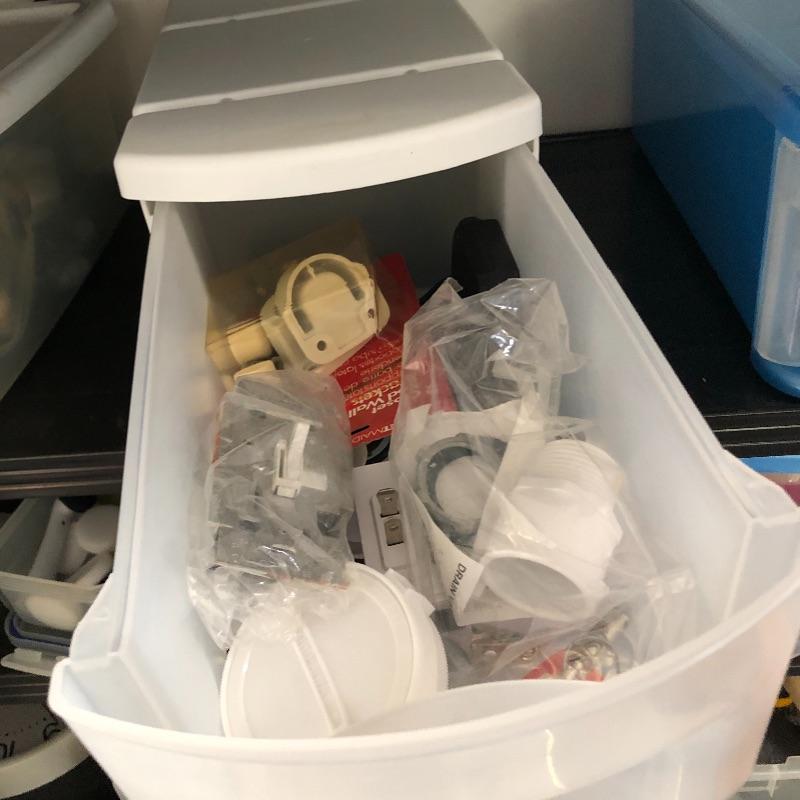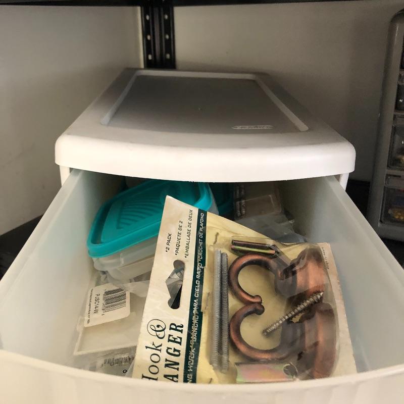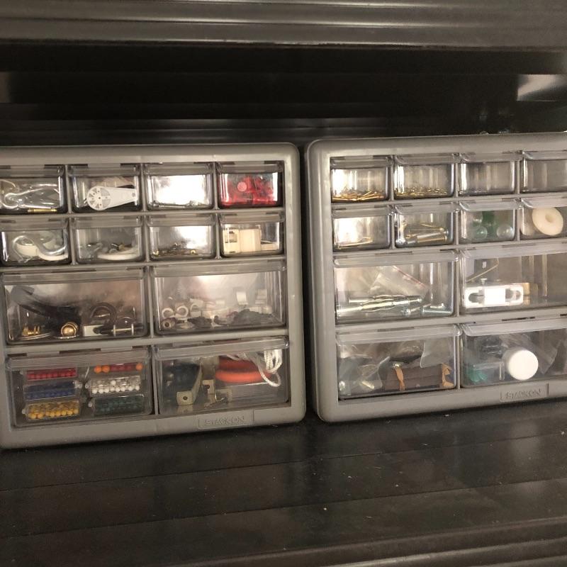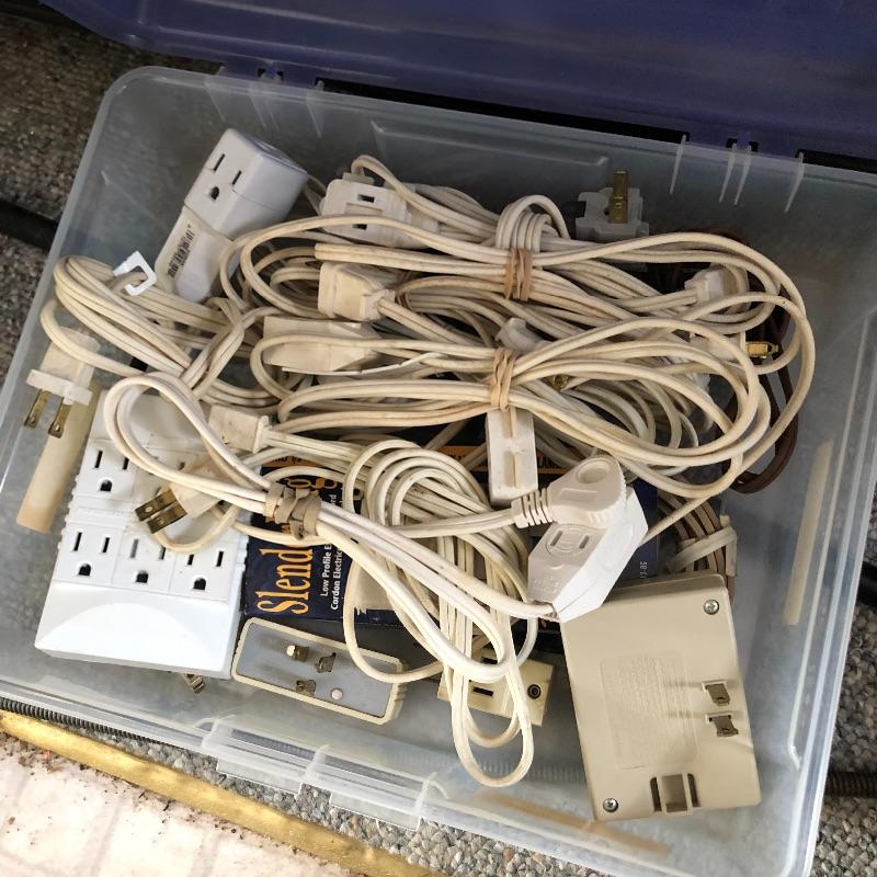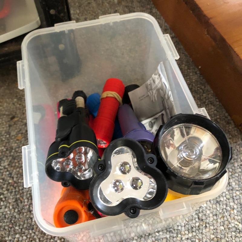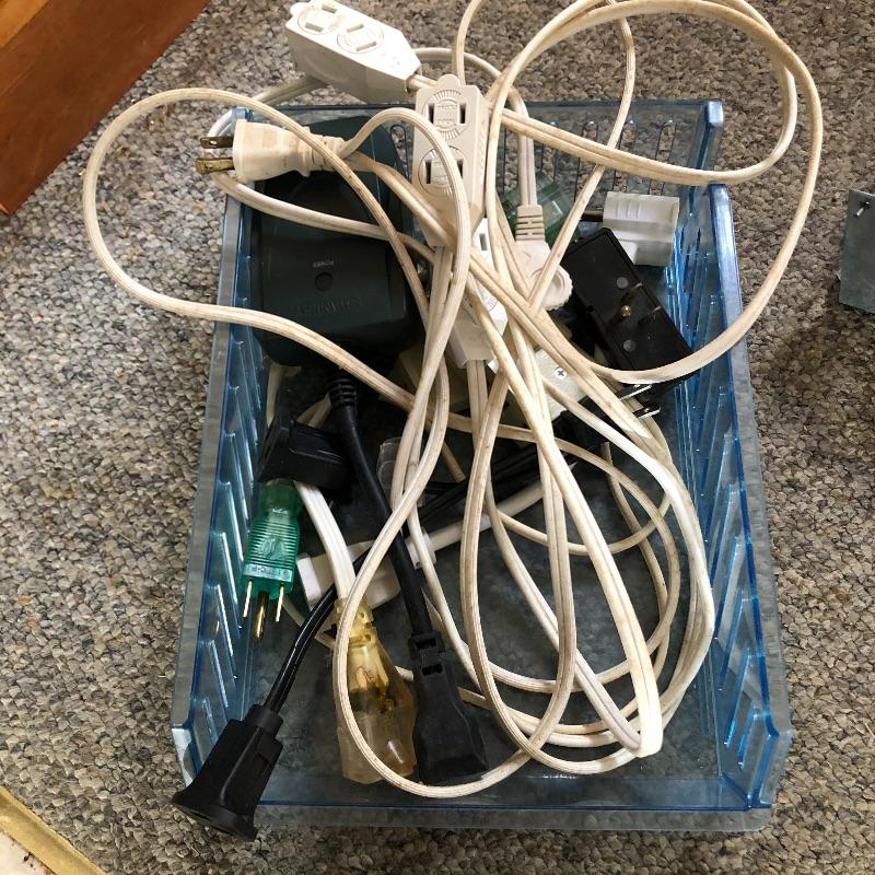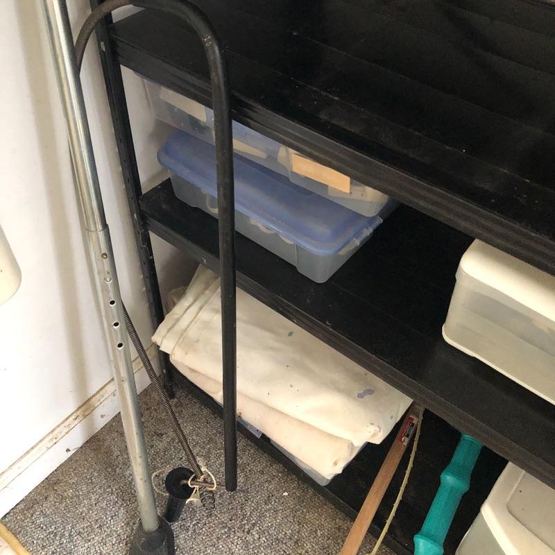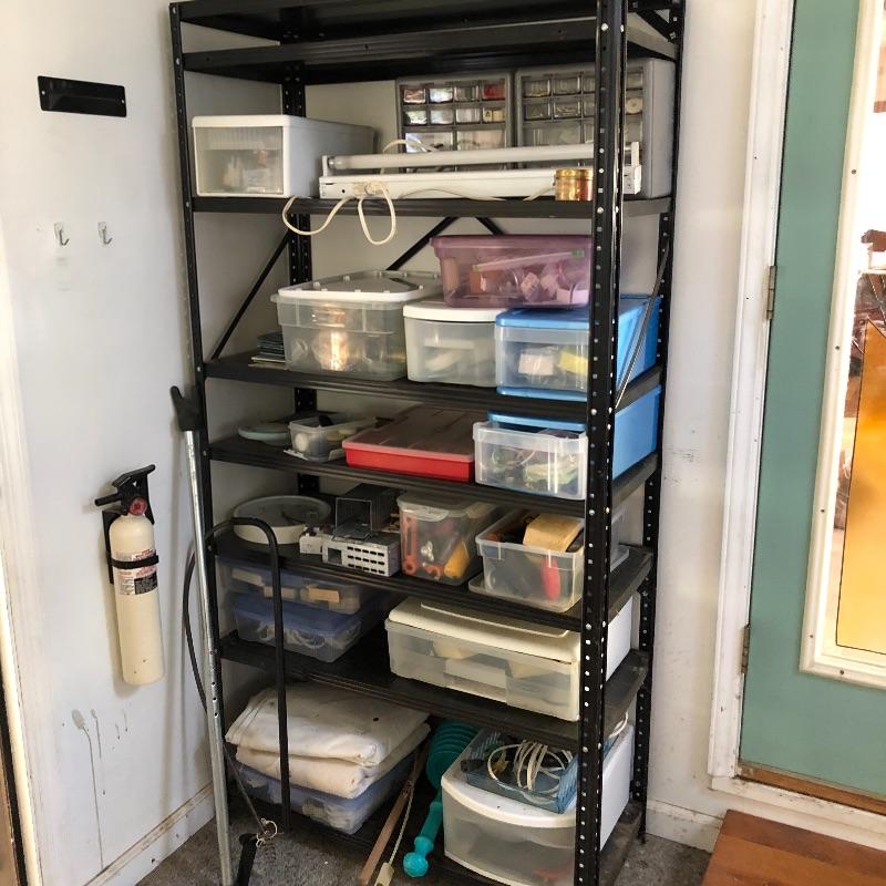 This lot includes so much! It includes seventeen containers of items! Items include an overhead light, flashlights, all kinds of hardware, canvas drop cloths, extension cords, mouse traps and so much more!! The shelf unit measures approximately 36” x 16” x 70.5”. The fire extinguisher on the wall is not included in this lot. Local pick up only.