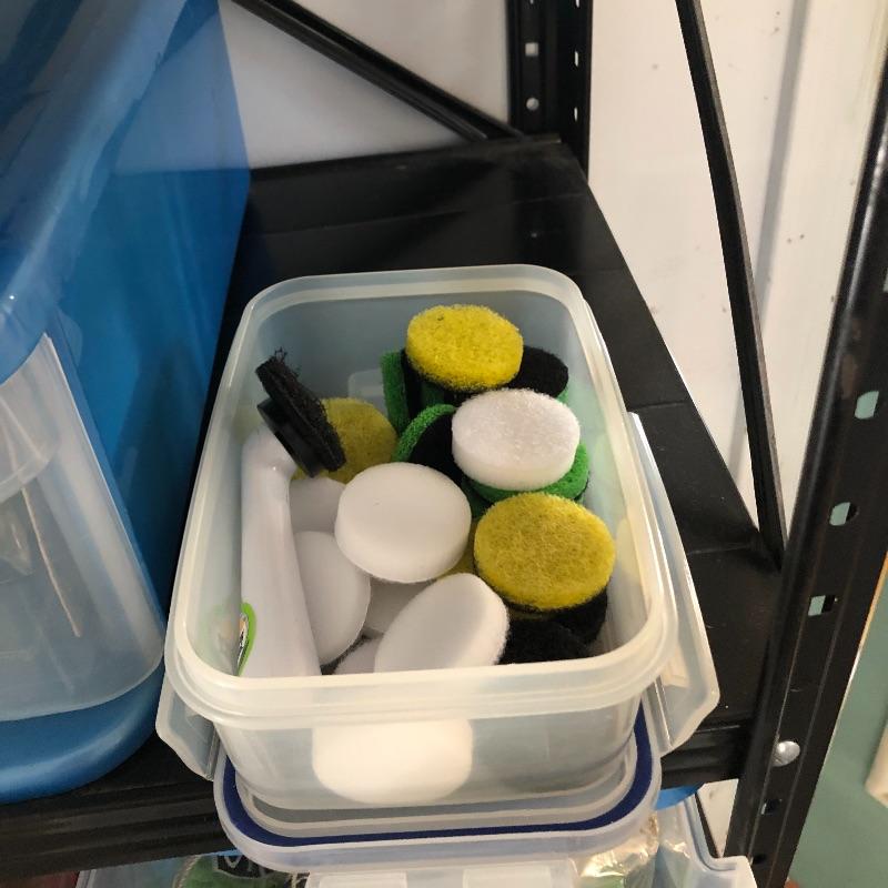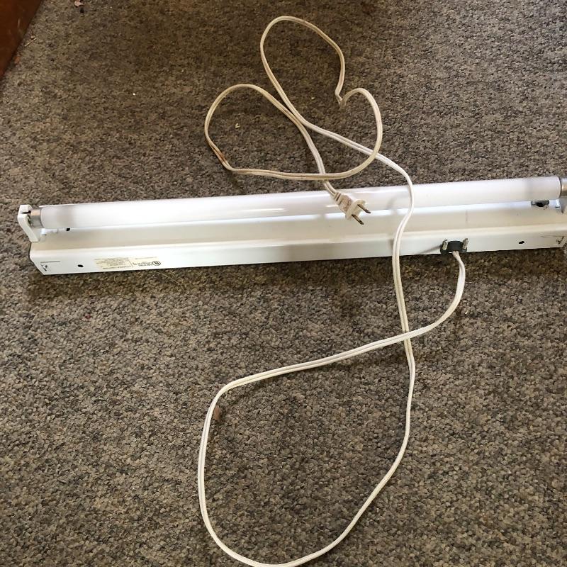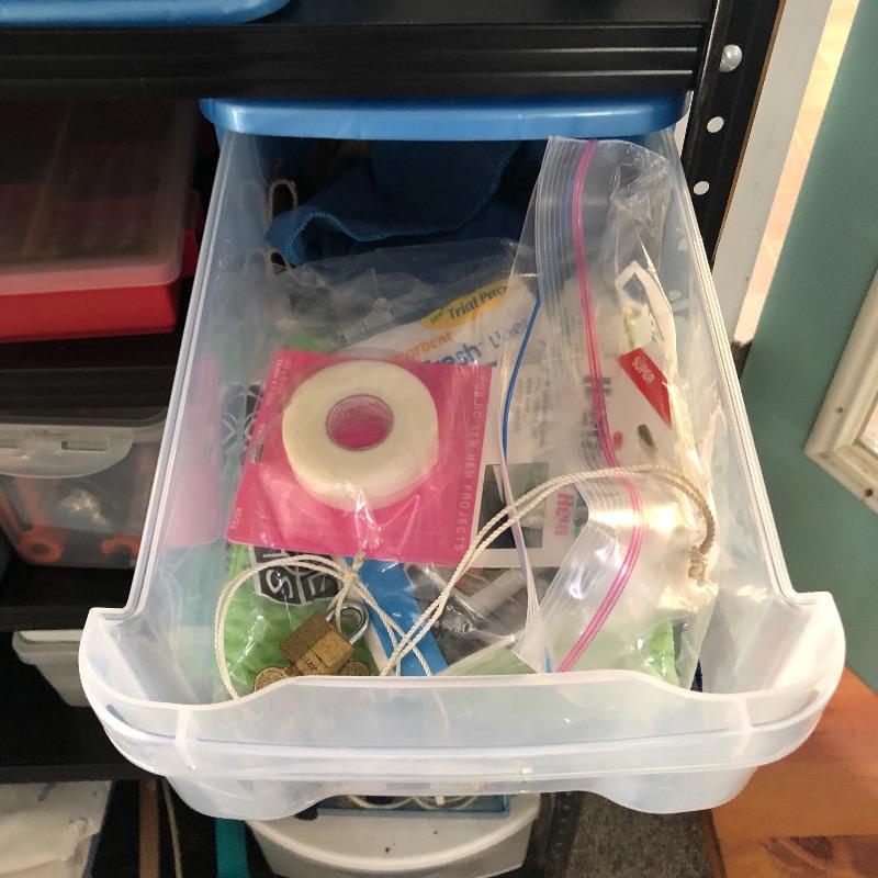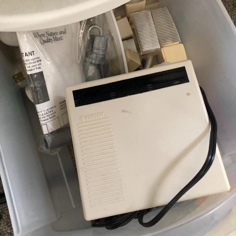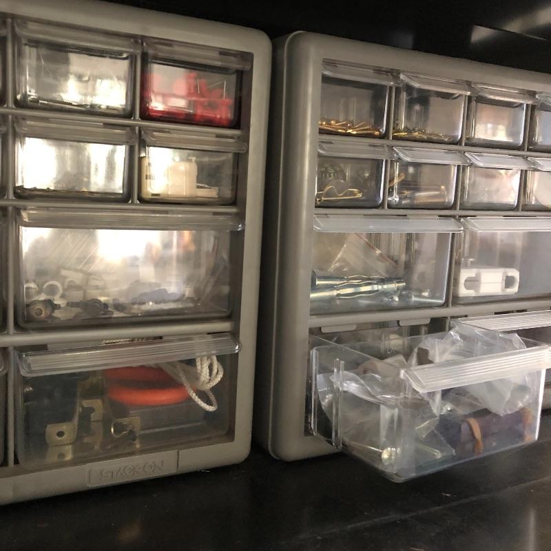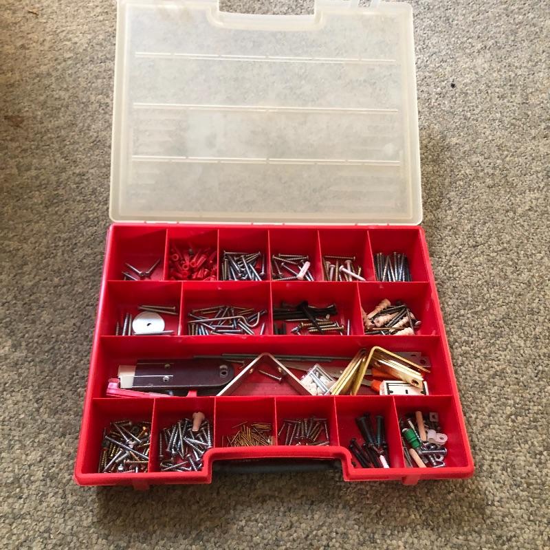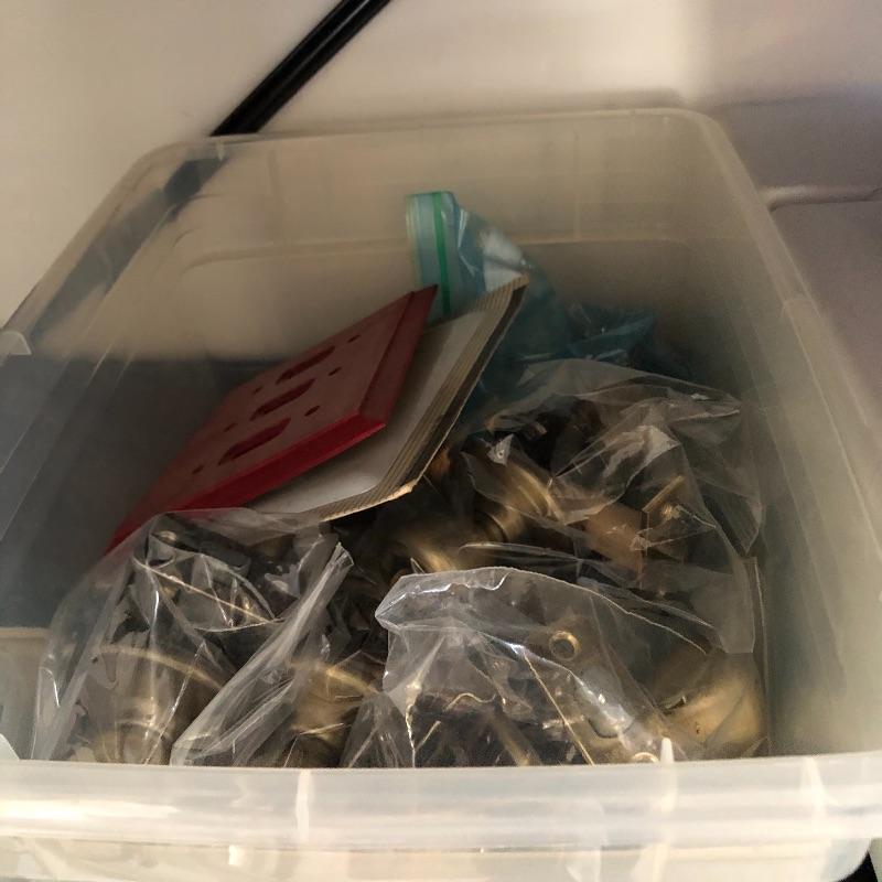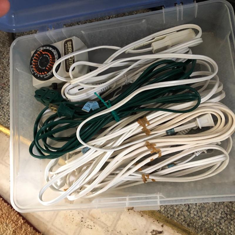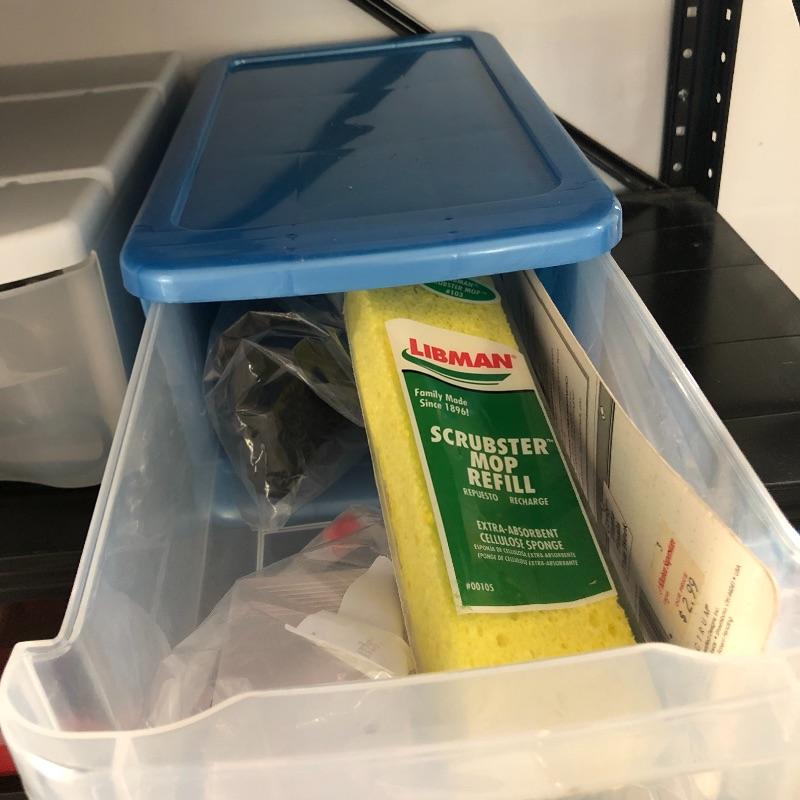 This lot includes so much! It includes seventeen containers of items! Items include an overhead light, flashlights, all kinds of hardware, canvas drop cloths, extension cords, mouse traps and so much more!! The shelf unit measures approximately 36” x 16” x 70.5”. The fire extinguisher on the wall is not included in this lot. Local pick up only.