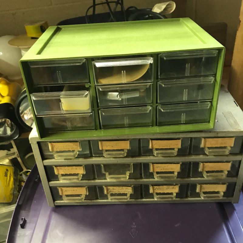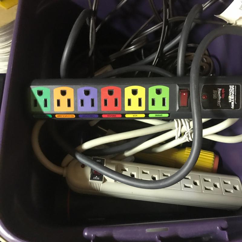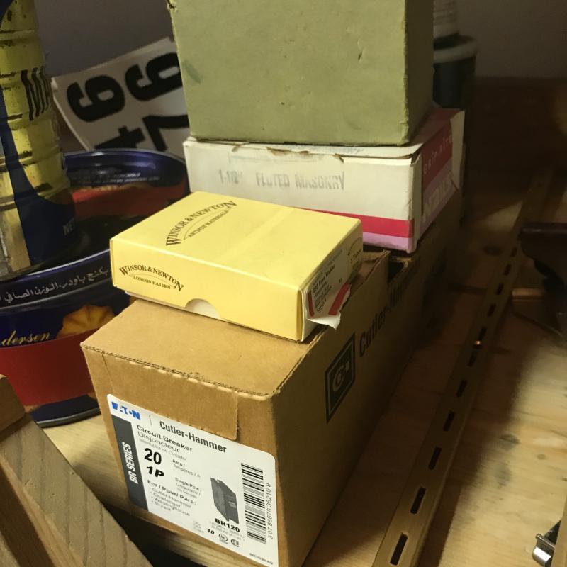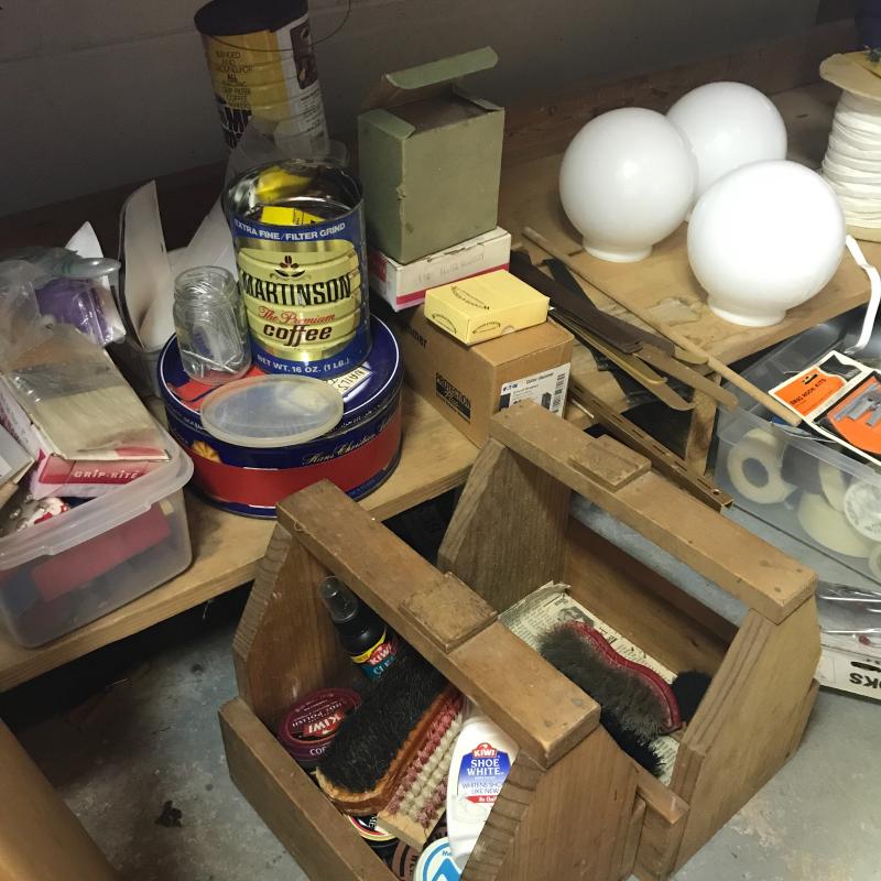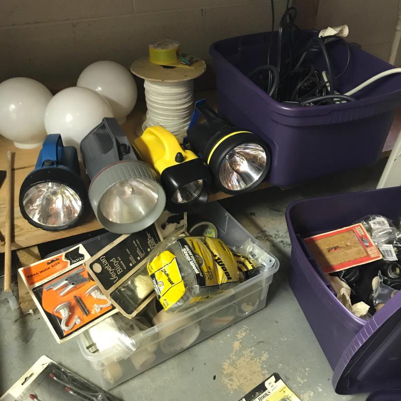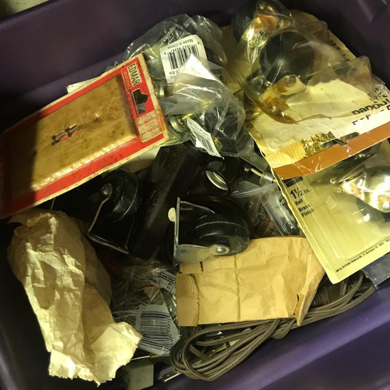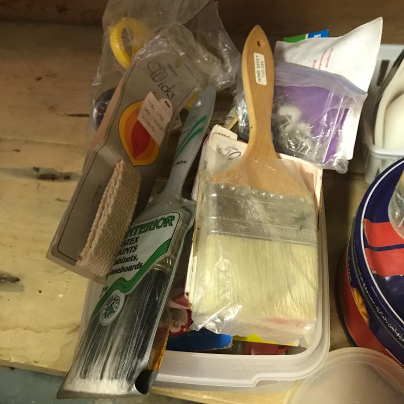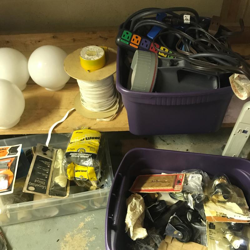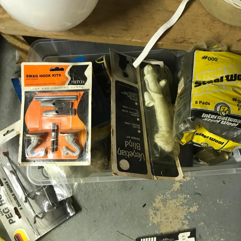We’ve got flashlights, surge protectors, paint brushes, shoe shine kits, box tape, circuit breaker, house numbers, glass globes, storage bins/ cabinet full of hooks, nails and screws. This lot has a little bit of everything. No shipping.
