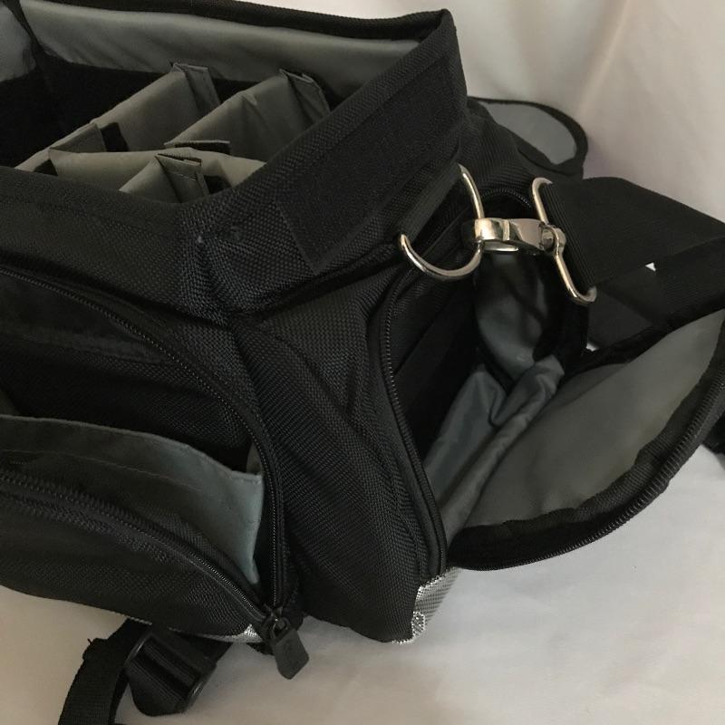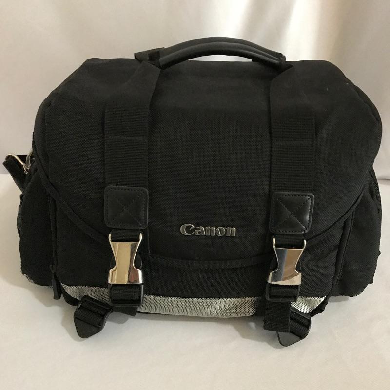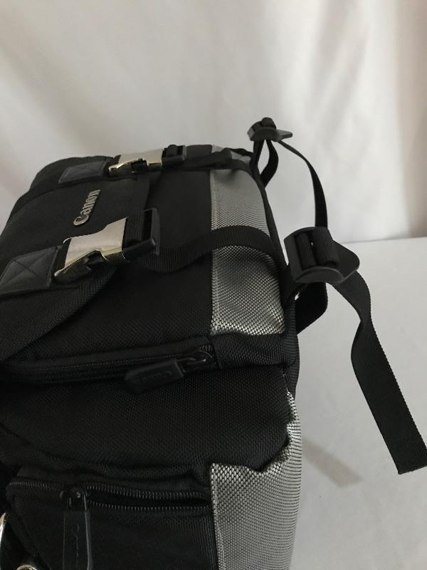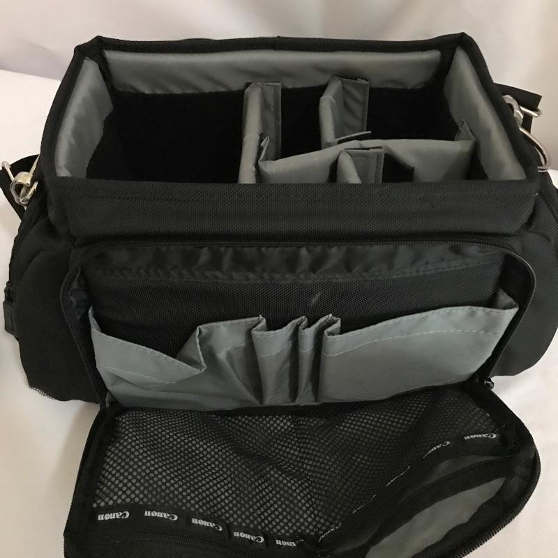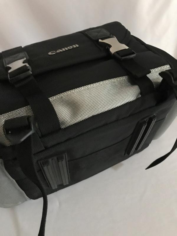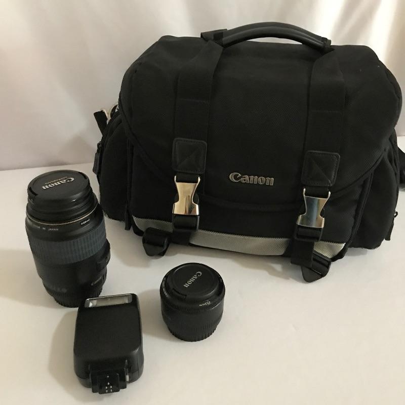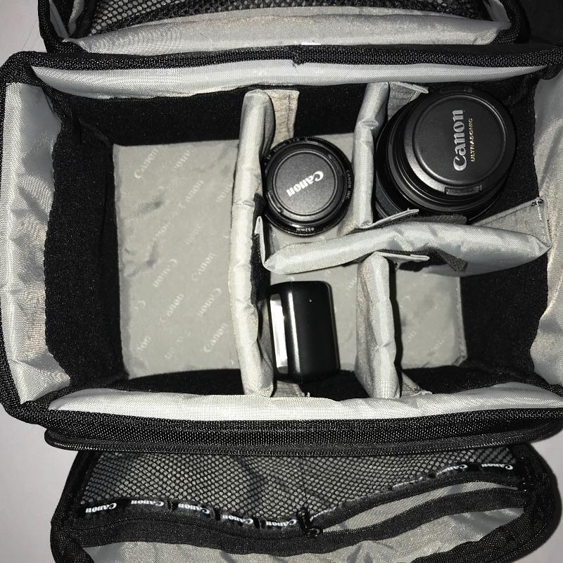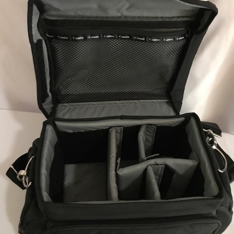 This bag looks like it has barely been used. Plenty of storage for your camera and accessories without lots of bulk. Even has a strap to hold your tripod and plastic traction underneath. Keep your costly electronic safe! Also includes two like new Canon lenses:one 100mm and one 50mm as well as a Canon flash. 16.5" x 9" deep x 10" tall. Shipping available.