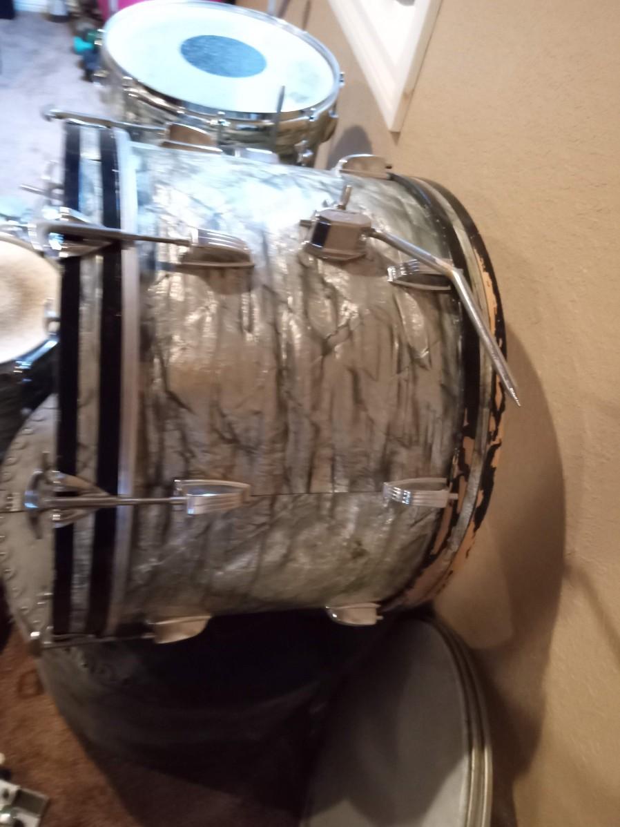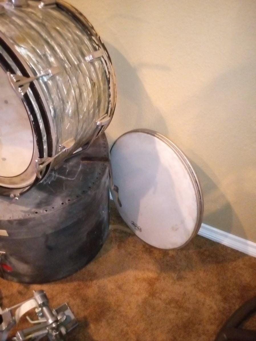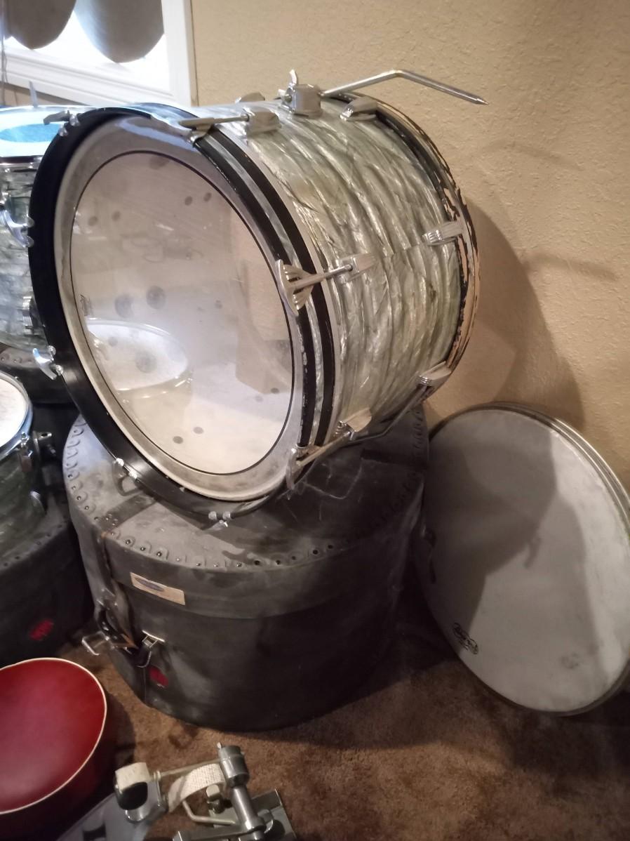 EACH PIECE HAS IT'S OWN STORAGE CONTAINER. THE BASS DRUM HAS SOME PAINT LOSS ALONG THE BACK RIM