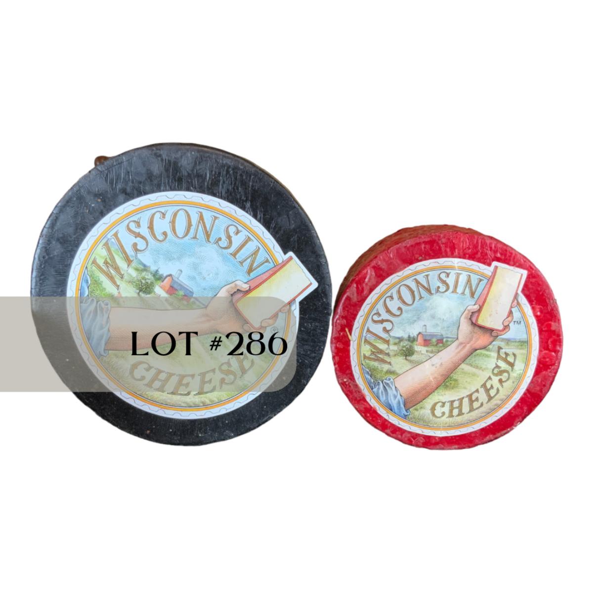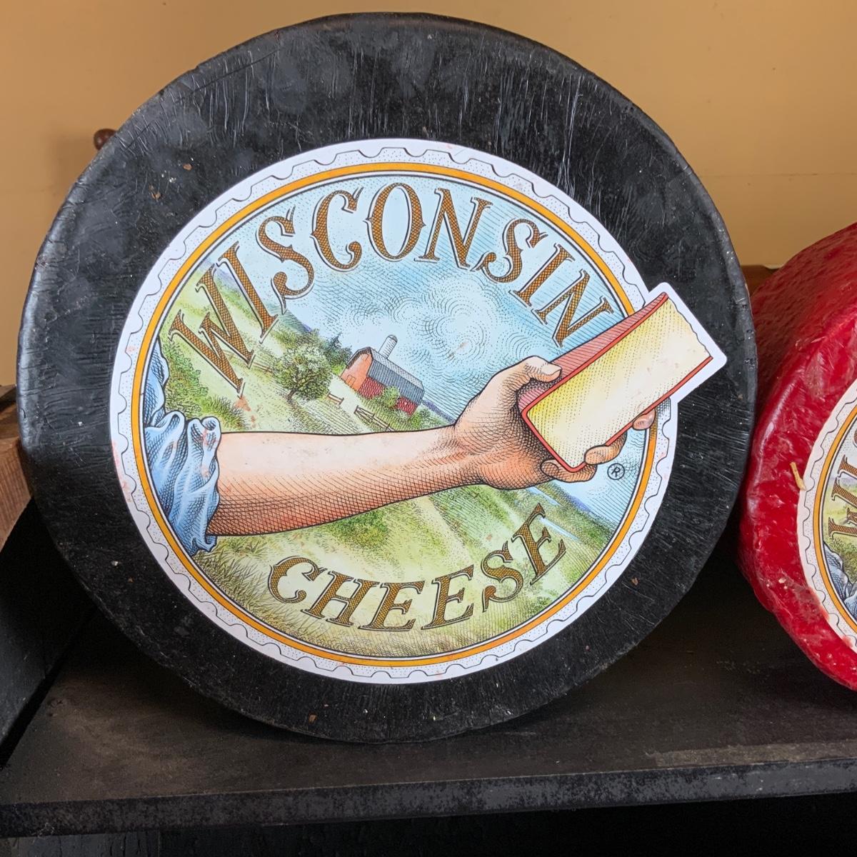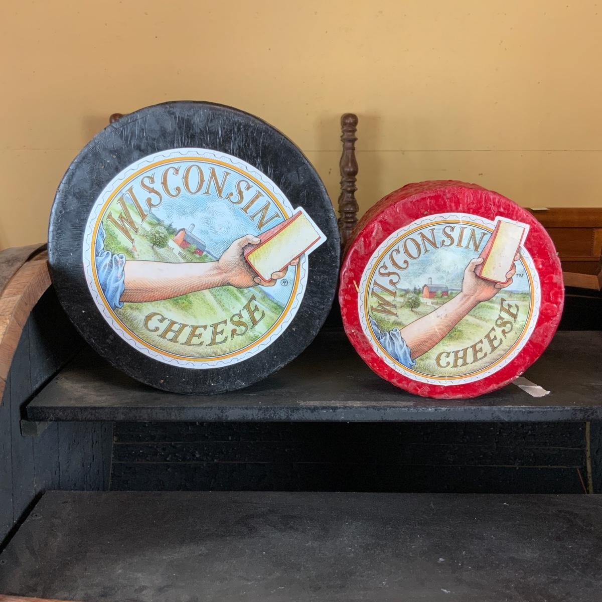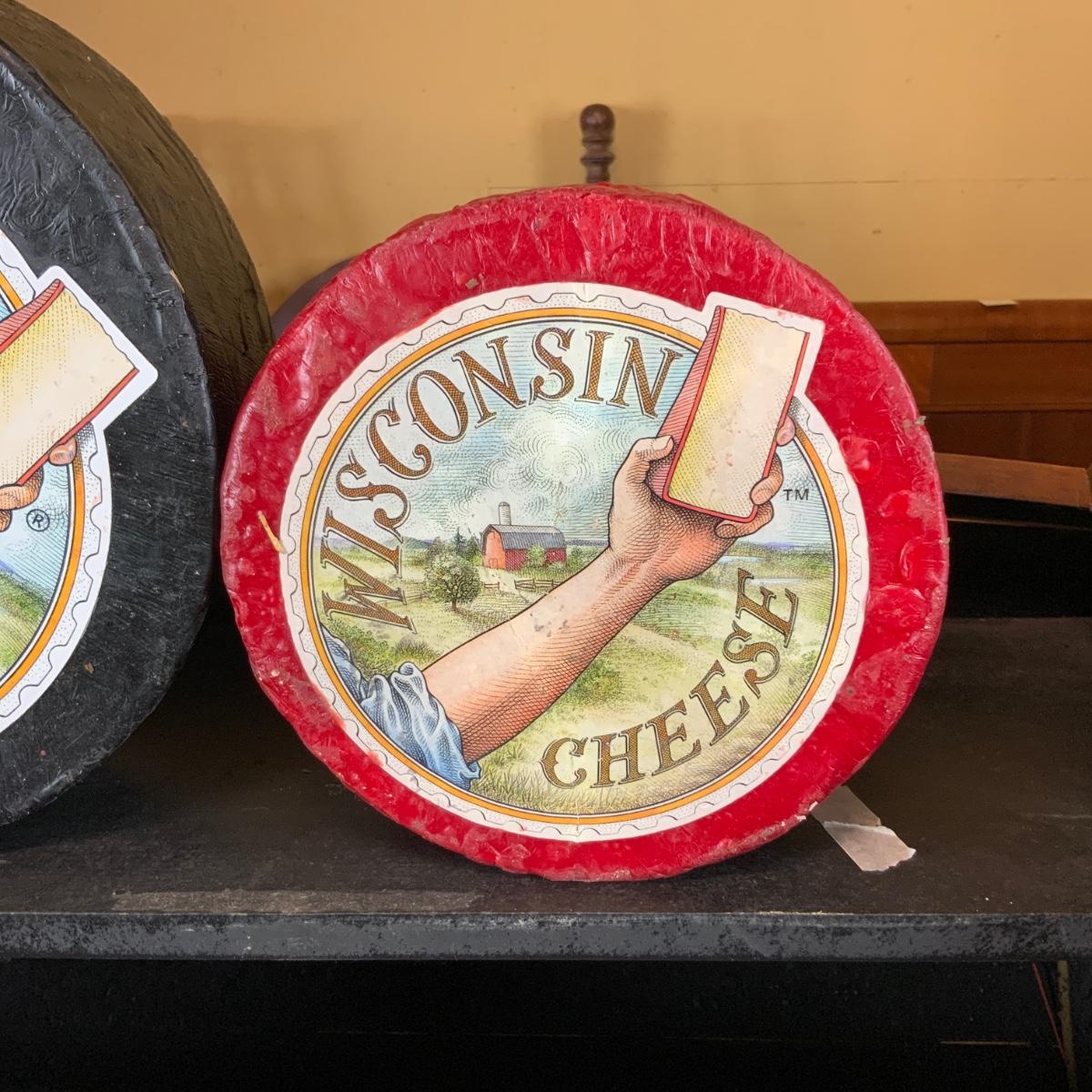 Two Wisconsin cheese factices. Wrapped in wax, just like the real thing. Front and back are identical. //::\\ Please see photos for details and condition. No attempt has been made to hide any imperfections. All items listed in this auction are warehouse items, and need to be cleaned. A majority of the items need restoration as well. All items are sold AS IS and WITHOUT GUARANTEE. If you are uncertain about an item, DO NOT BID. Due to the nature of this online auction in-person inspection is HIGHLY recommended. All Sales are FINAL. Pick Up Times are FIRM. Please confirm with your own schedule that you can pick up in the scheduled times listed in the Terms and Conditions. Any questions please message the auctioneer. DO NOT Contact The Harp Gallery.