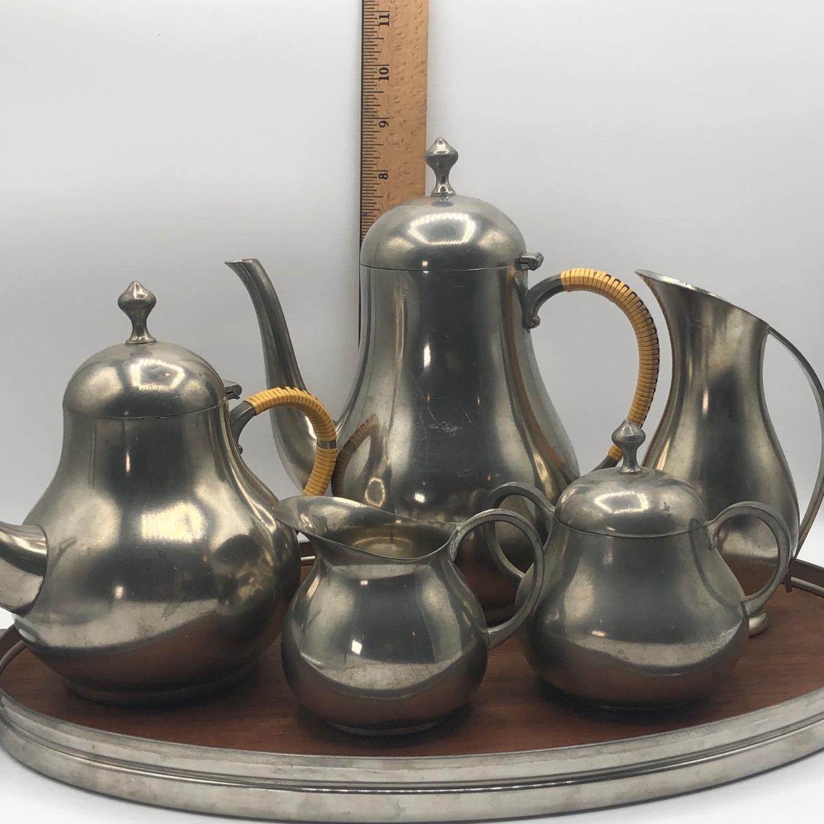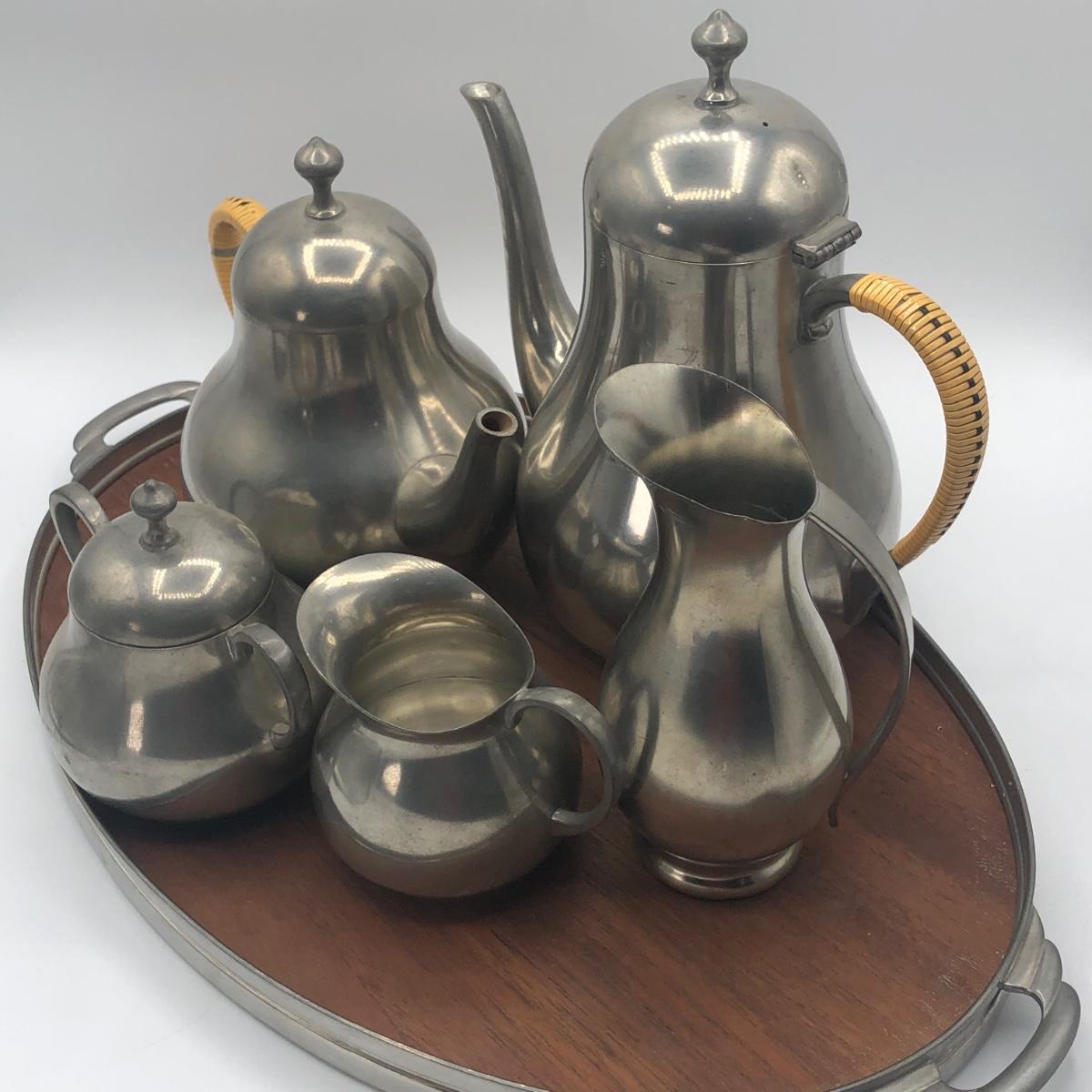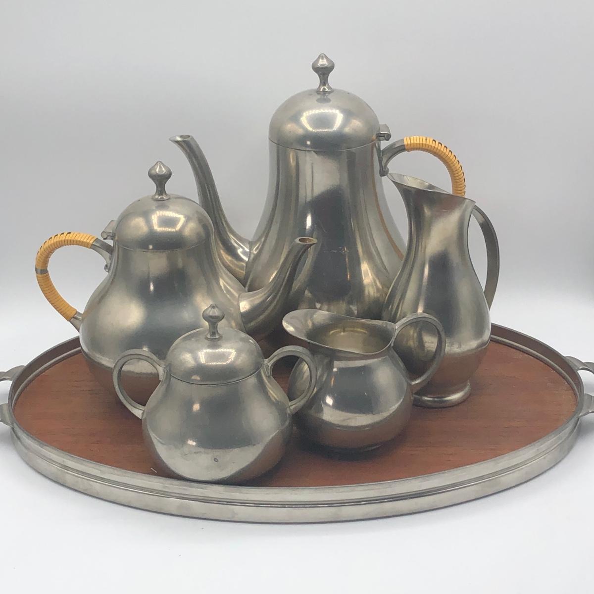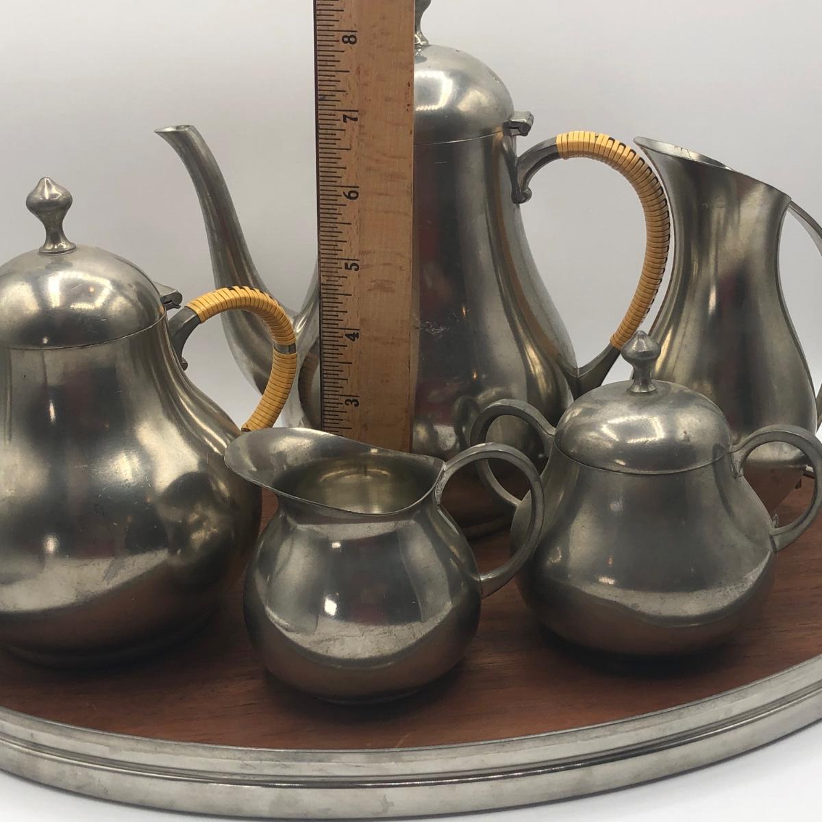 LOT 286L: Royal Holland Pewter Coffee / Tea Serving Set w/ Wood Top Tray