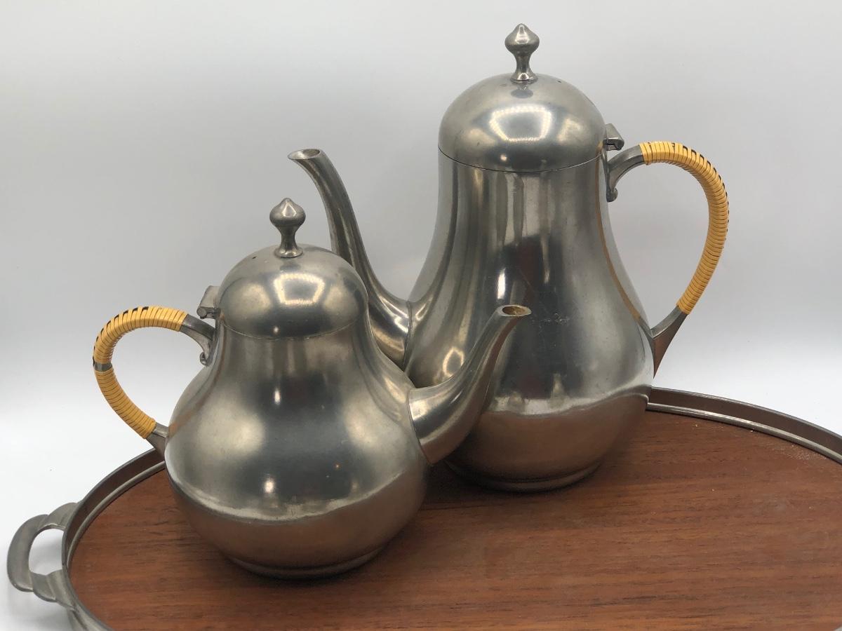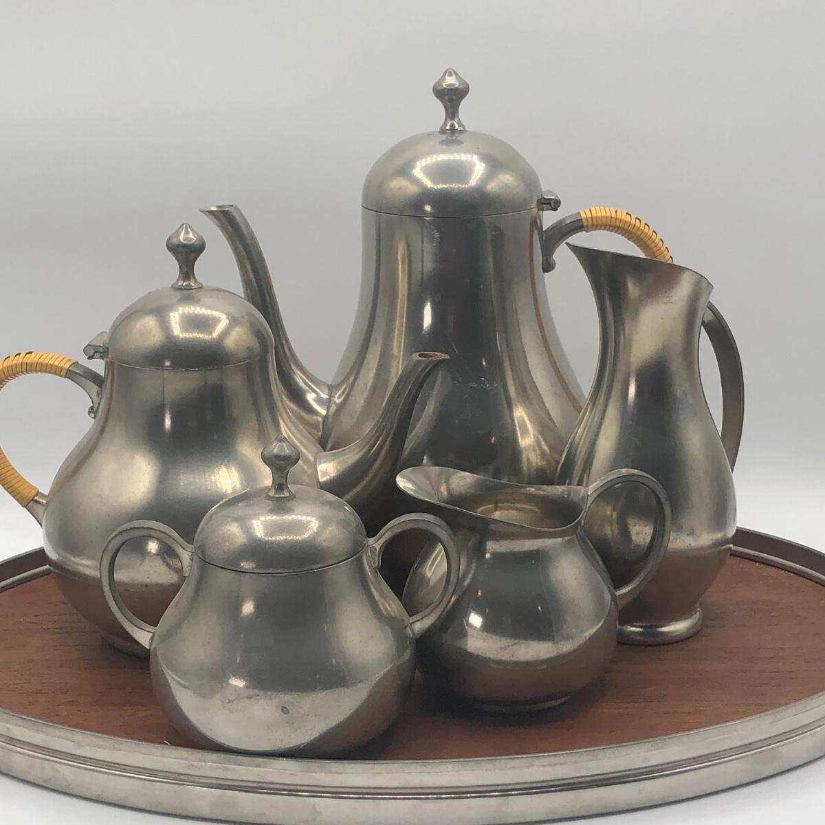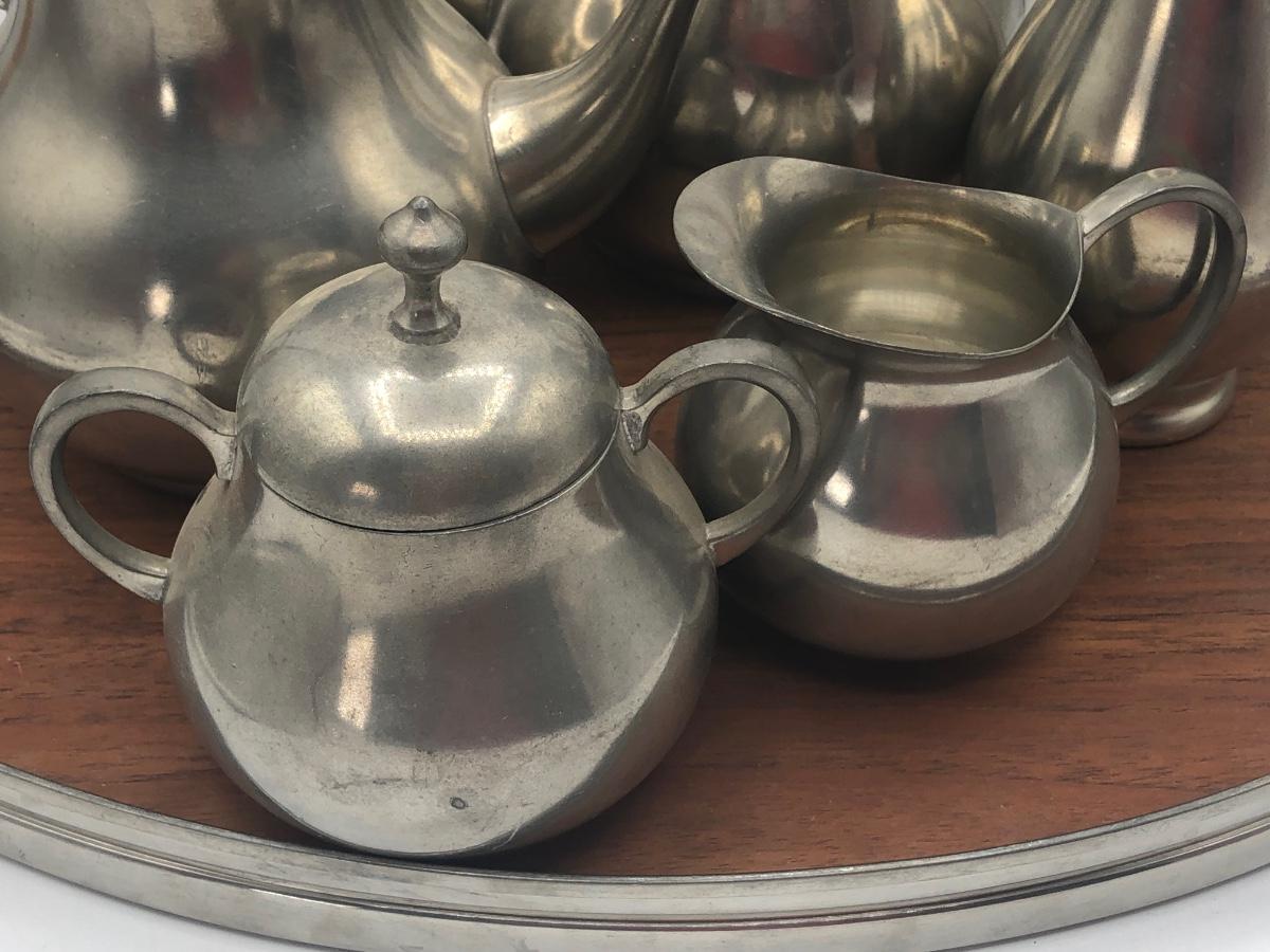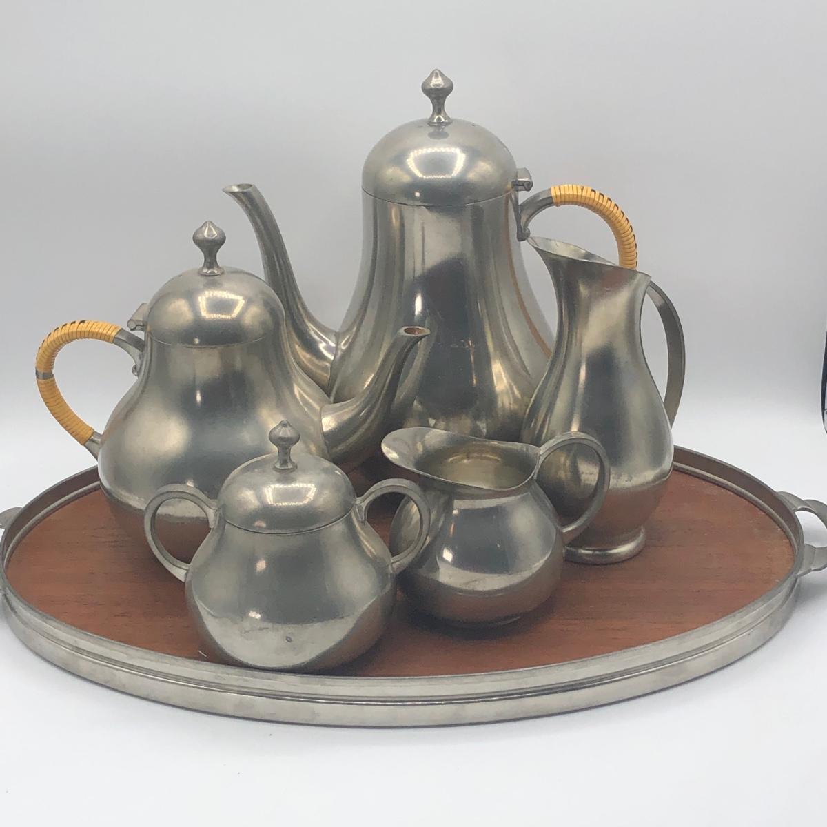 LOT 286L: Royal Holland Pewter Coffee / Tea Serving Set w/ Wood Top Tray