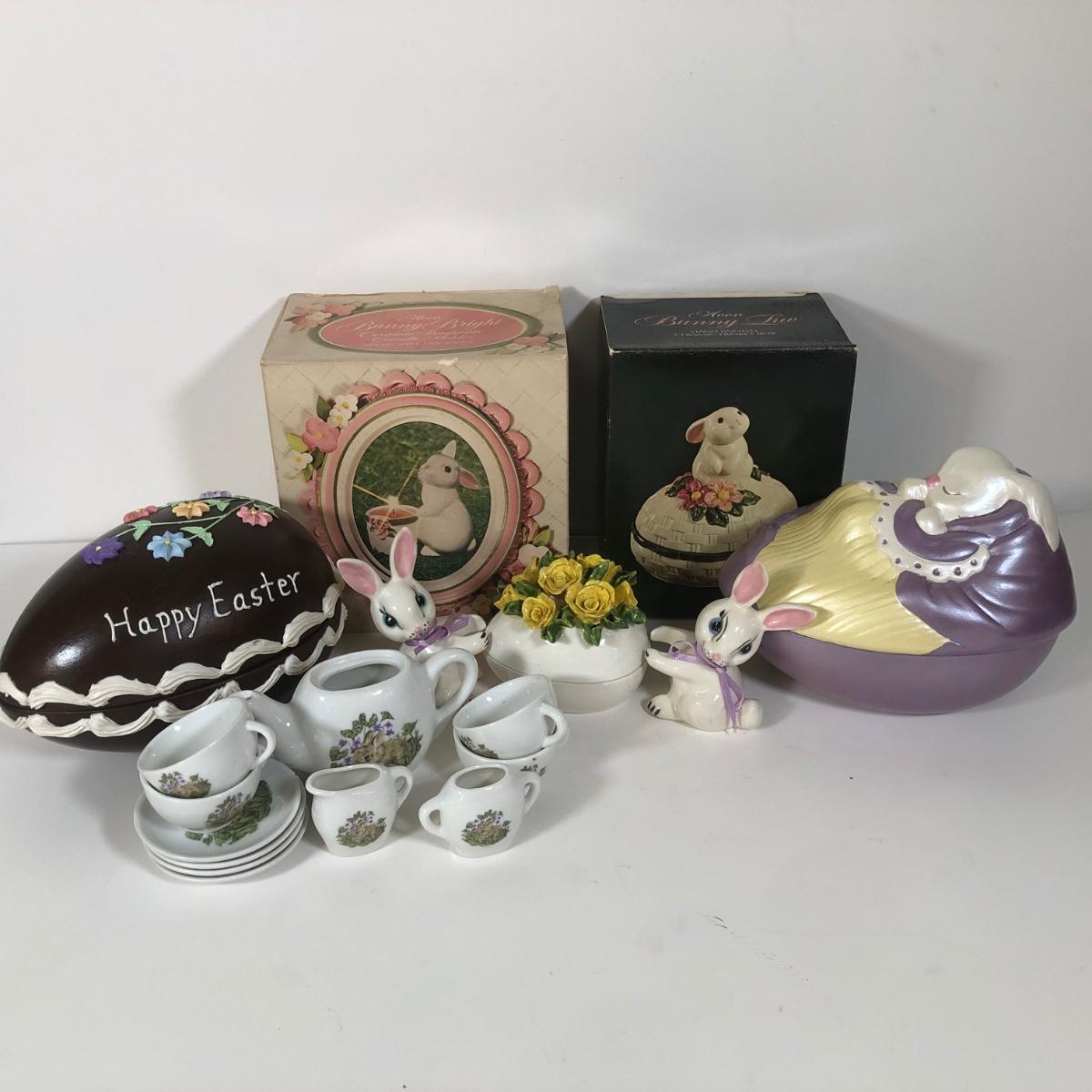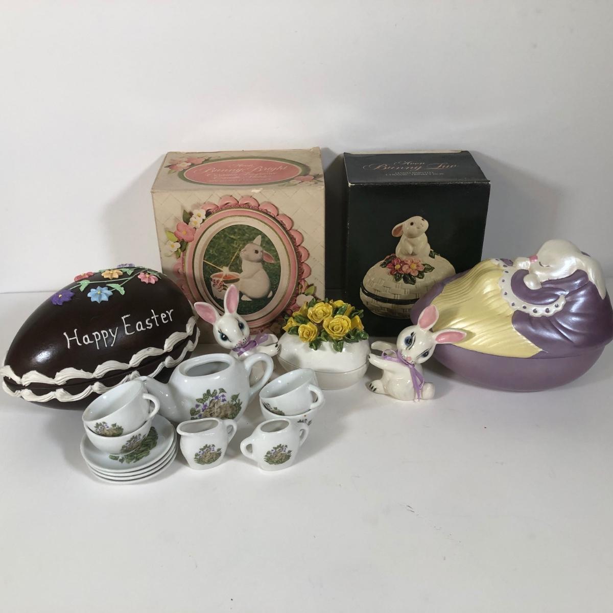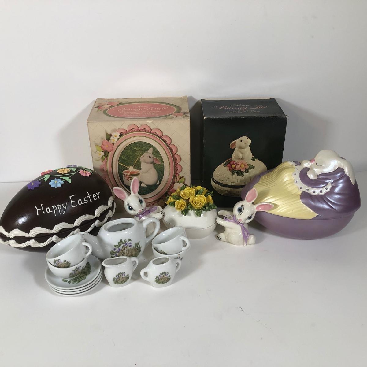 LOT 286L: Vintage Easter Collection - Mini Tea Set, Lidded Eggs, Avon Bunny Luv Trinket Dish & More