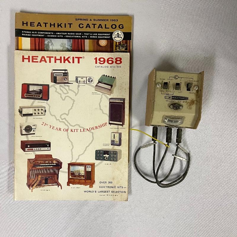 Heathkit regulated power supply, audio generator, transistor tester, and more. The first is a model IP-28 power supply. The second is a model IG-18 sine-square audio generator. The third is a model SP-17A power supply. Two Heathkit catalogs are included, as is a model IT-27 transistor tester.