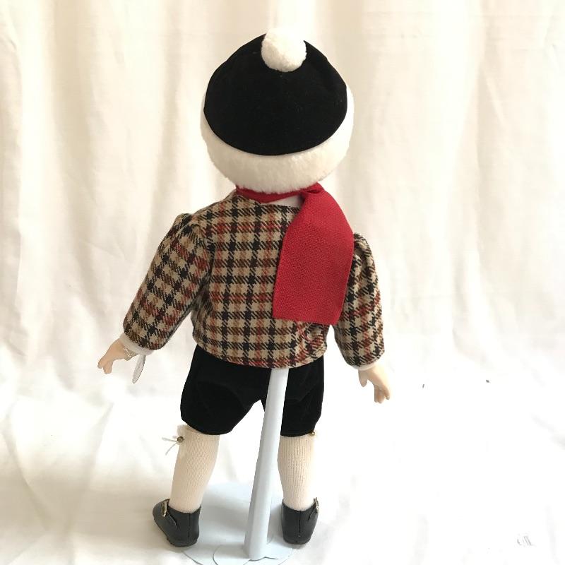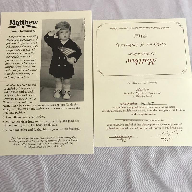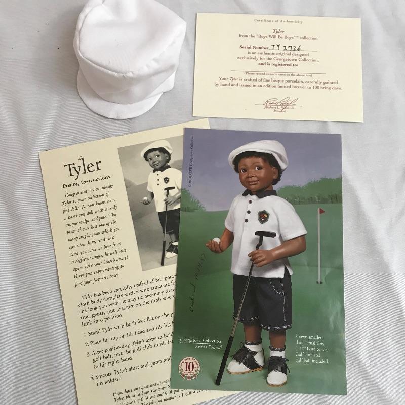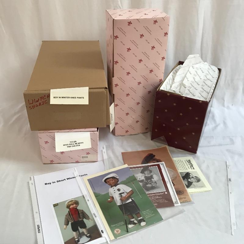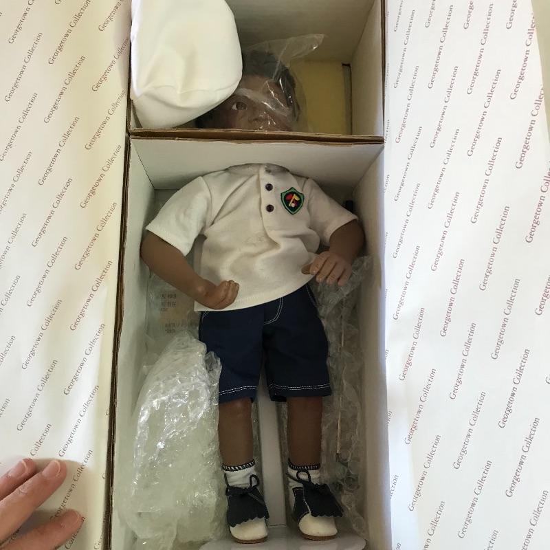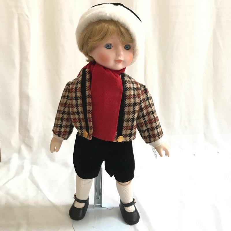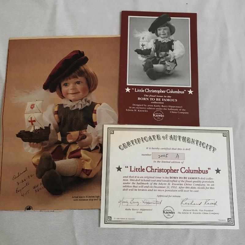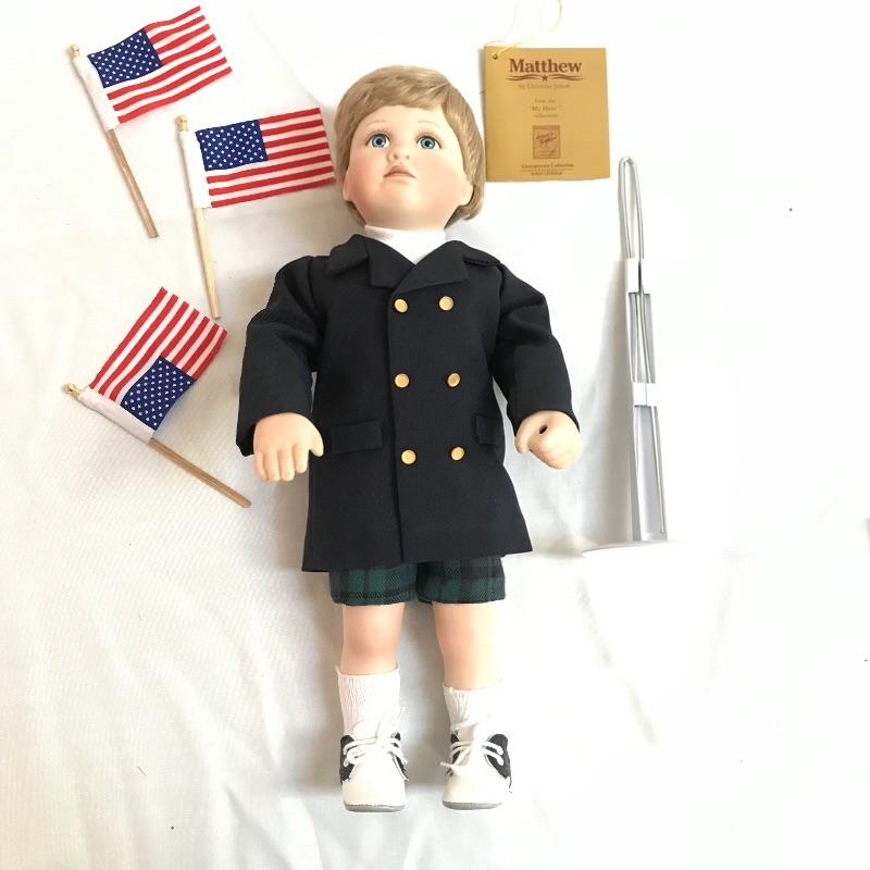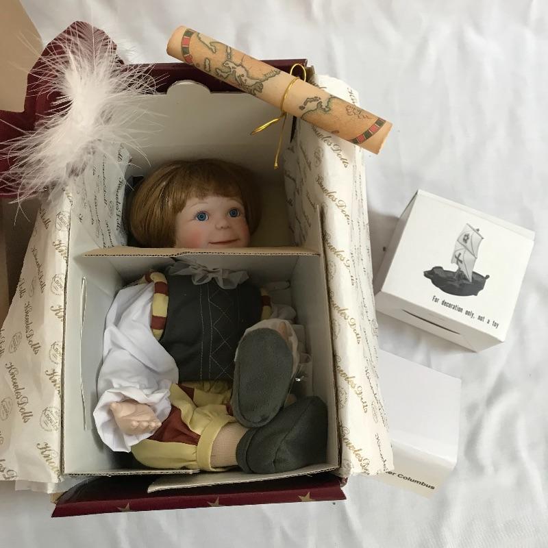 Matthew is a patriotic doll from the “My Hero” Collection by Christina Joniak. He has a double-breasted jacket and three American flags that appeared to be glued to their poles, one of which is upside down. Matthew is complete with stand and certificate. Tyler is up next with his hat and club in tow. The ball found with Tyler doesn’t appear to be original and made of a puddy like substance. Tyler also has his stand and certificate. Sailing the ocean blue is little Christopher Columbus with a feathered hat, world map and ship. Christopher also has his certificate of authenticity, he does not appear to have a stand. Lastly is a boy doll in winter knee pants. He has a tag around his wrist stating “I am a Denton Doll”. He has no known markings to confirm and also lacks a certificate. This little boy has glass eyes and apparently has porcelain features with a cloth torso. His stand is included in lot. See photos. Shipping available.